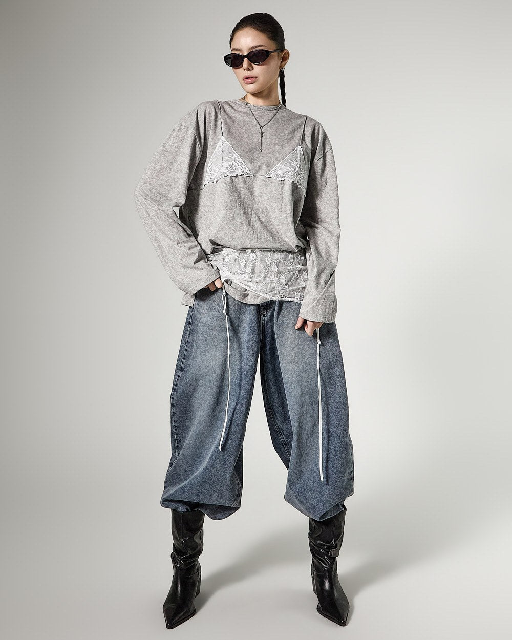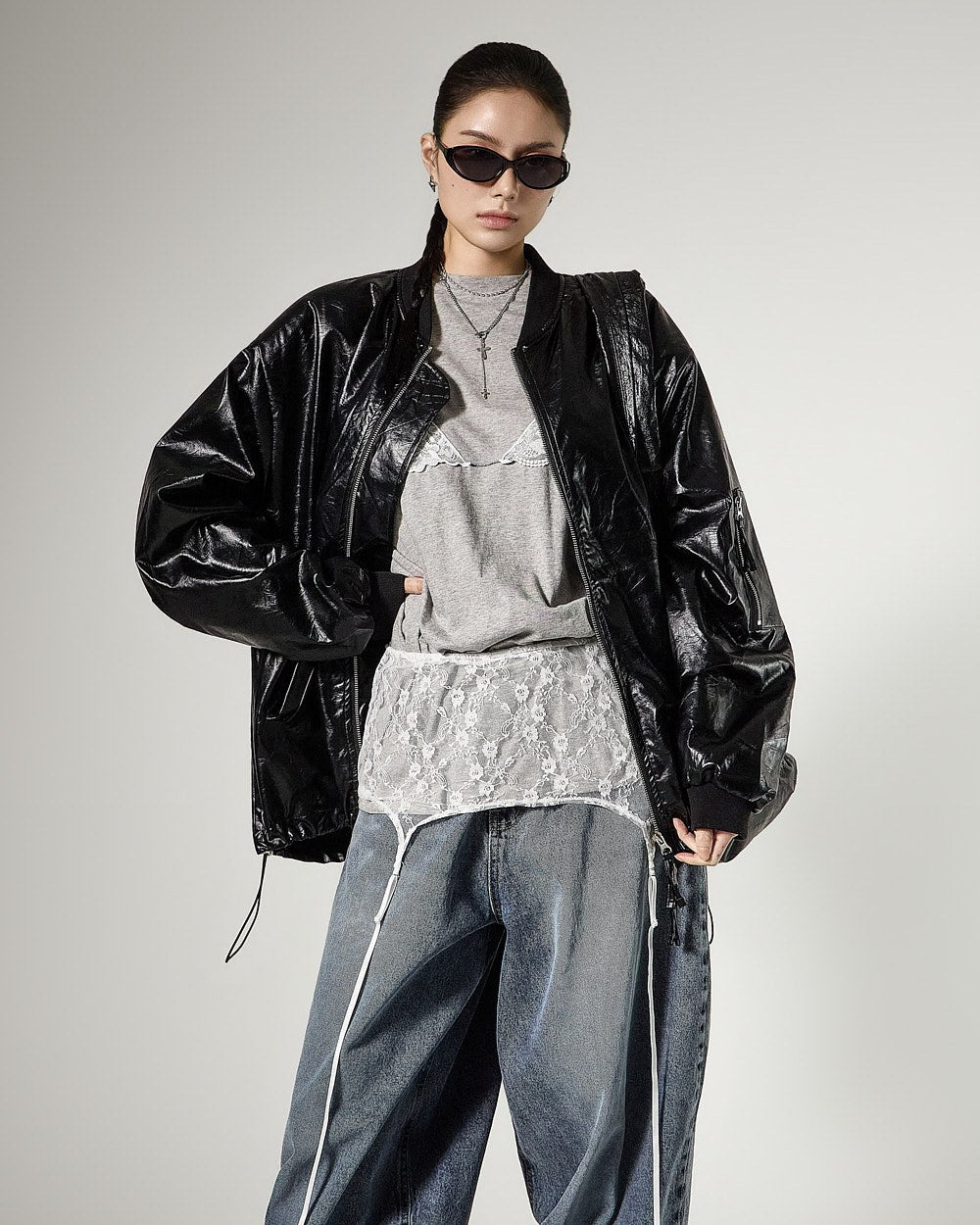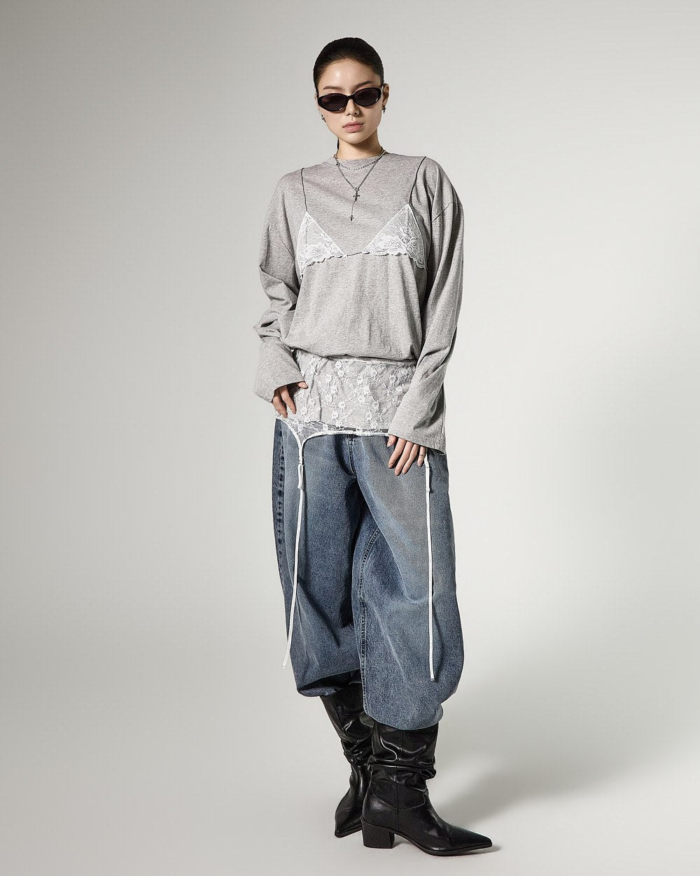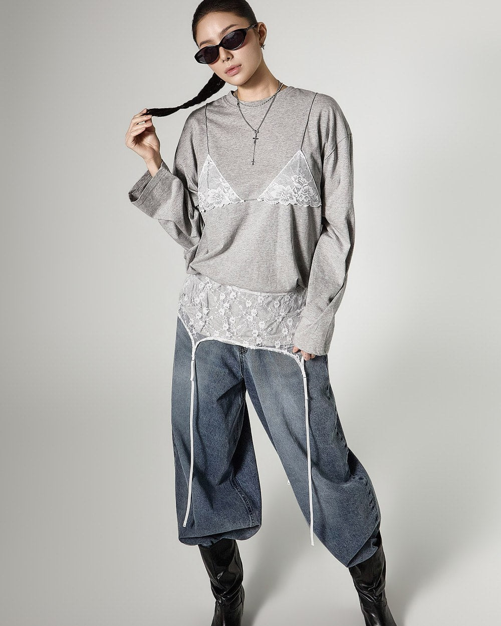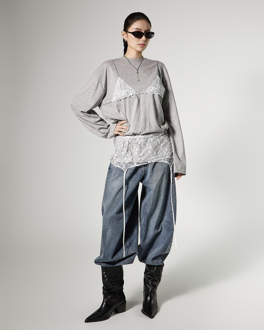 レイヤードされたレースビスチェのデザインがスタイリッシュなアクセントを加え、