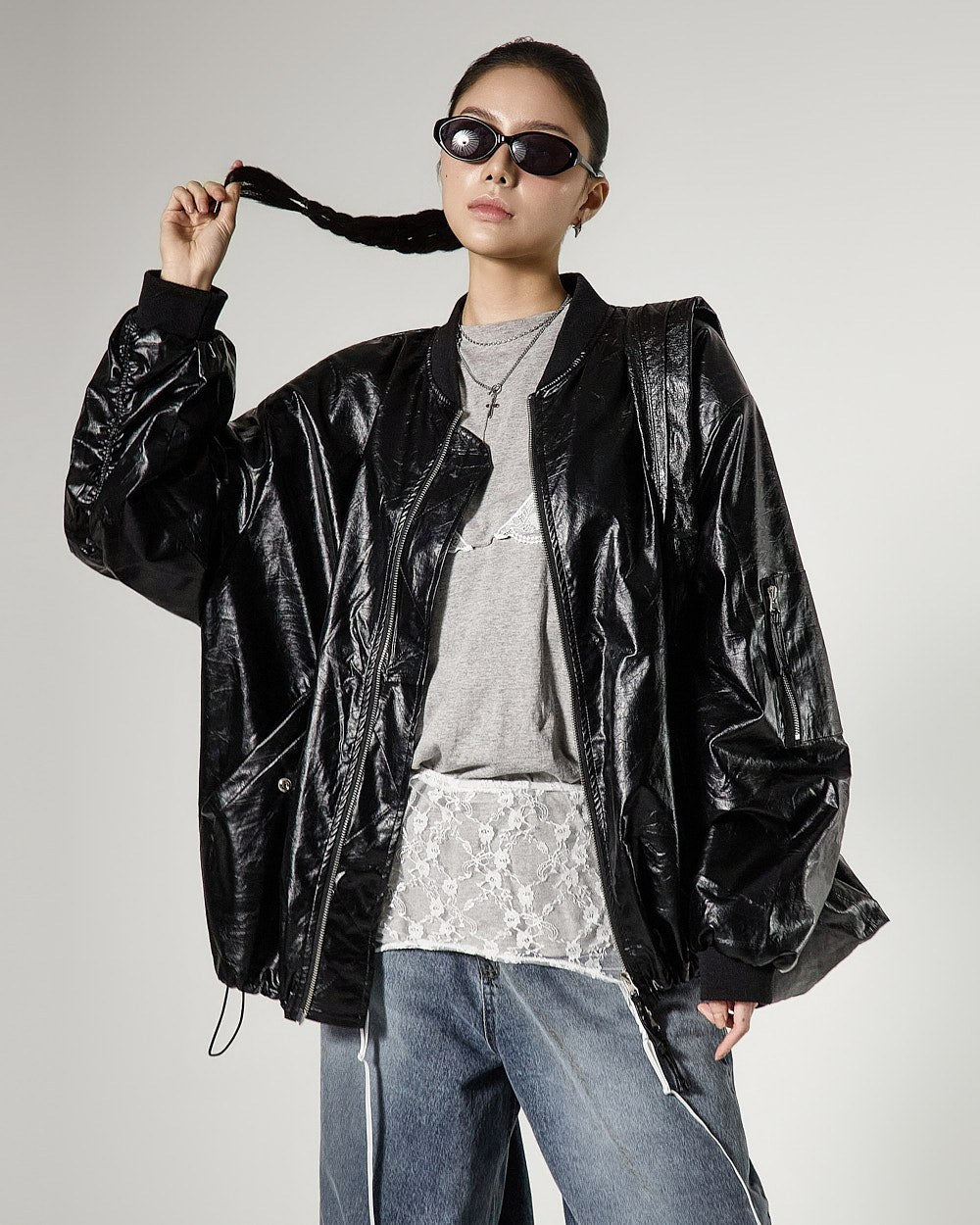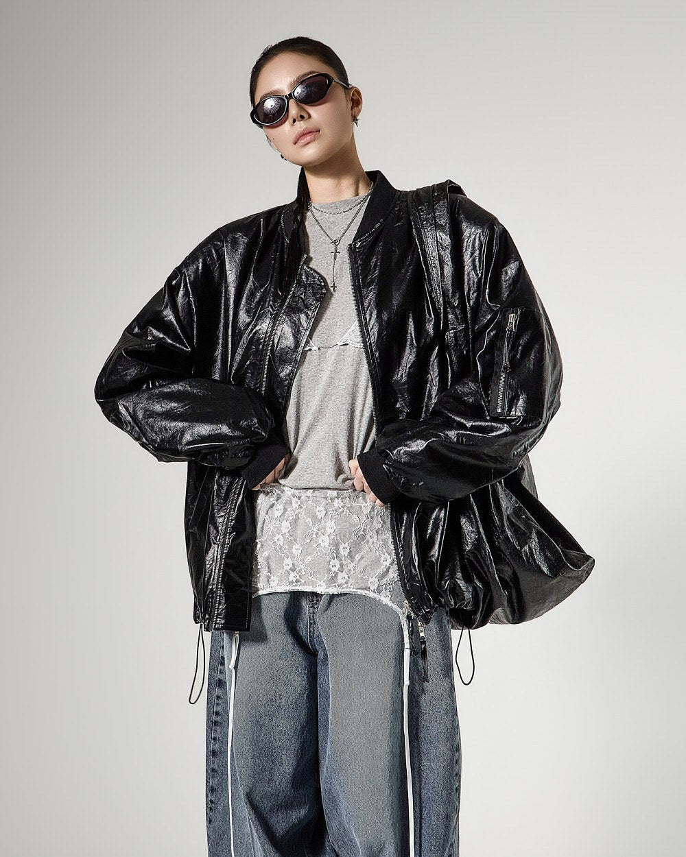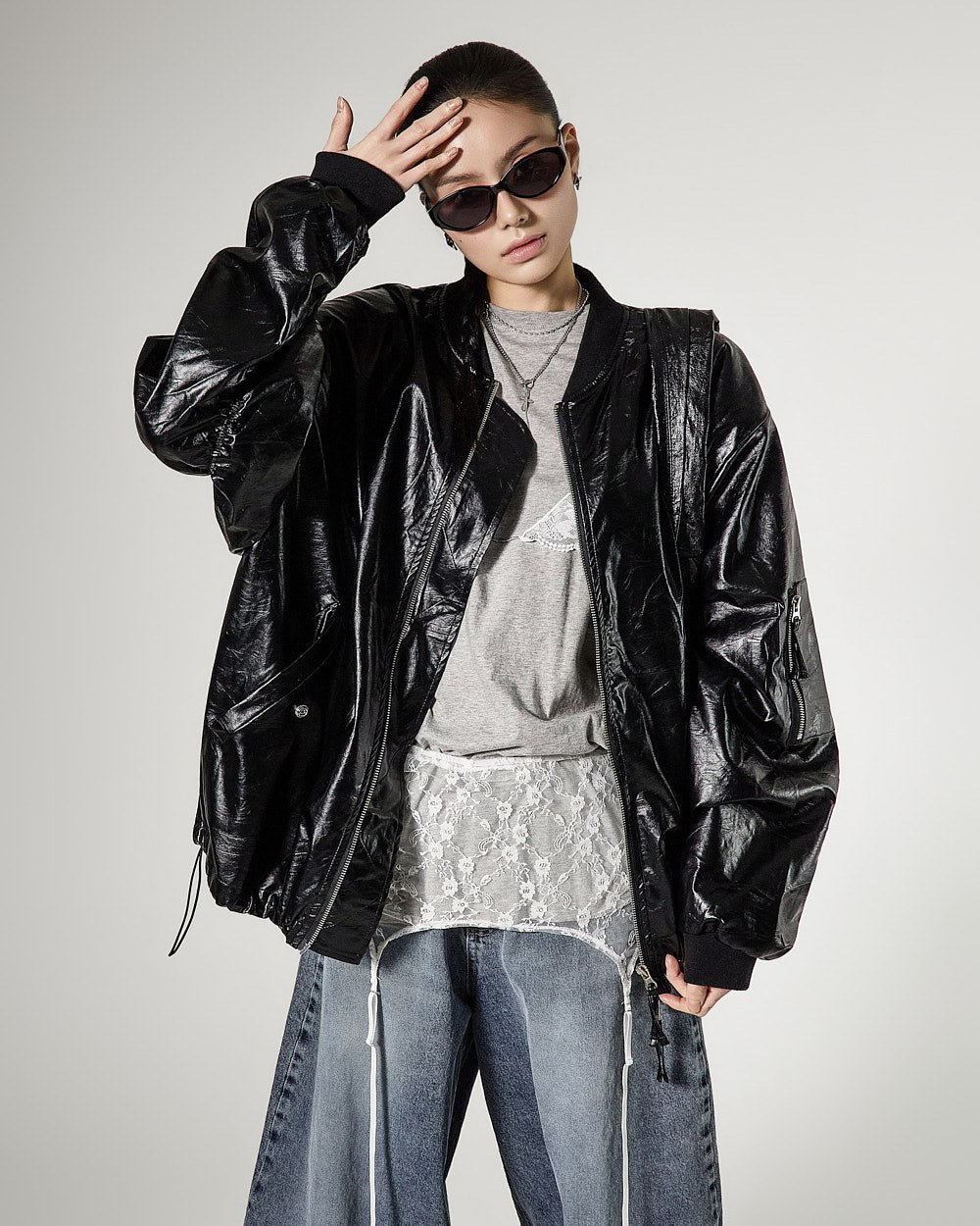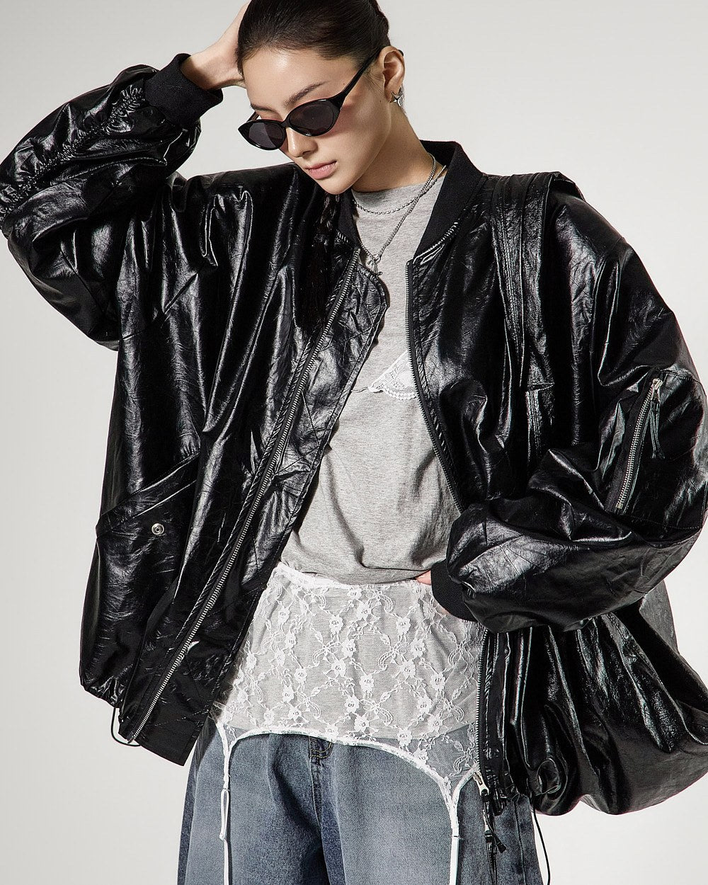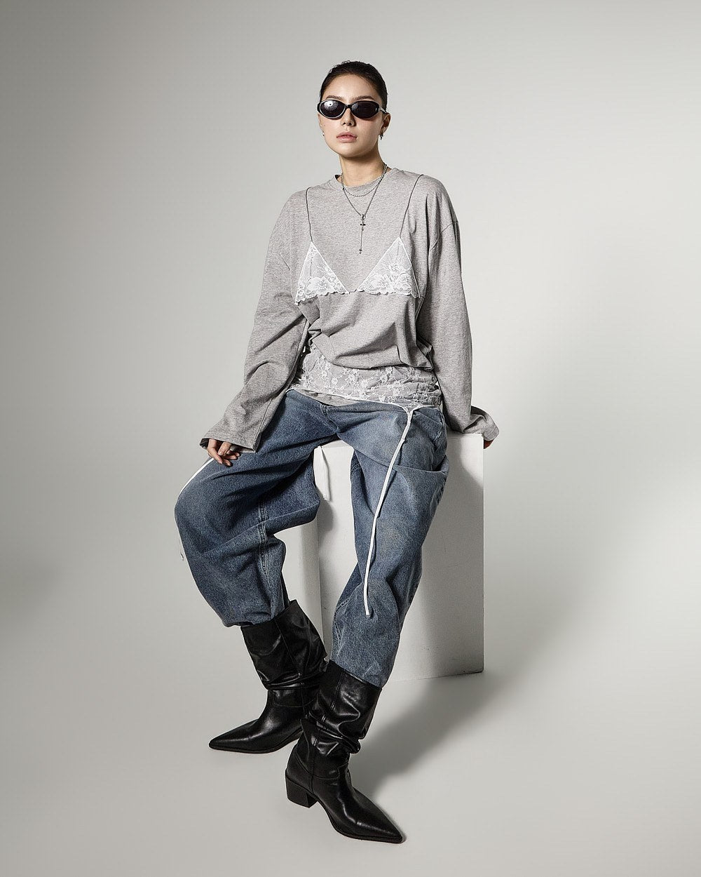 レイヤードされたレースビスチェのデザインがスタイリッシュなアクセントを加え、
