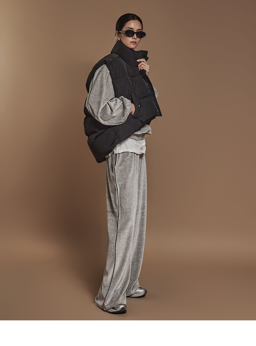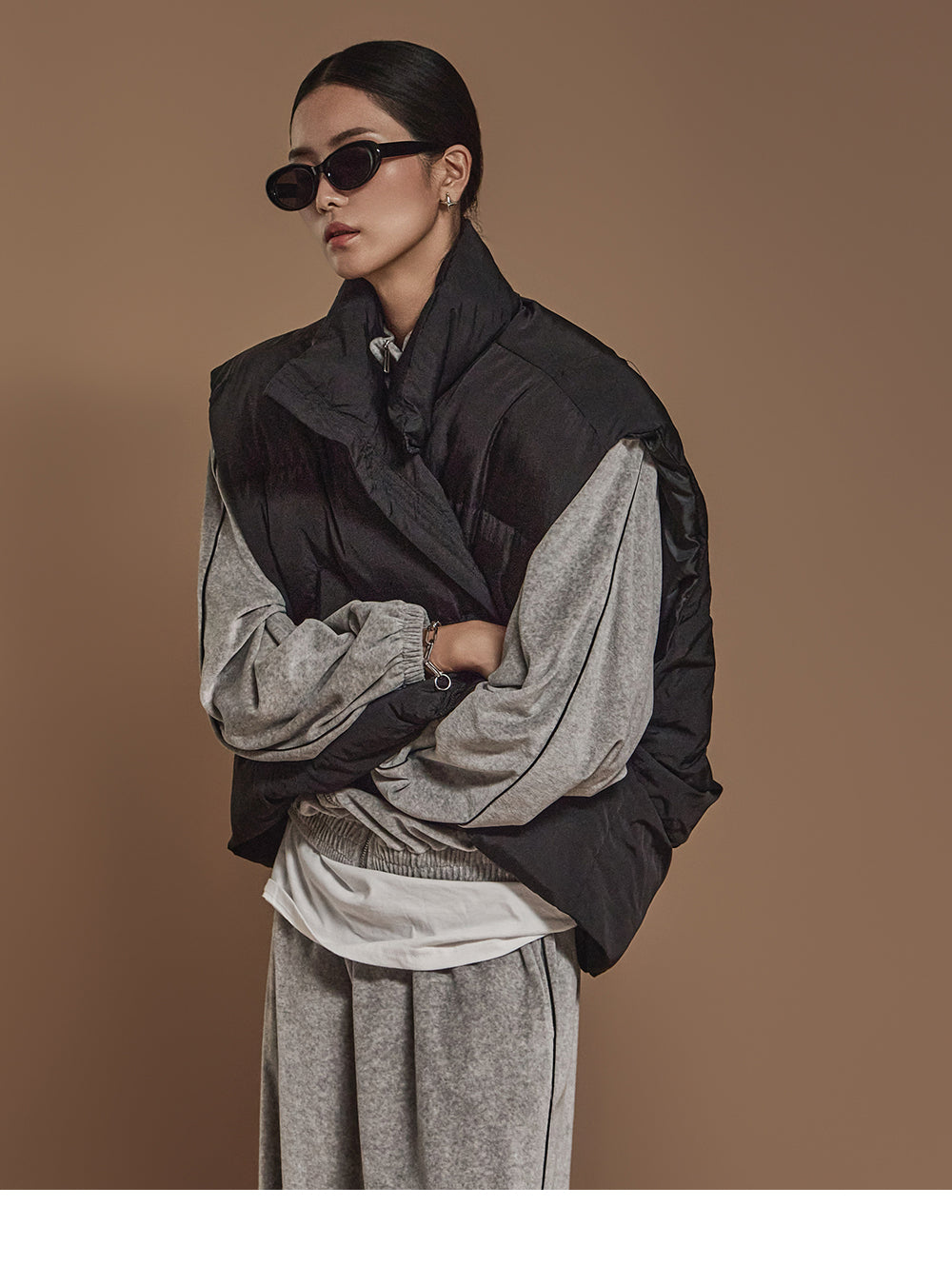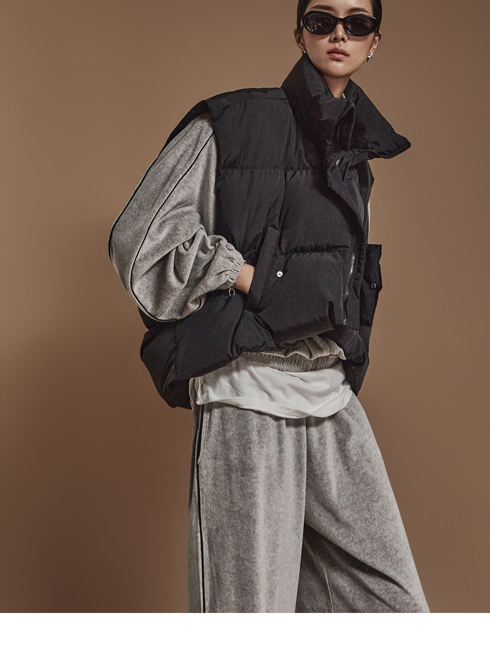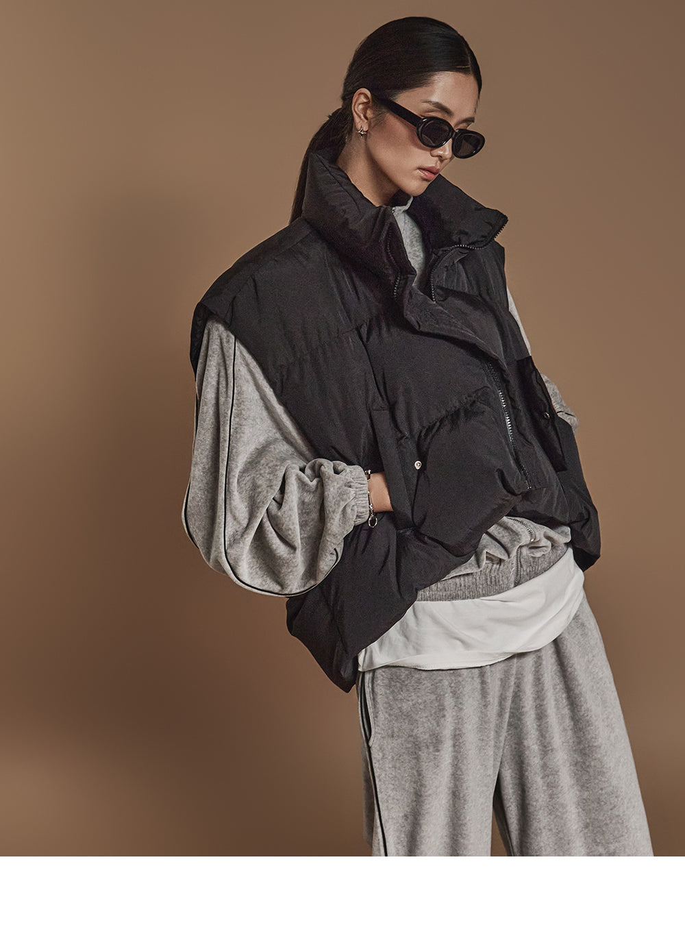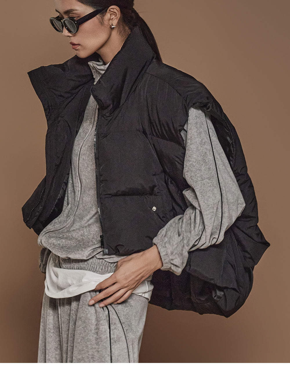 ハイネックで顔周りをシックに演出し、