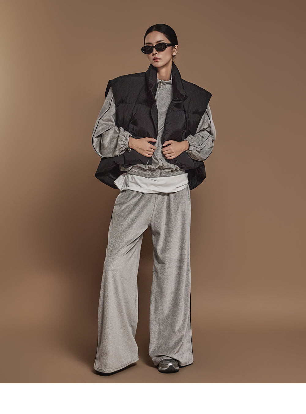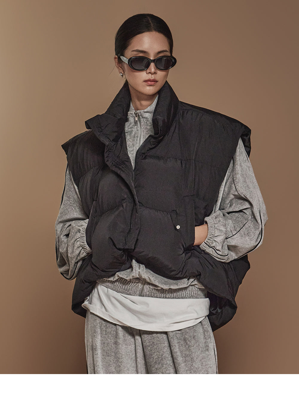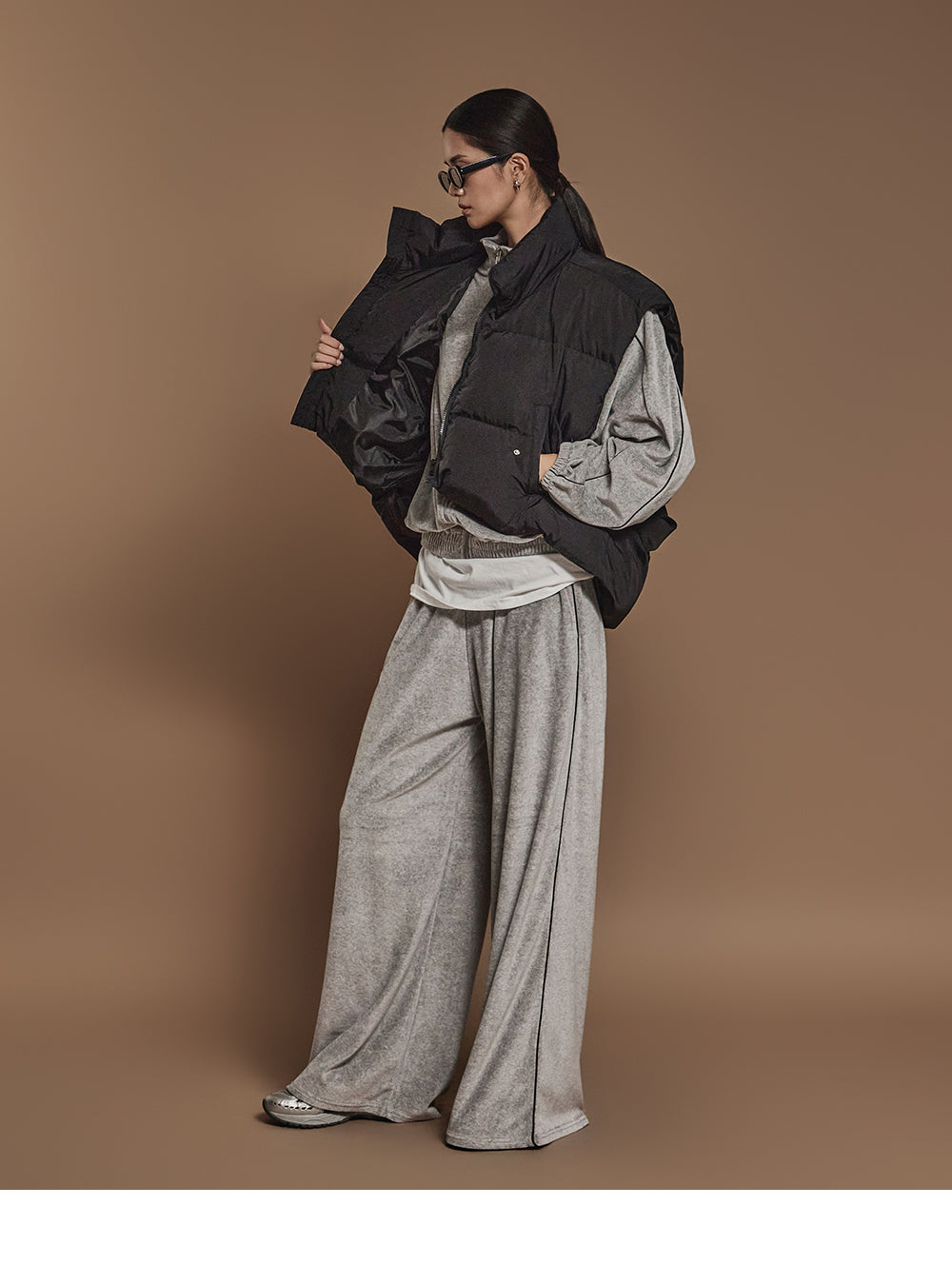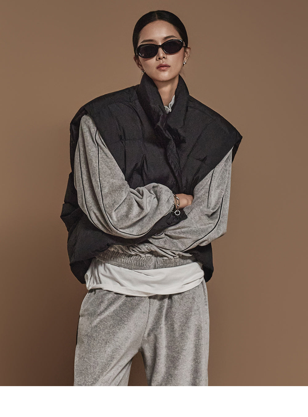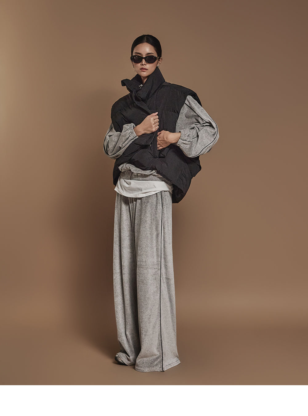 ハイネックで顔周りをシックに演出し、