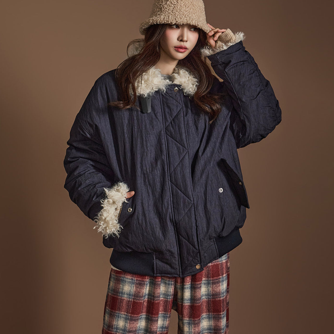 ネックラインと袖口のファーのディテールが暖かさを高め、ユニークなタッチを加えます。