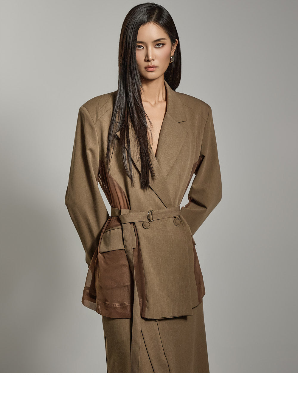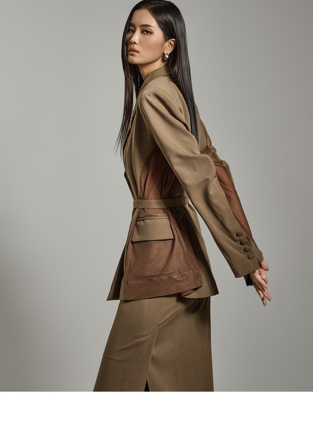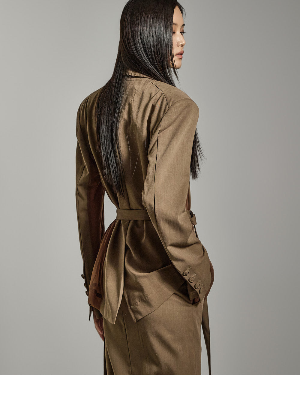 このベルト付きジャケットはモダンで洗練された印象を与えます。