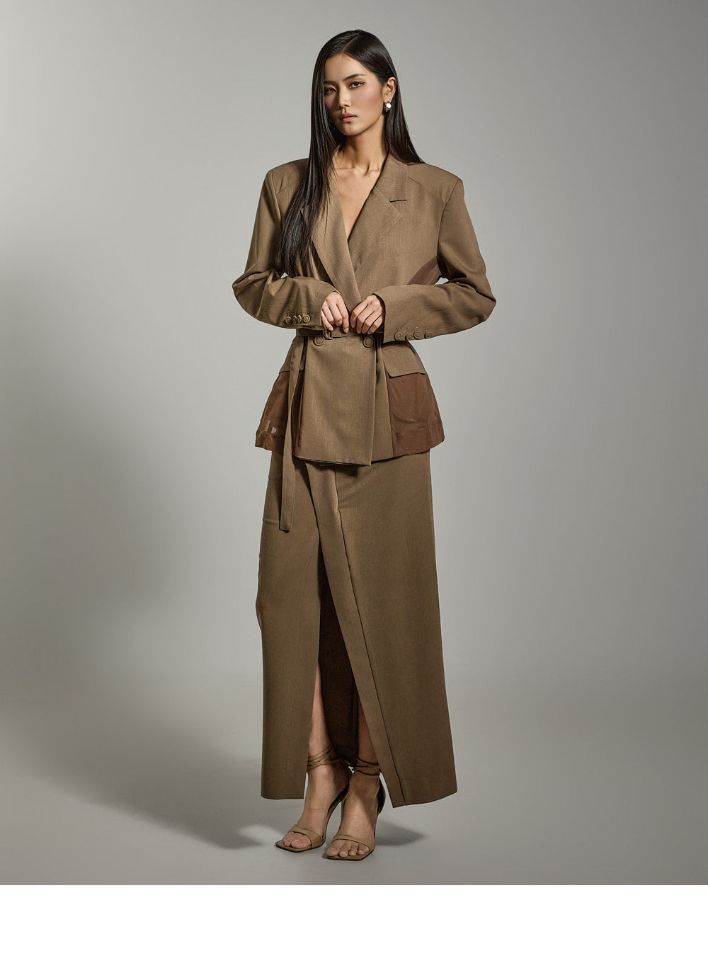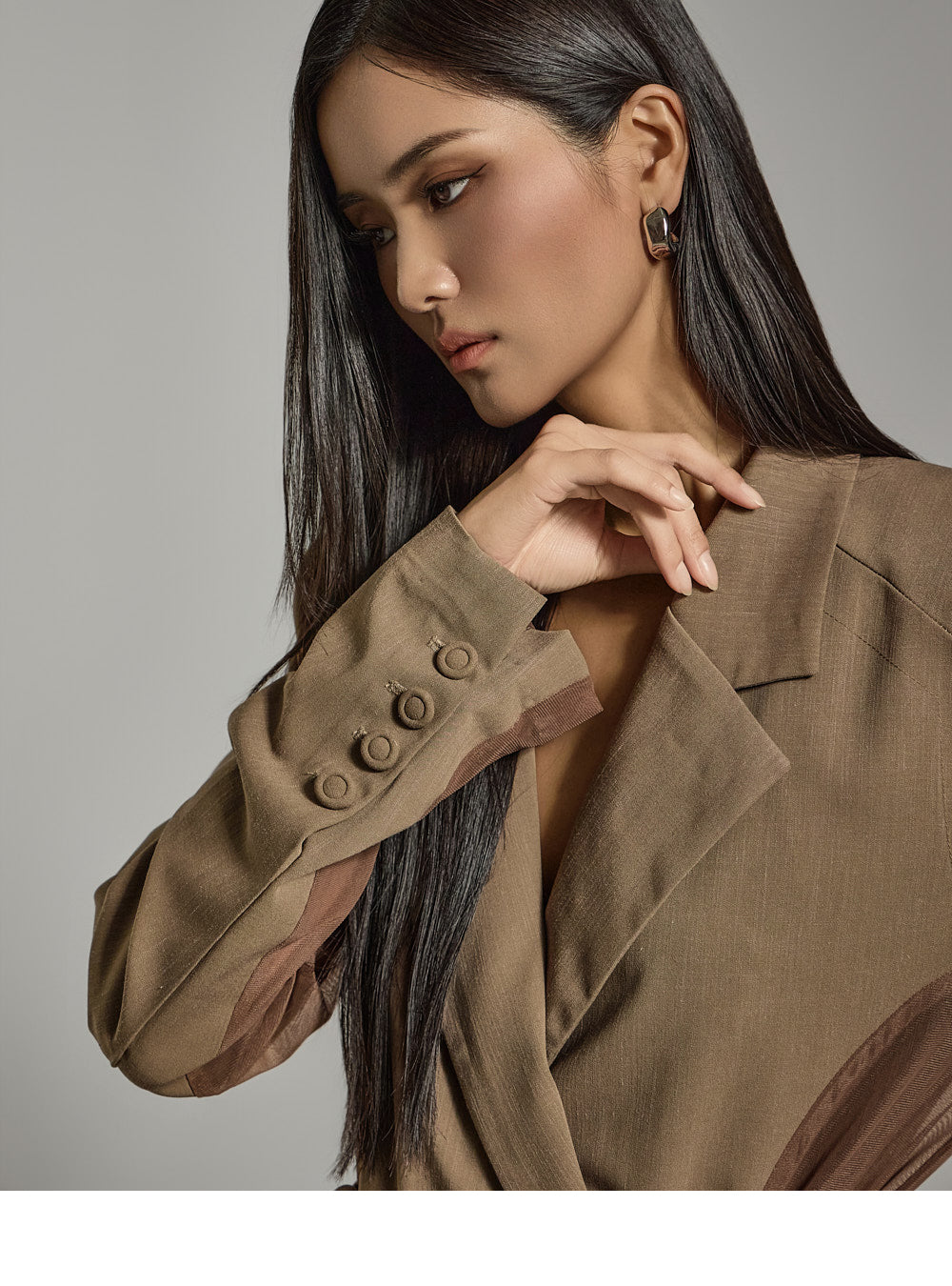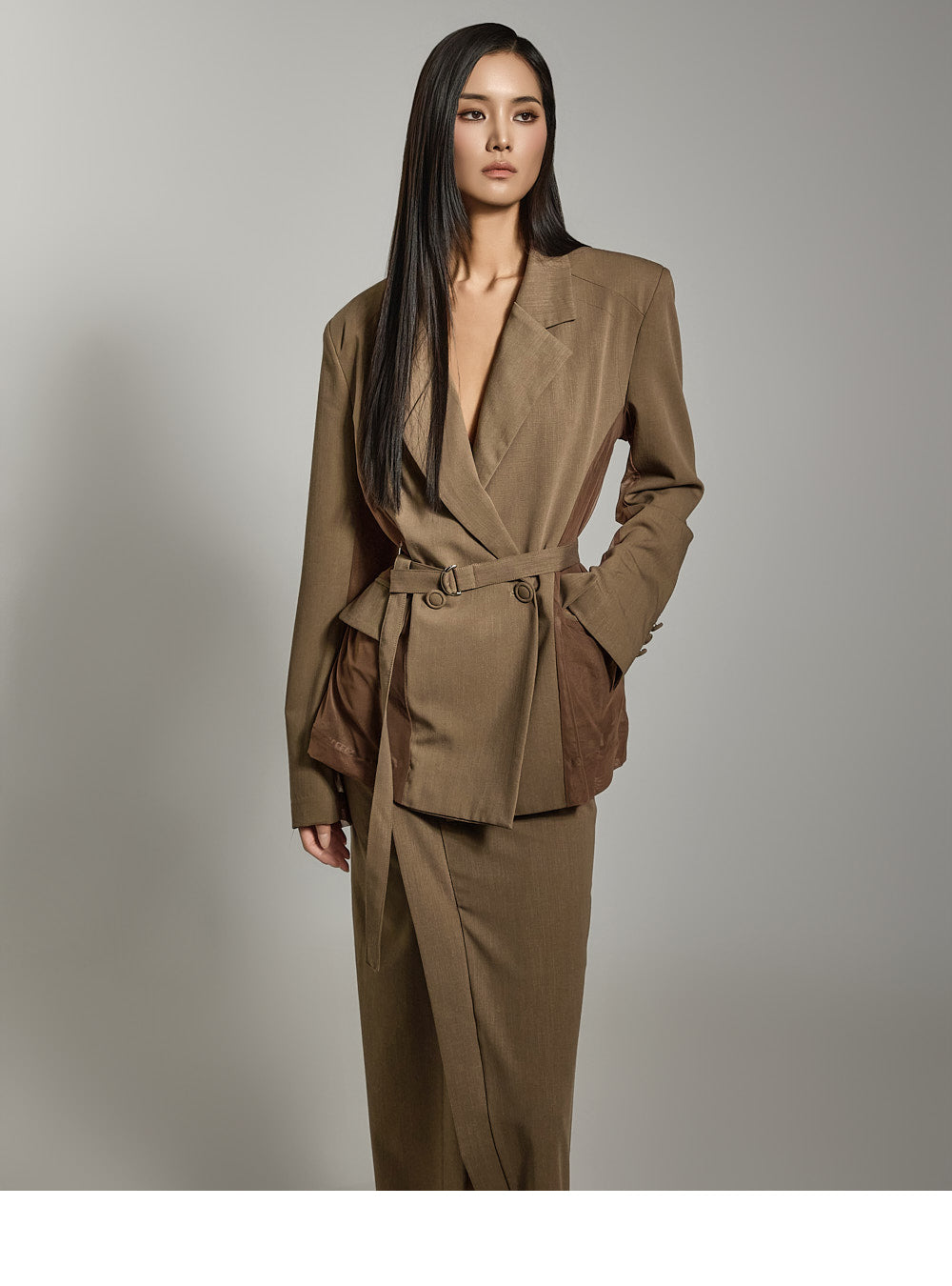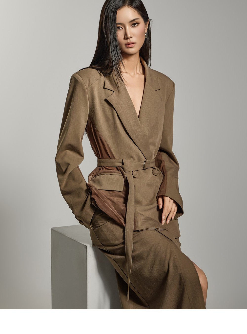 このベルト付きジャケットはモダンで洗練された印象を与えます。