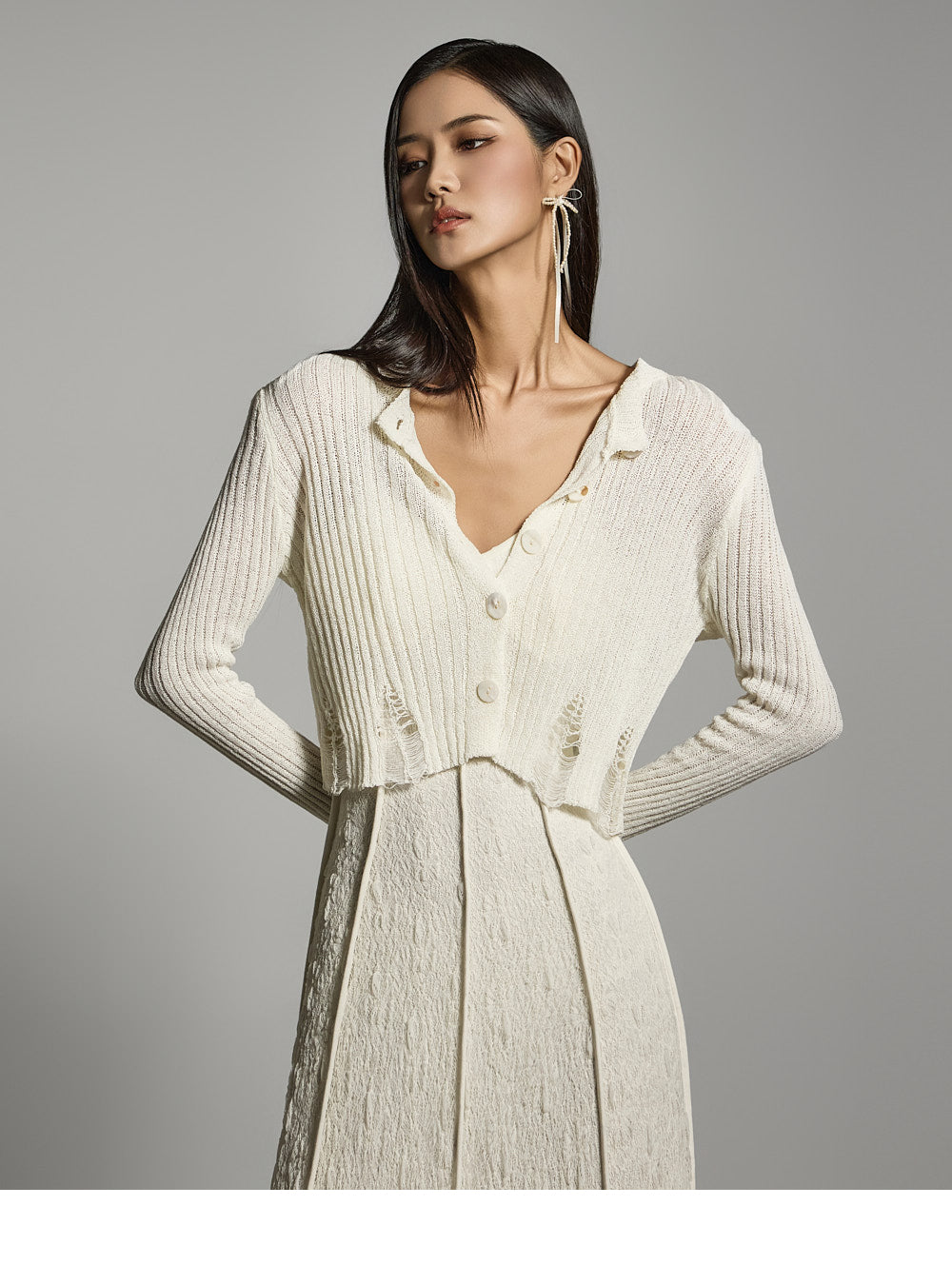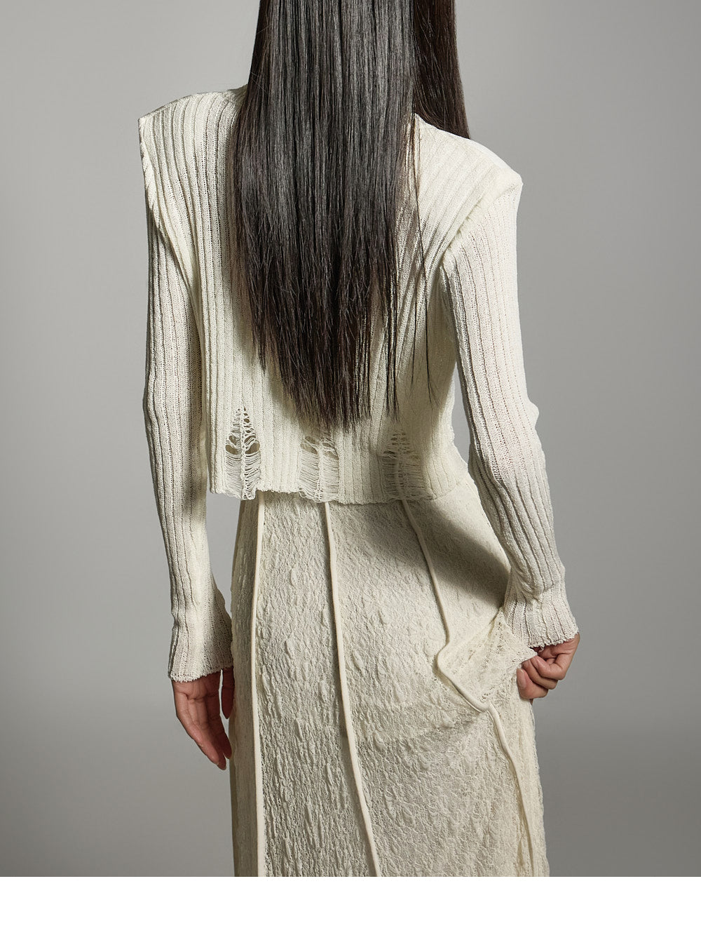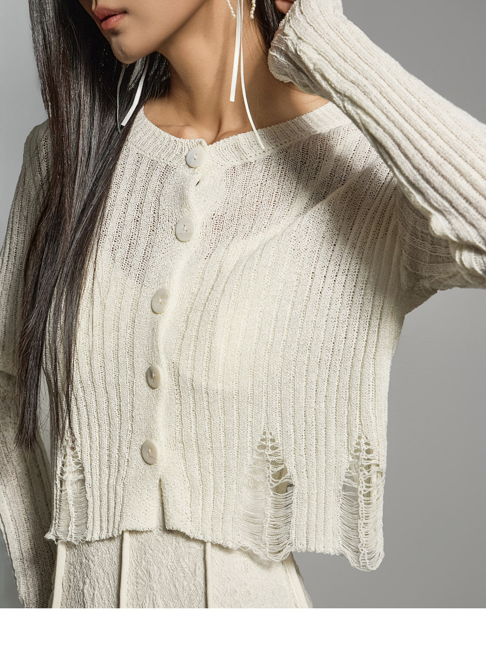 繊細なダメージ加工のディテールが全体のスタイルを引き立て、