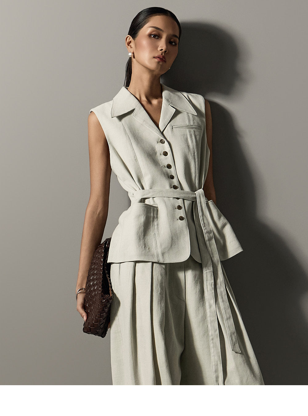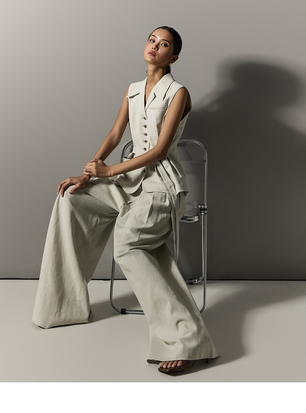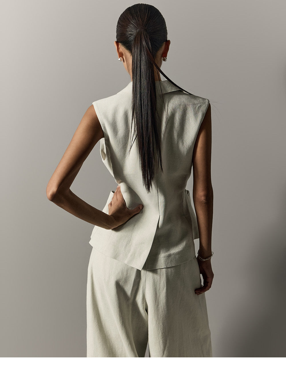 ナチュラルでリラックスした雰囲気を演出するボタンベスト。