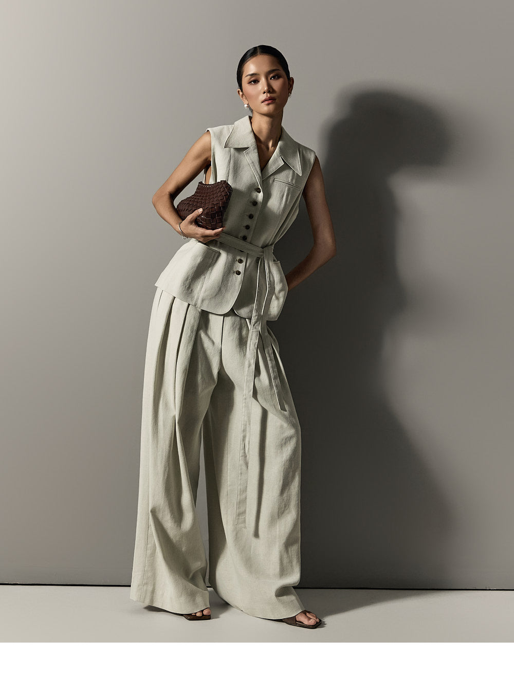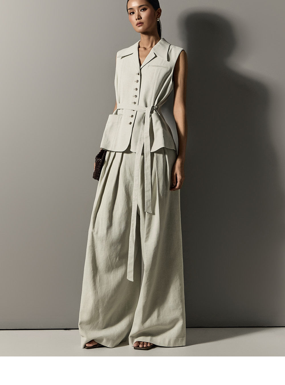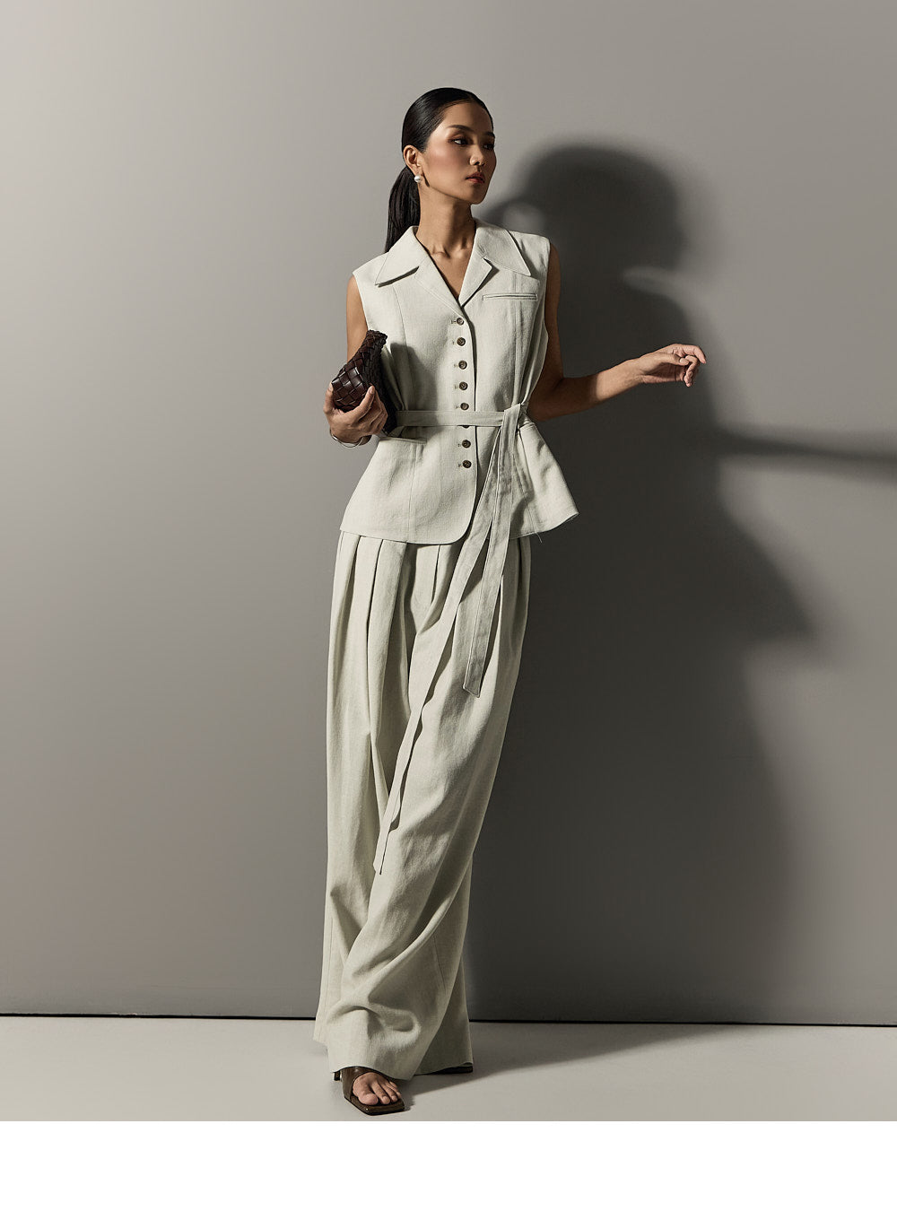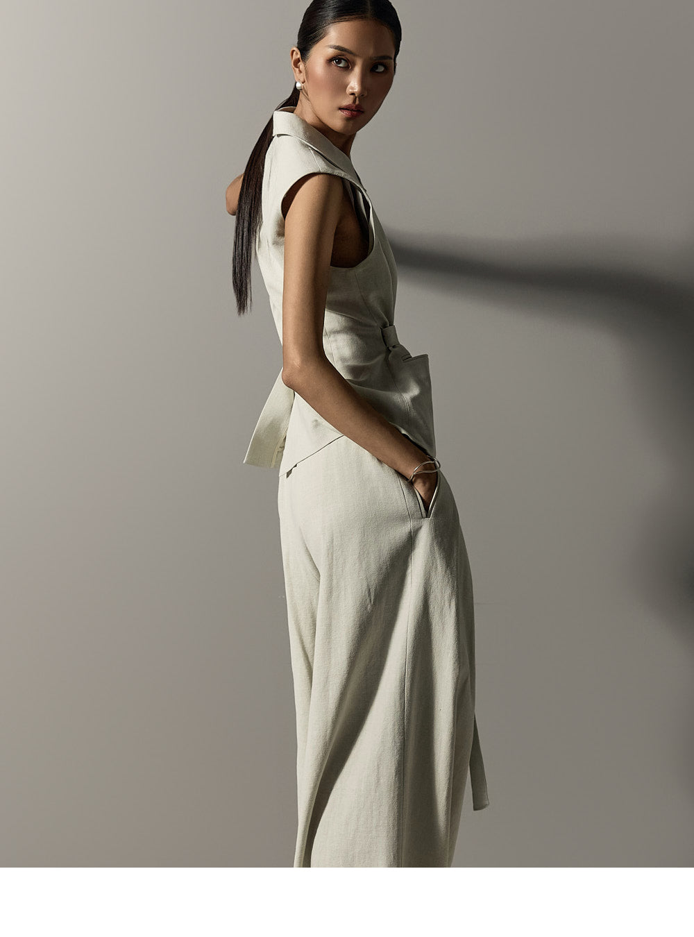 ナチュラルでリラックスした雰囲気を演出するボタンベスト。