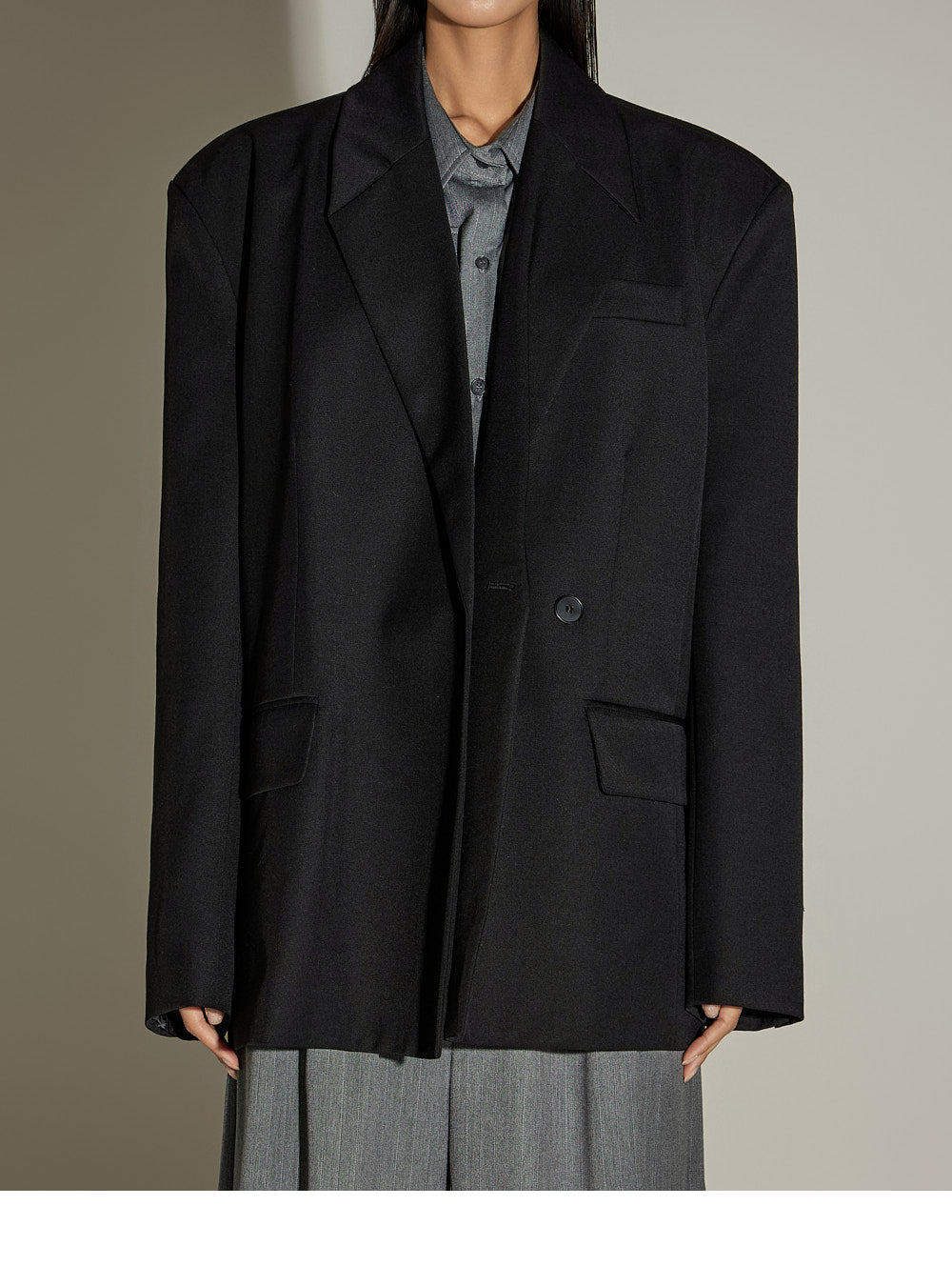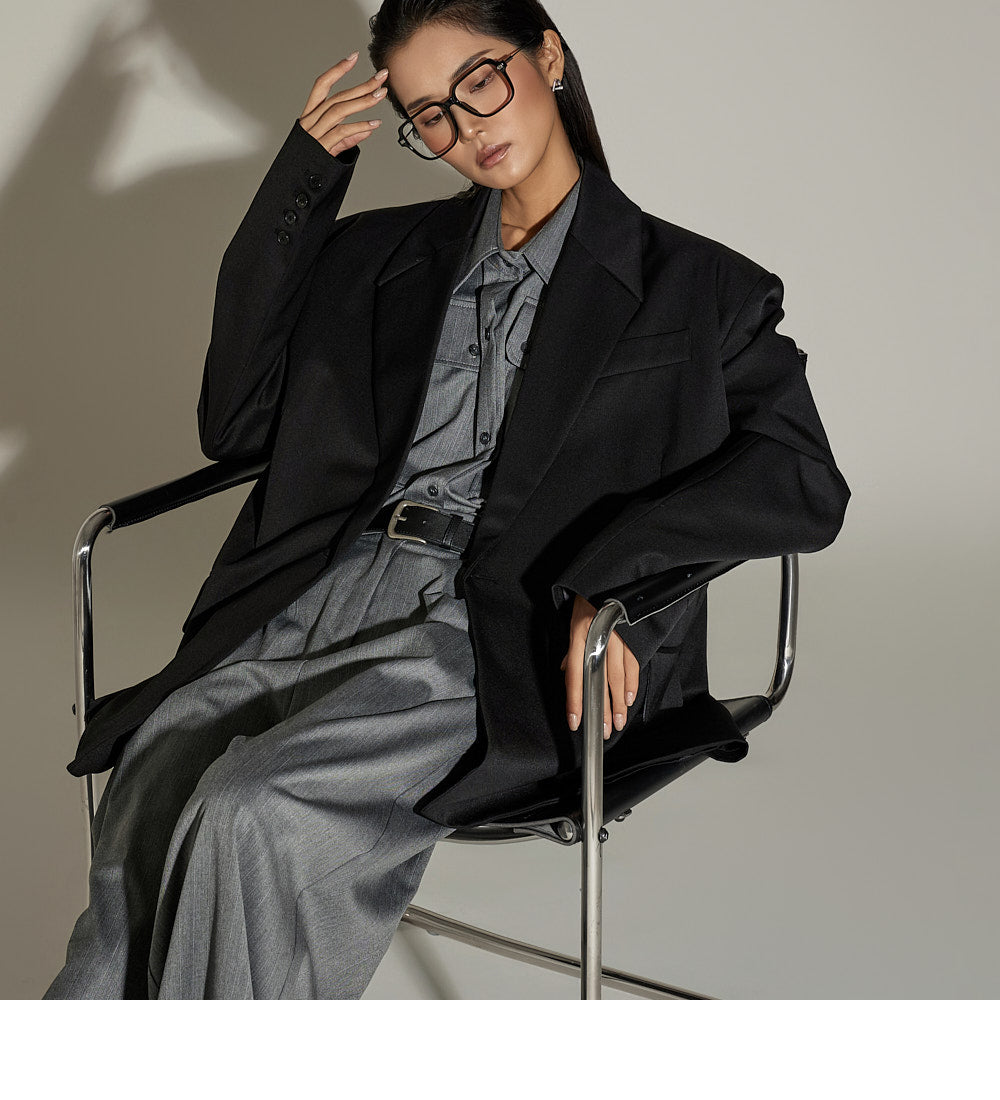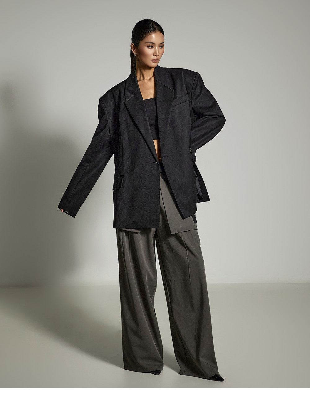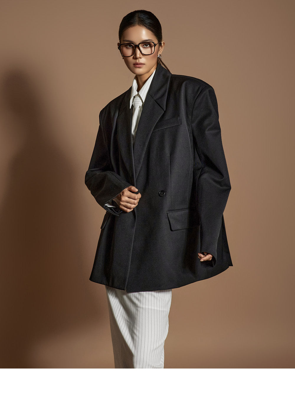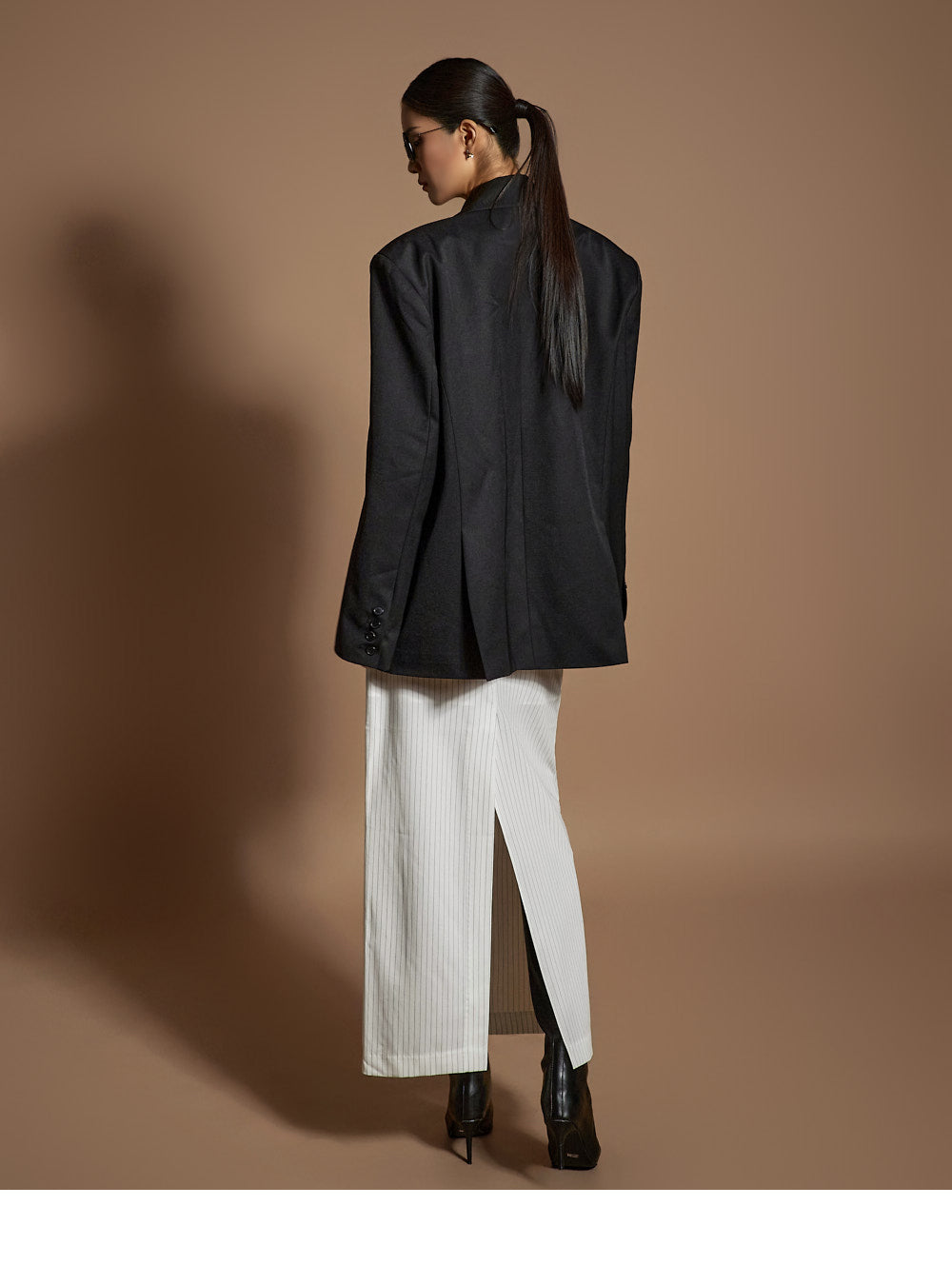 and the moderate shoulder pads provide a structured silhouette.