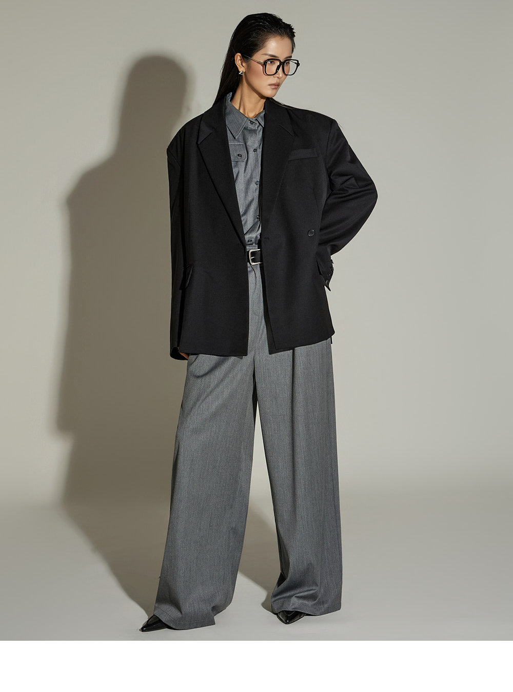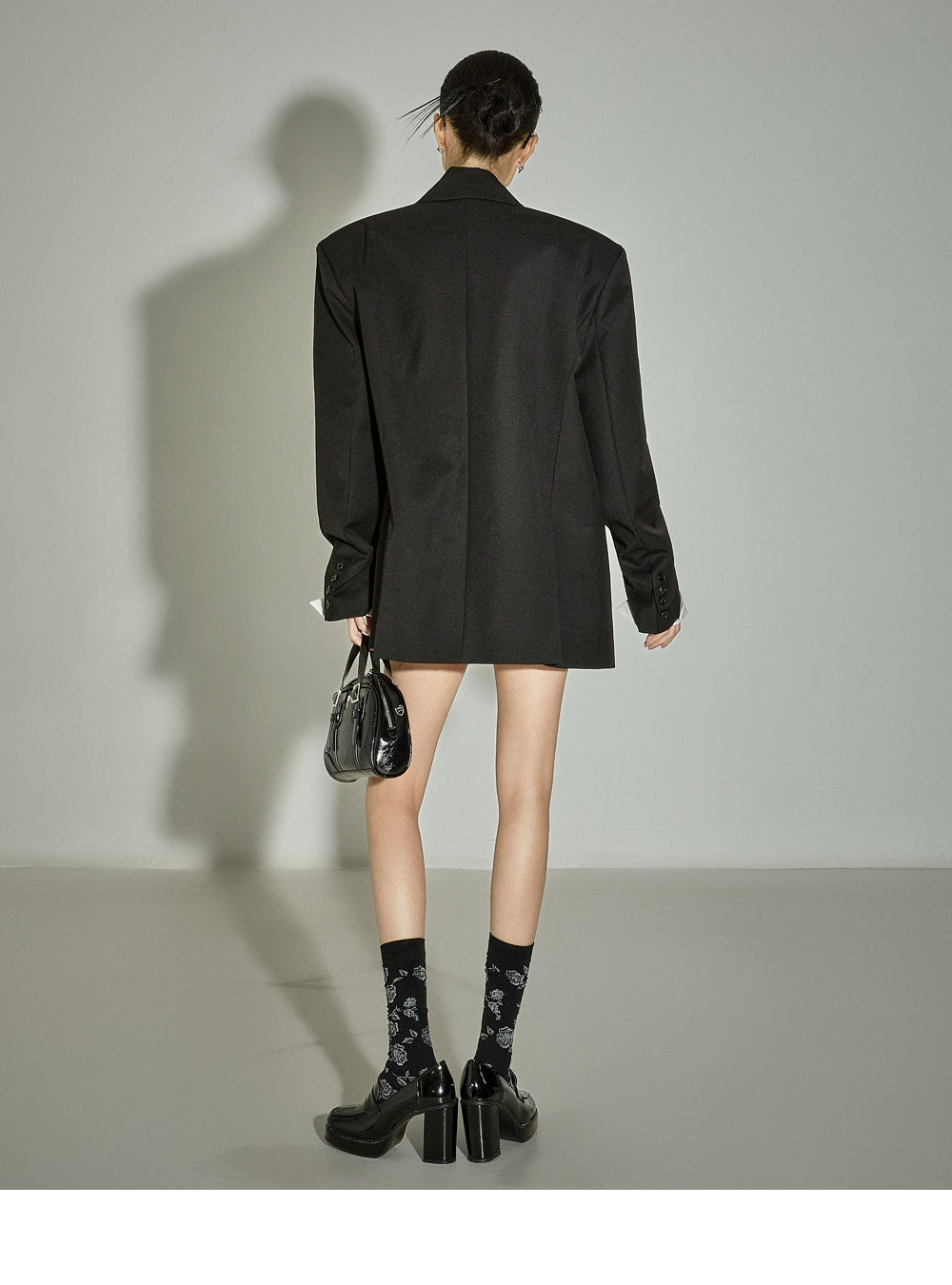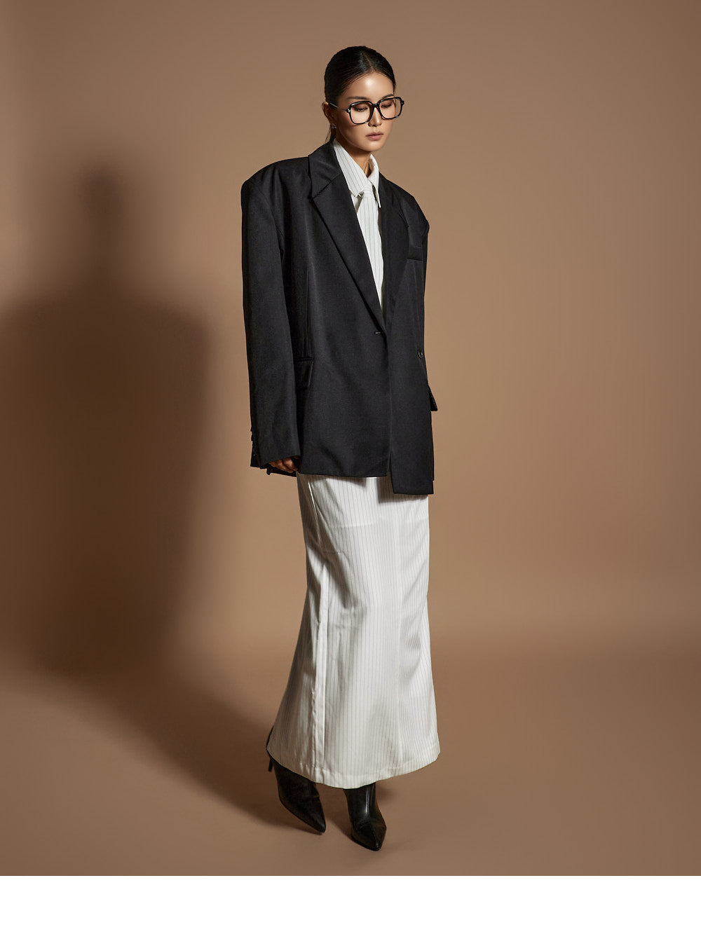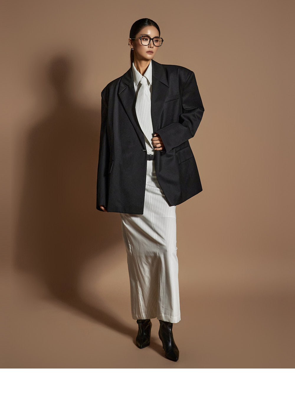 and the moderate shoulder pads provide a structured silhouette.