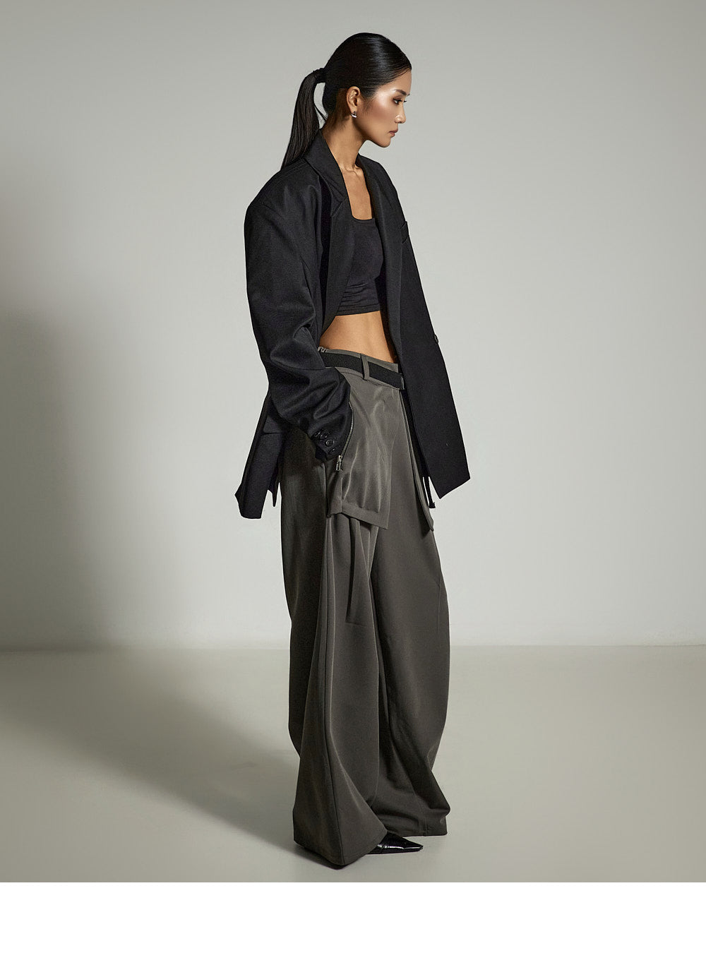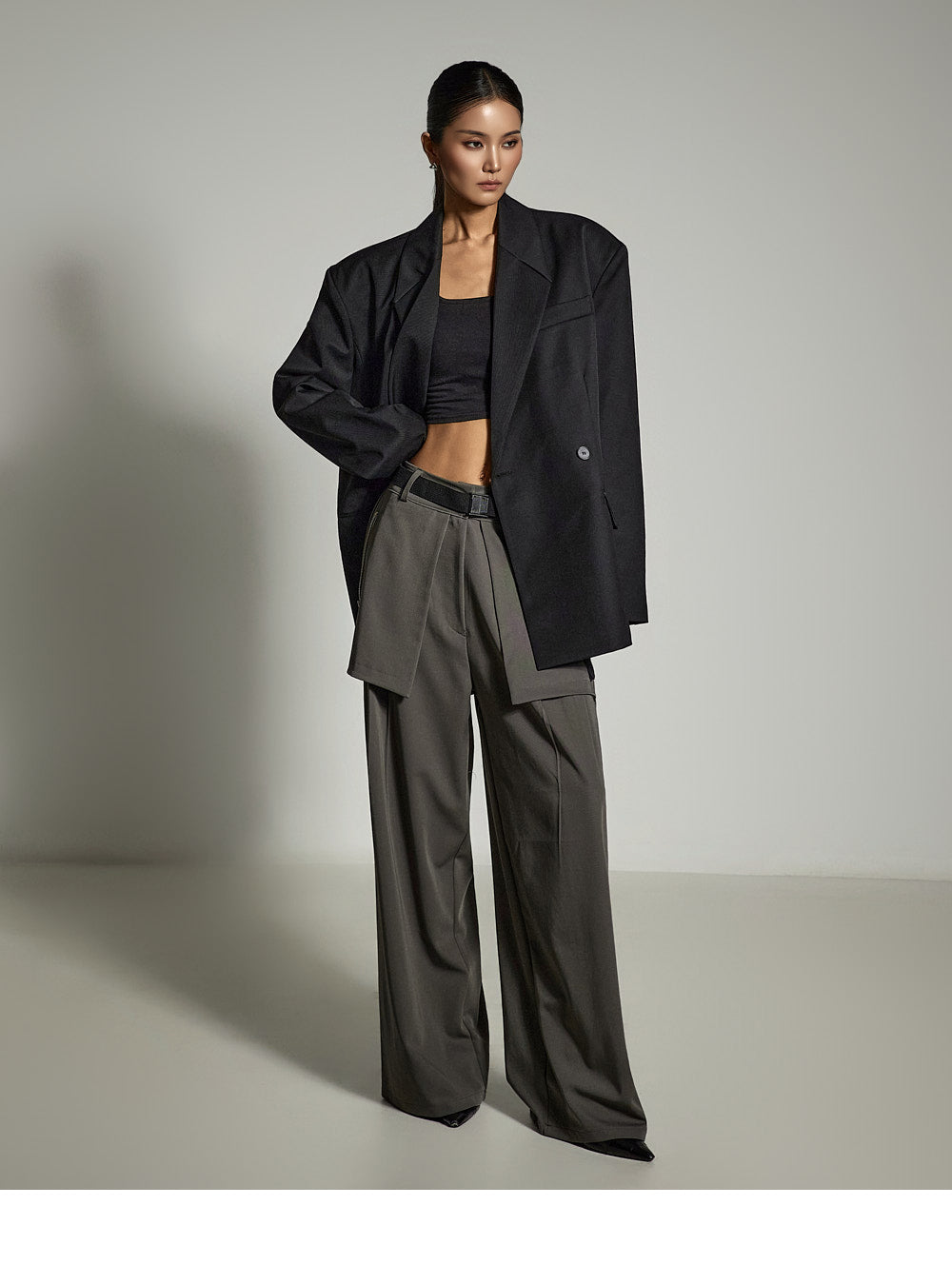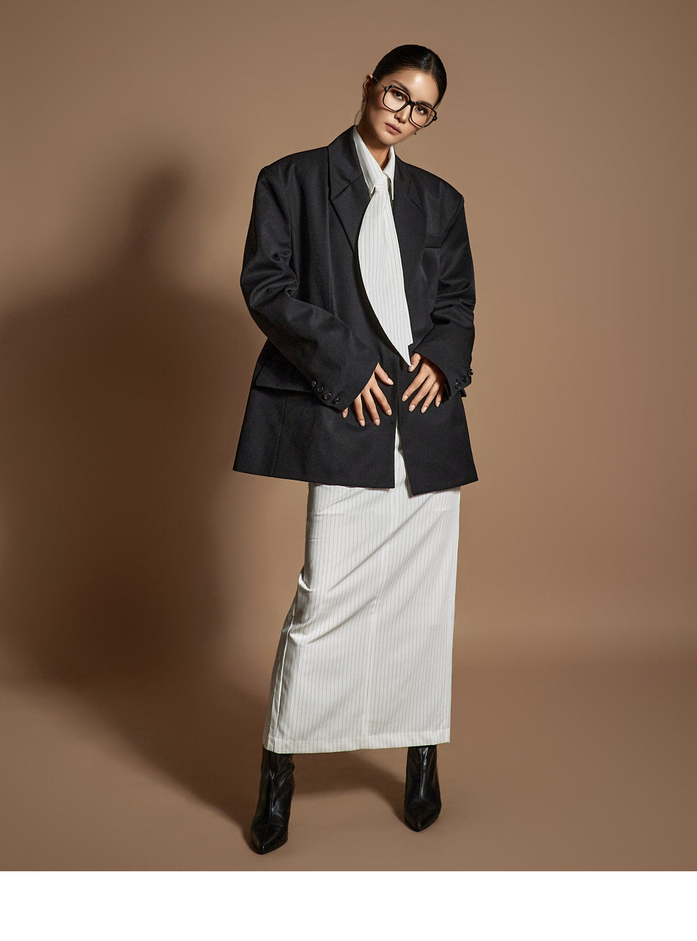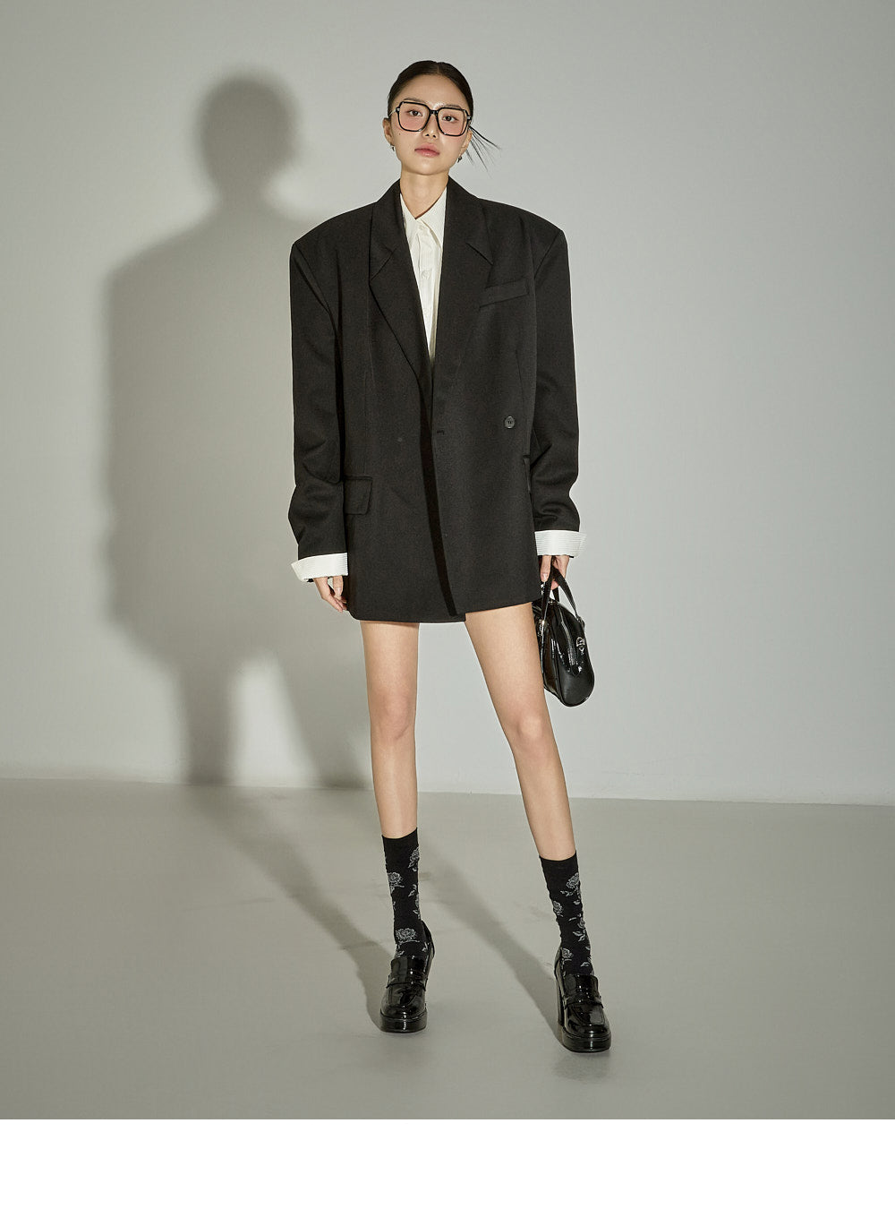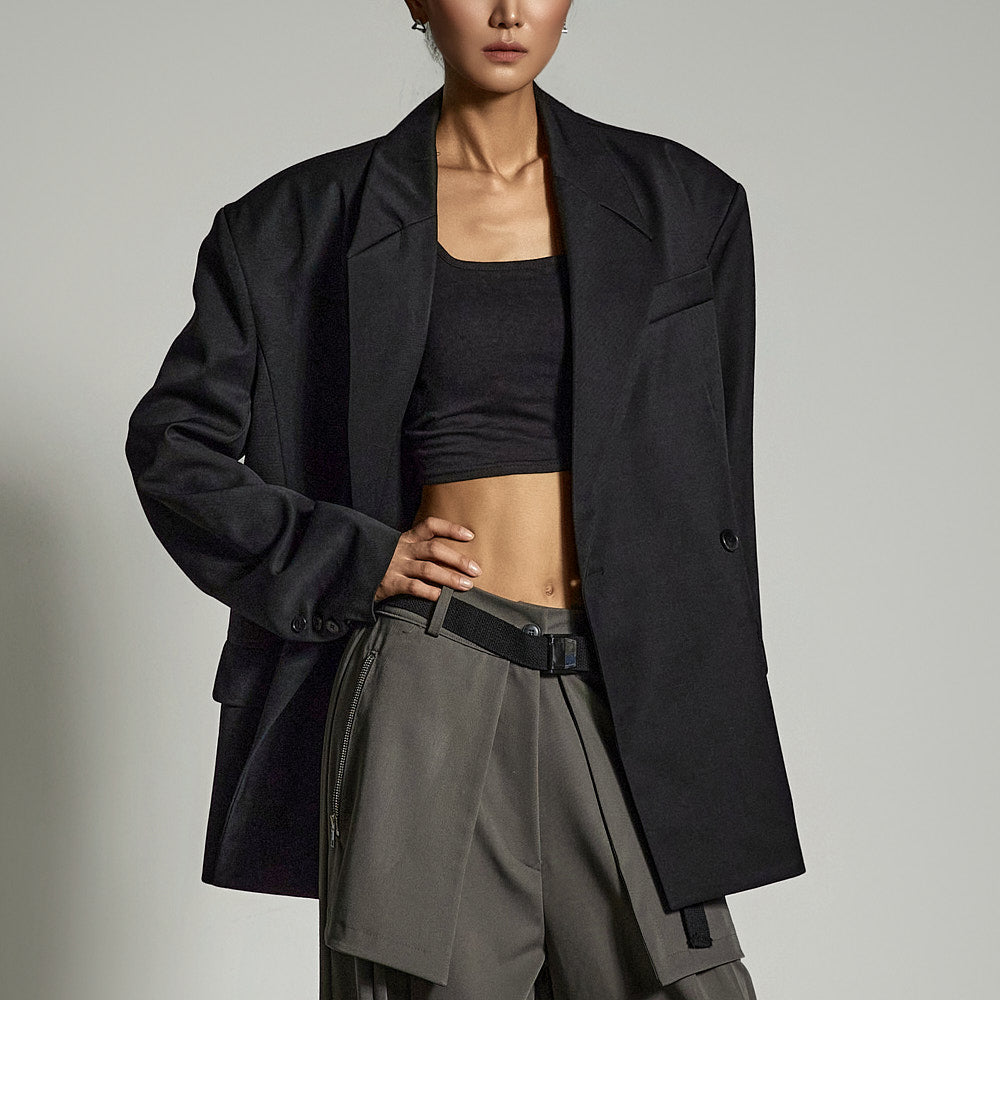 and the moderate shoulder pads provide a structured silhouette.