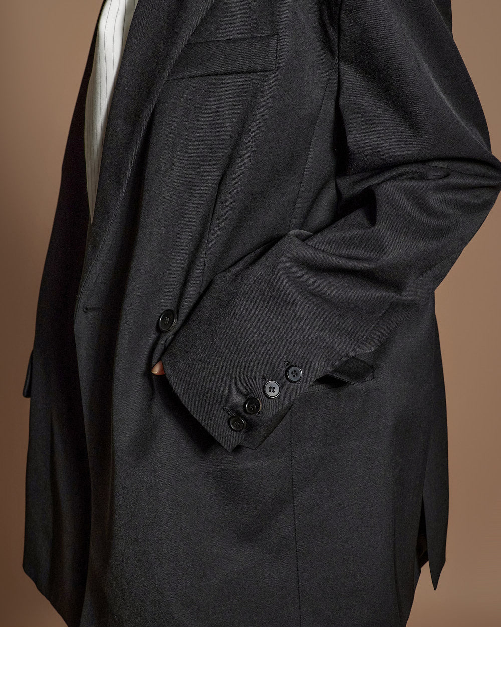 Featuring front buttons, side pockets, and sleeve button details,