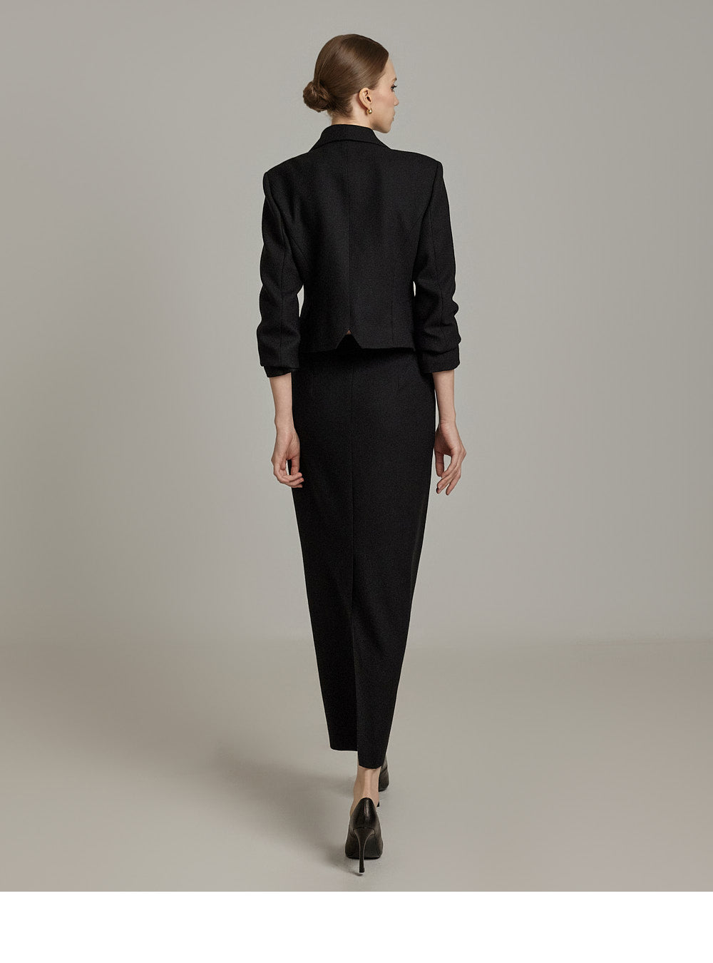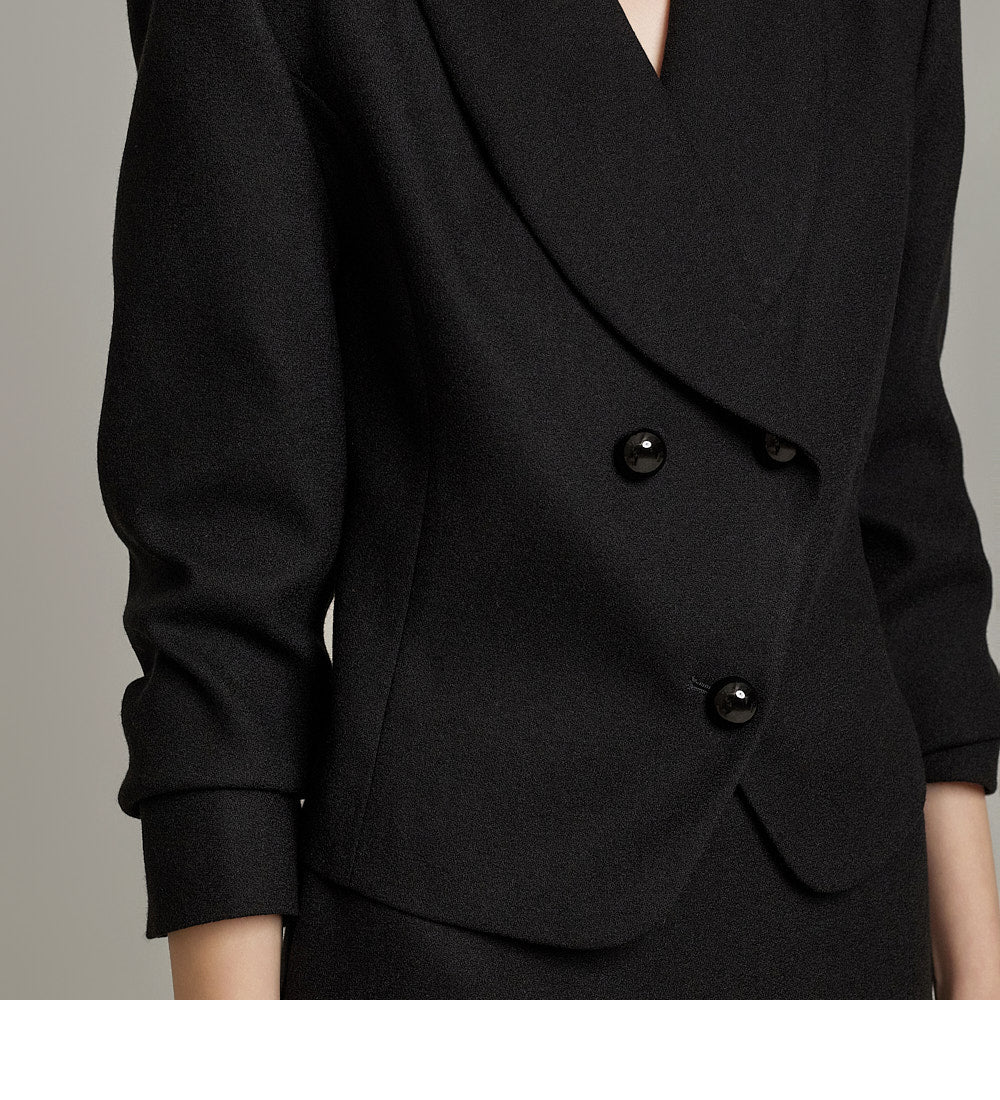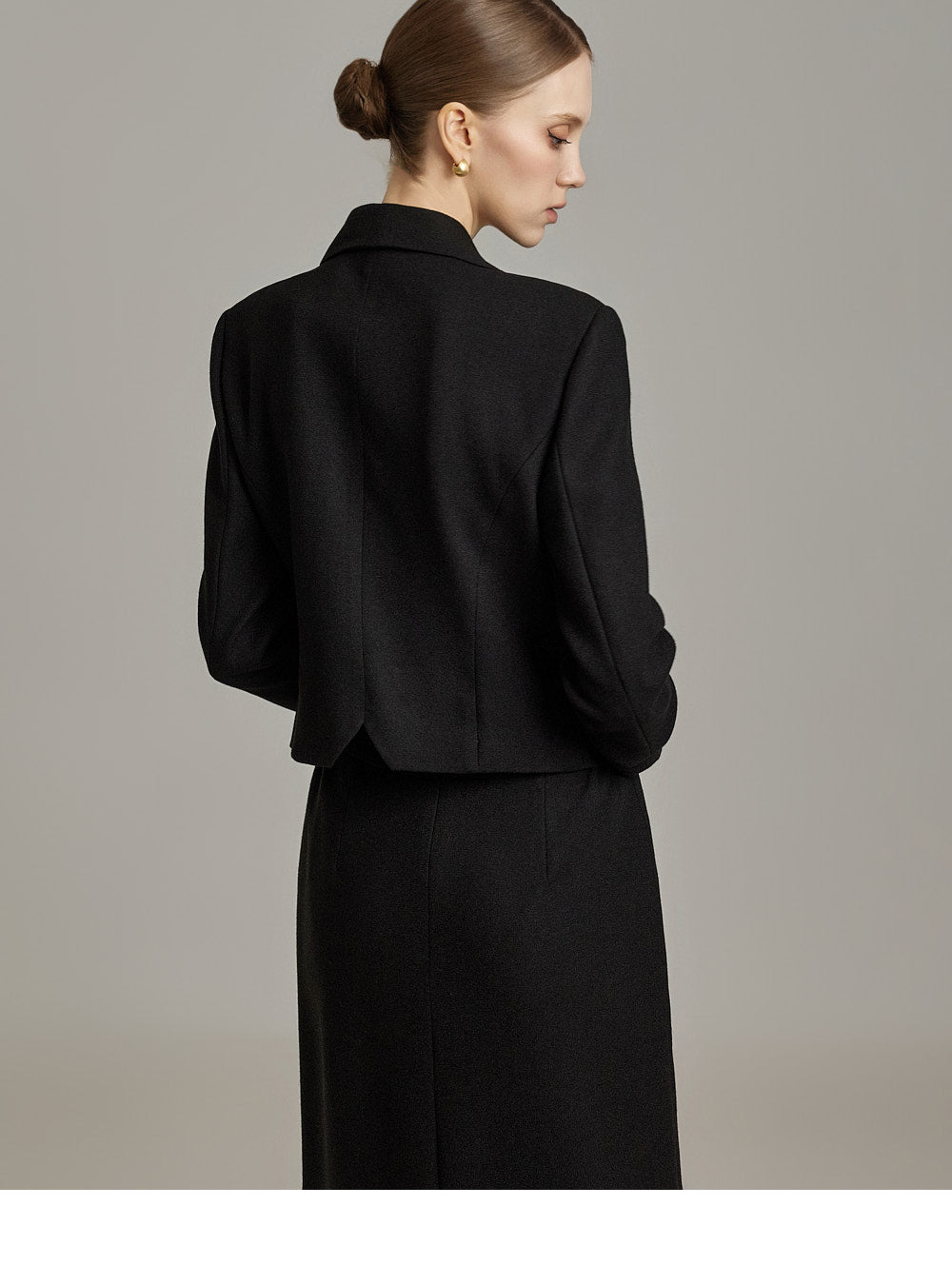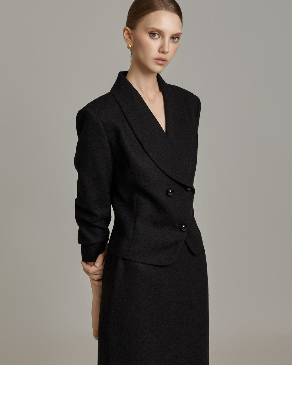 The short length creates a sophisticated silhouette, while the ankle length and large button details add a touch of style,