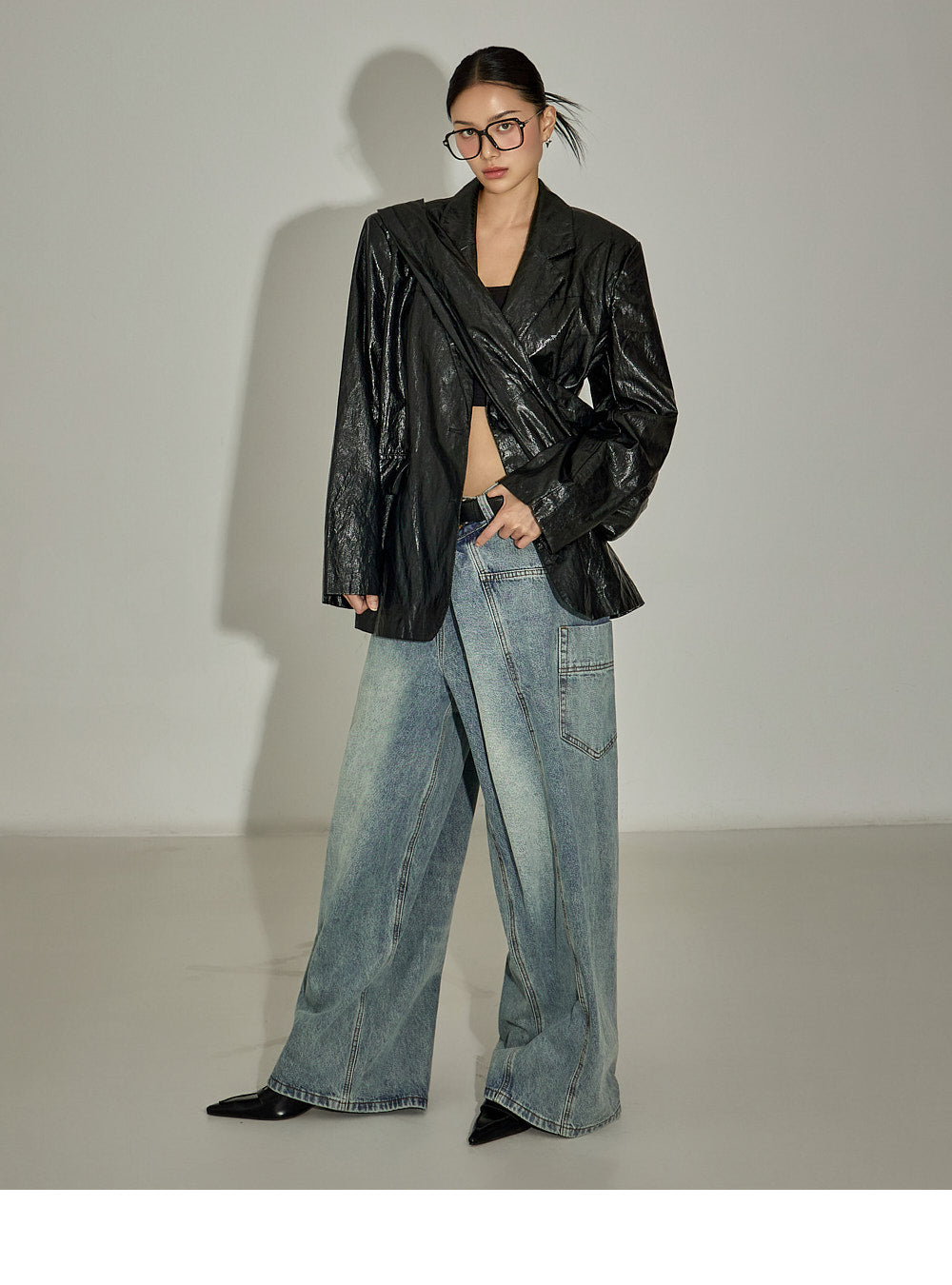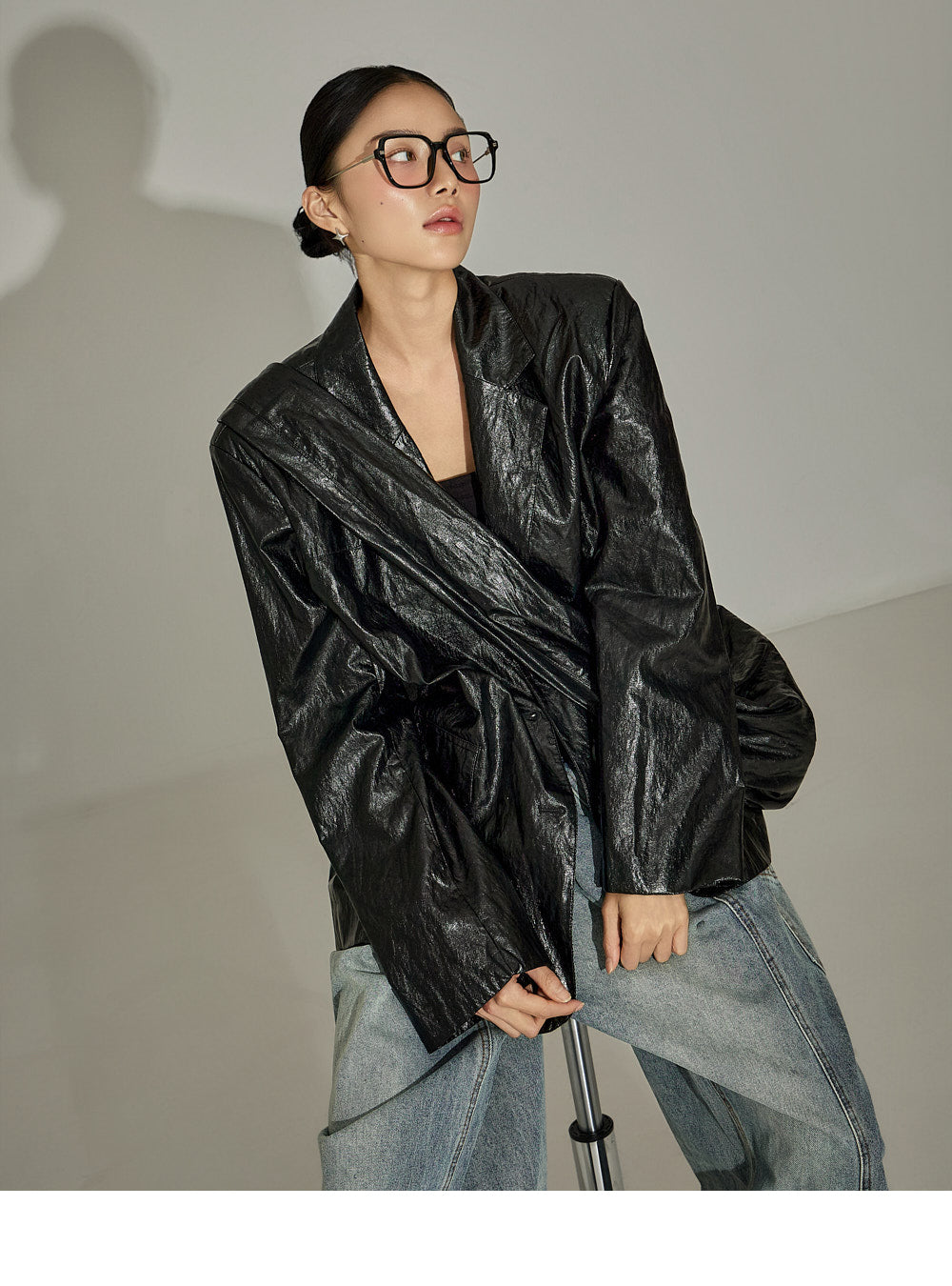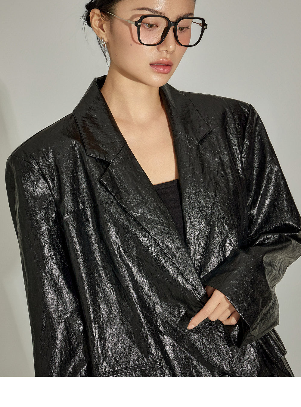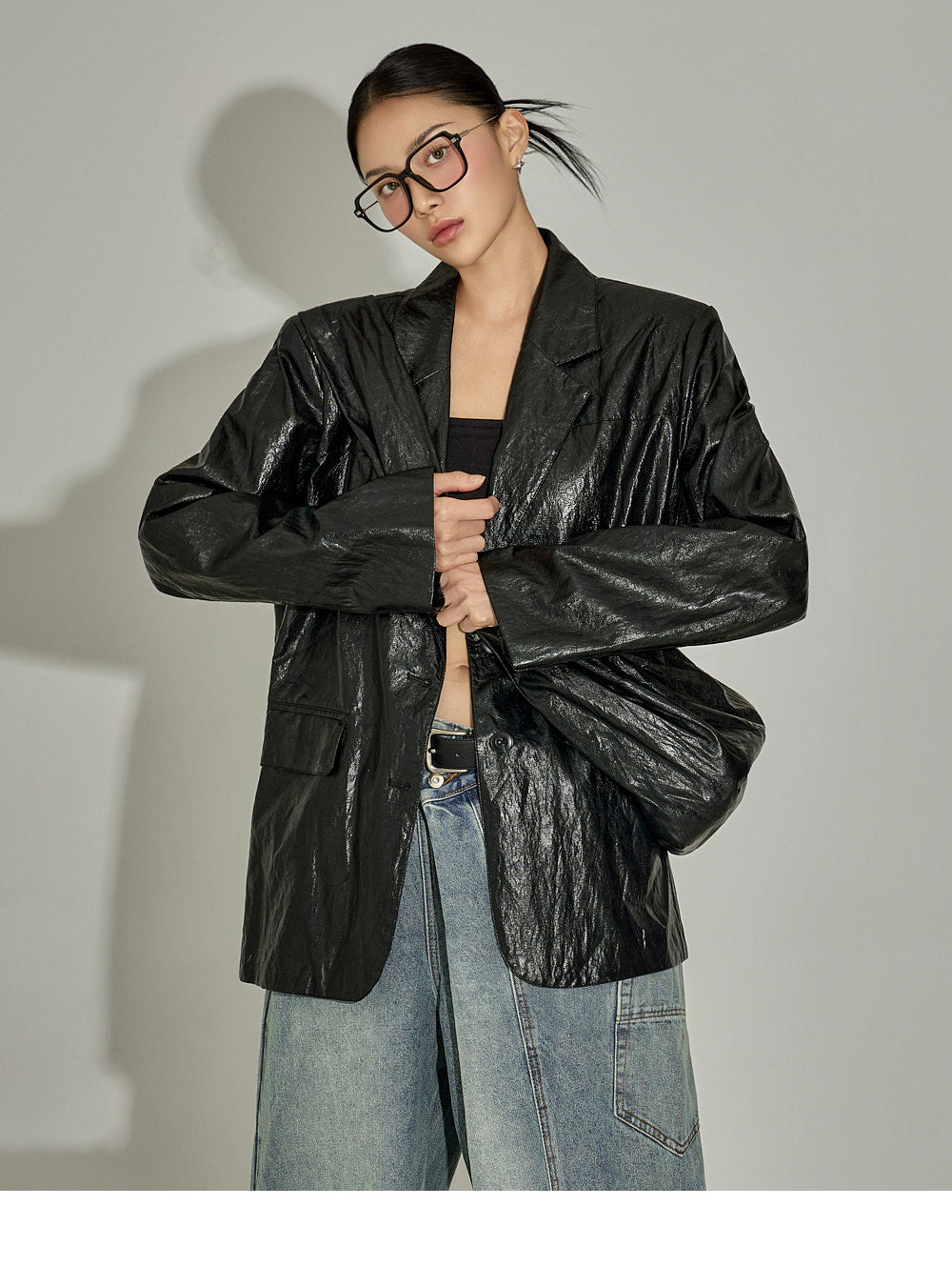 The oversized silhouette and shoulder pads create a structured silhouette.