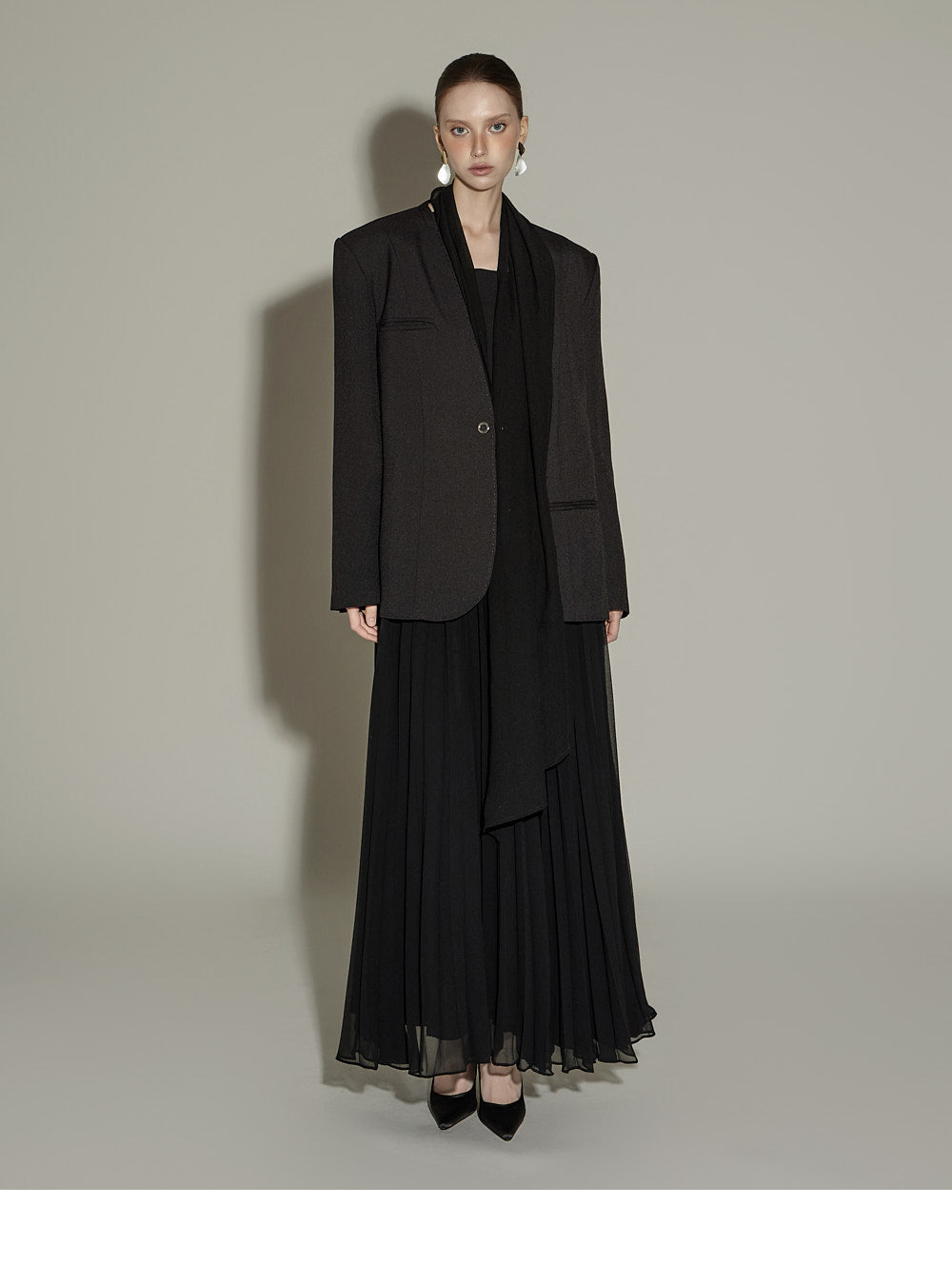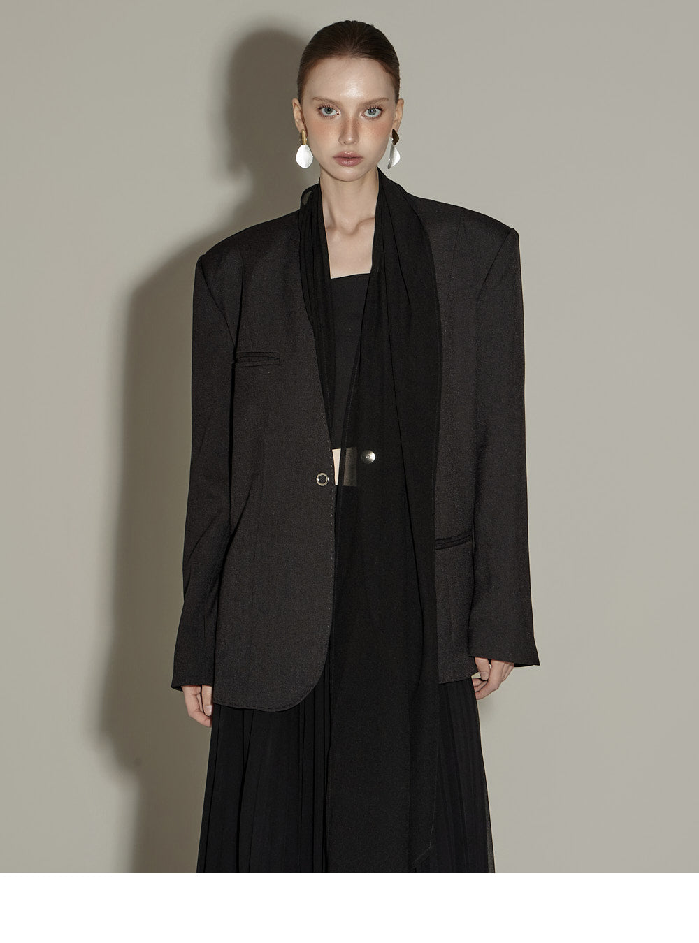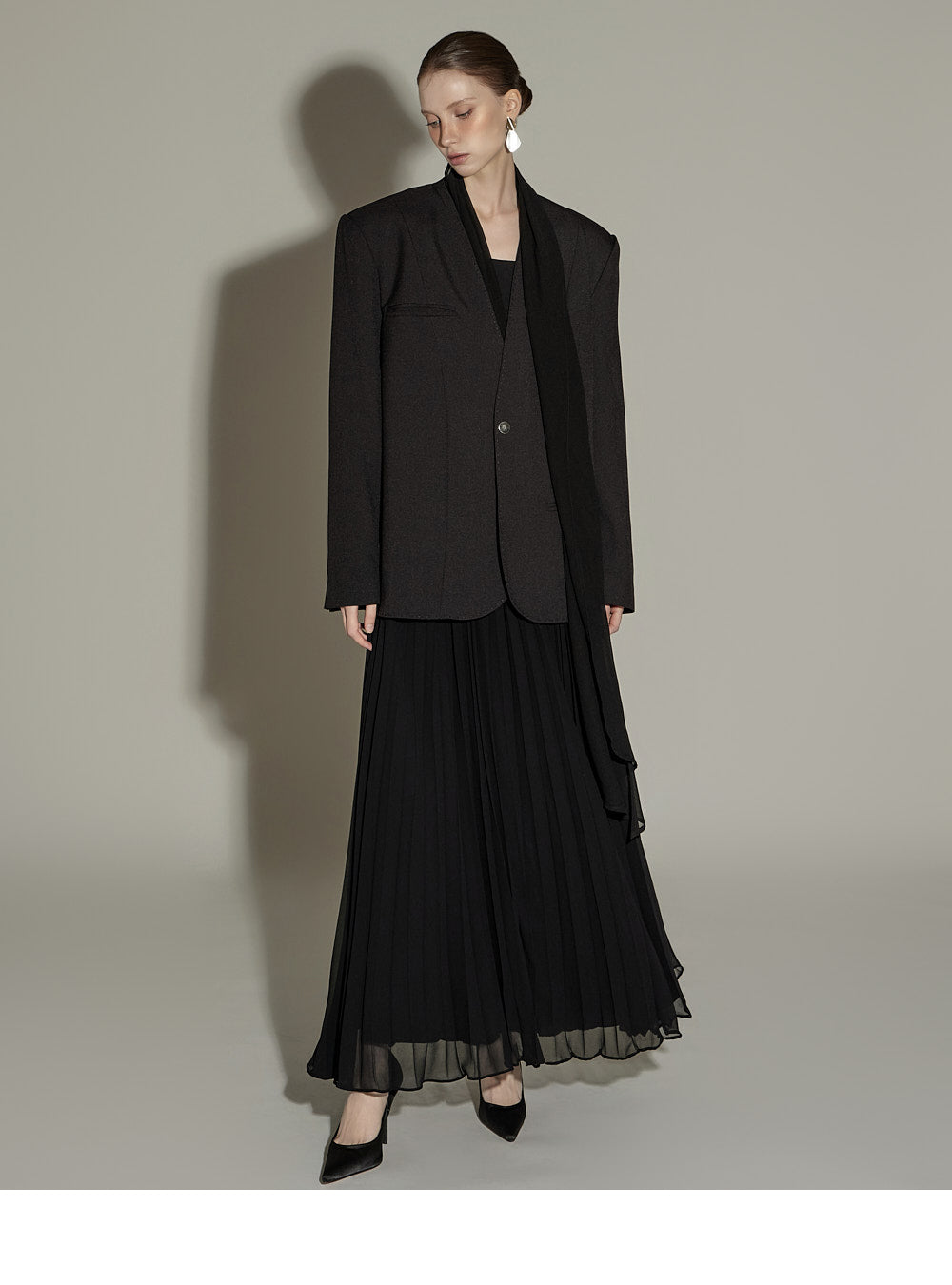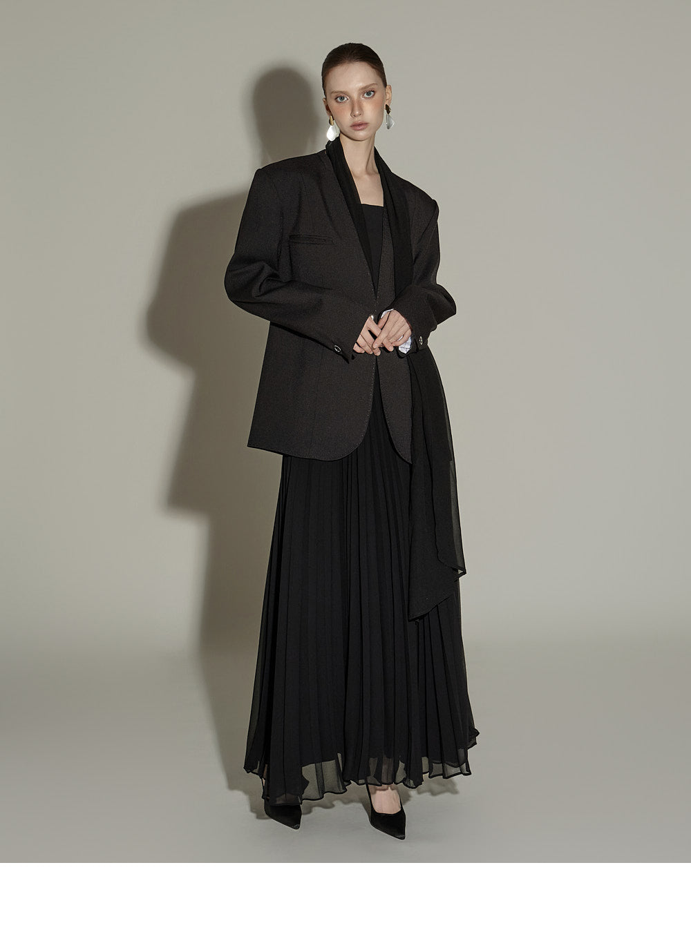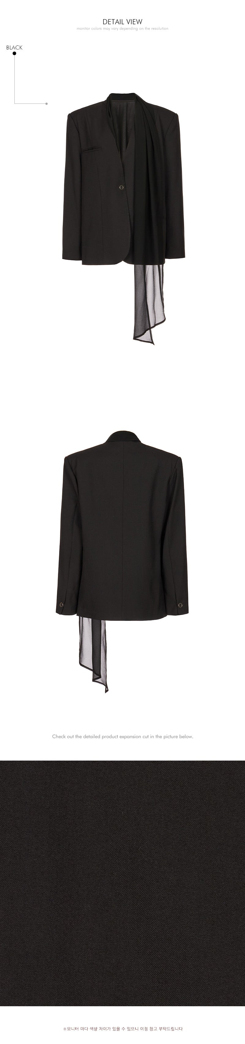 The sheer, detachable scarf detail allows for a variety of styling possibilities,