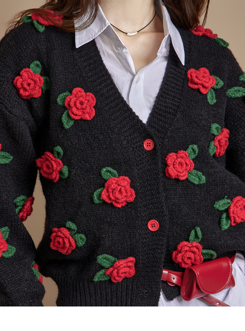 The V-neckline and front button closure