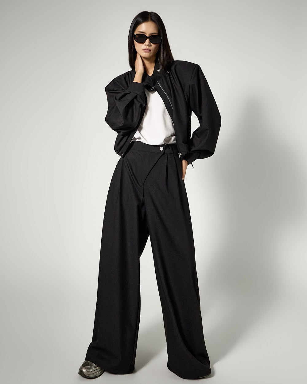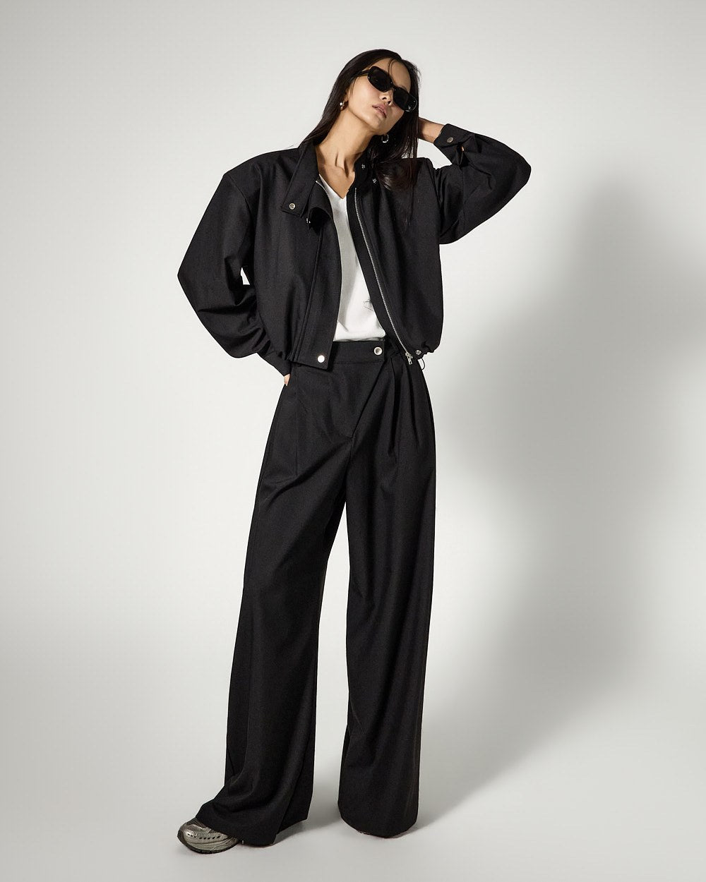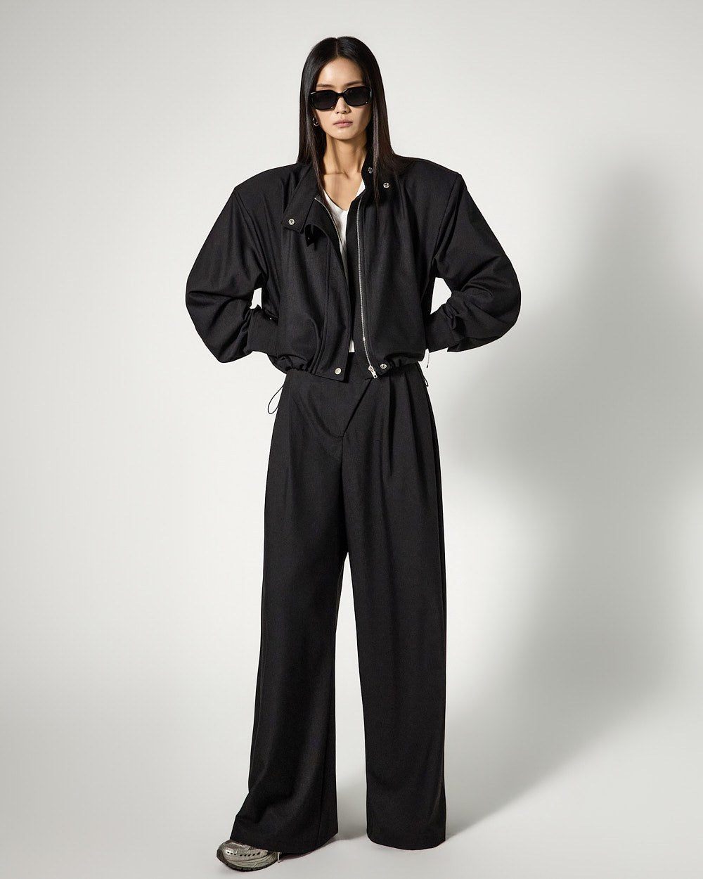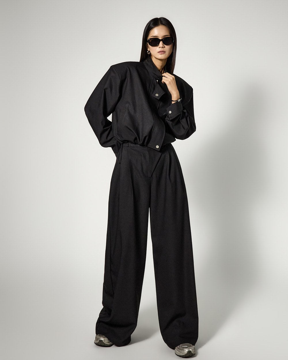 and the addition of moderate shoulder pads creates a clean silhouette,