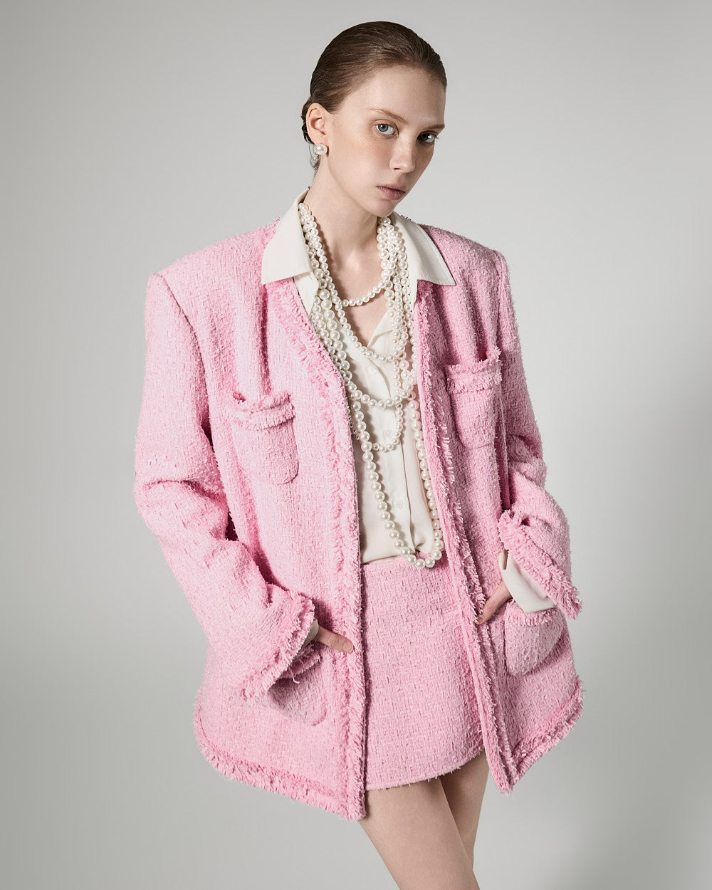 the tweed texture stands out with its three-dimensional texture,