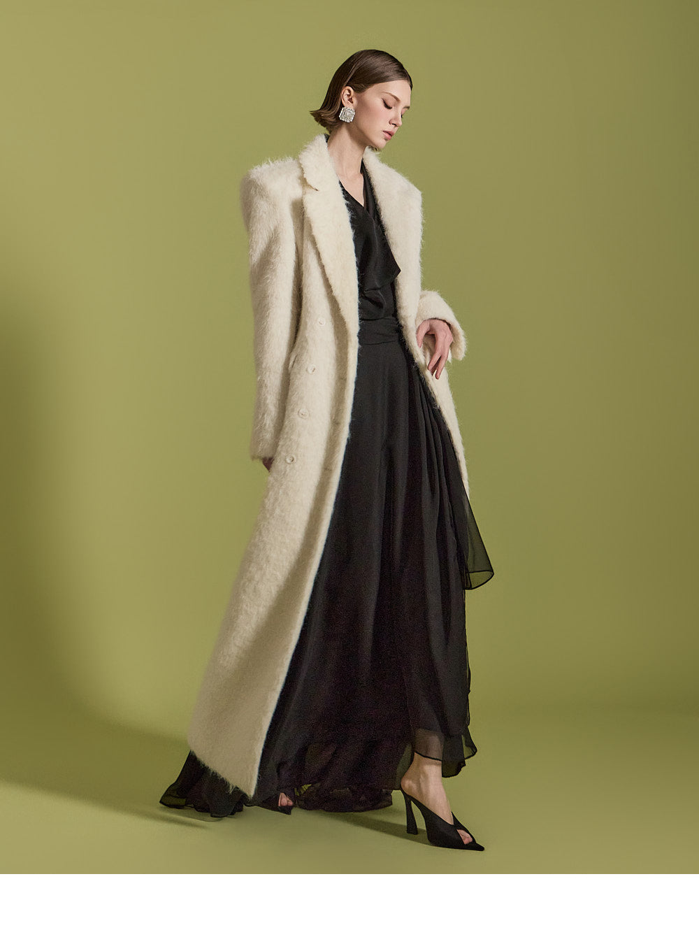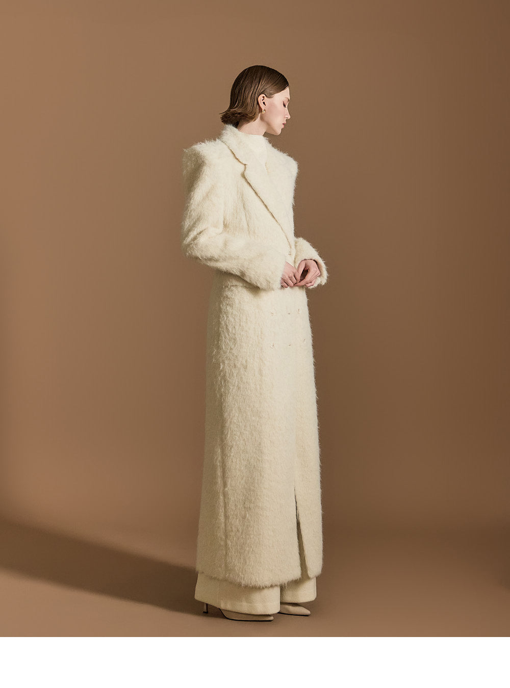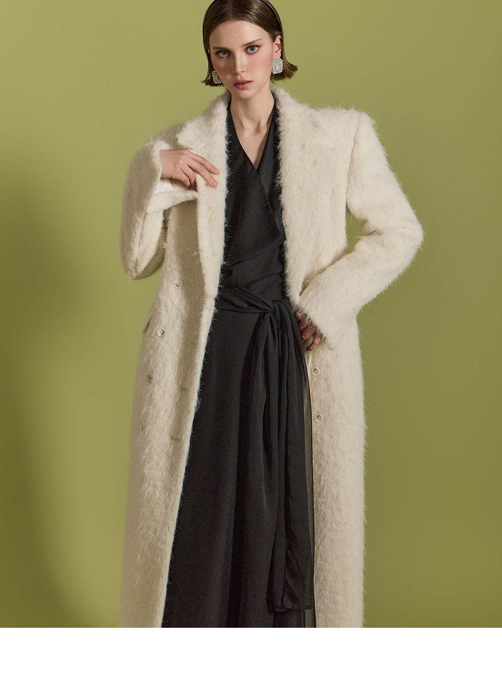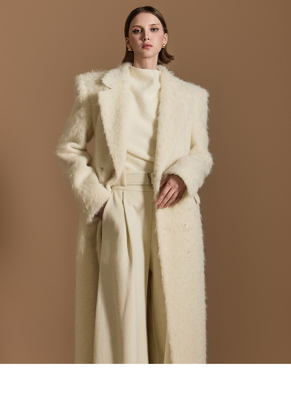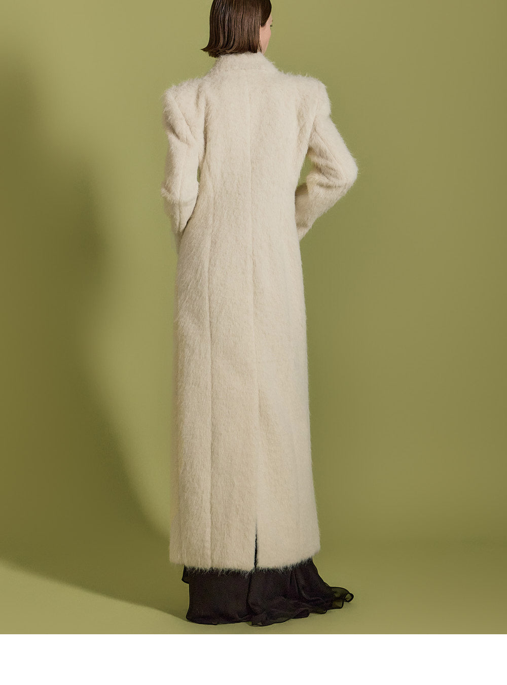 すっきりとしたラインのロングコートは、秋冬のスタイリッシュな装いにぴったりです。