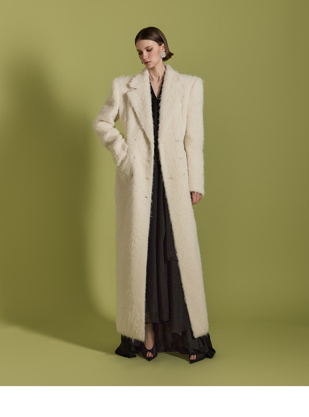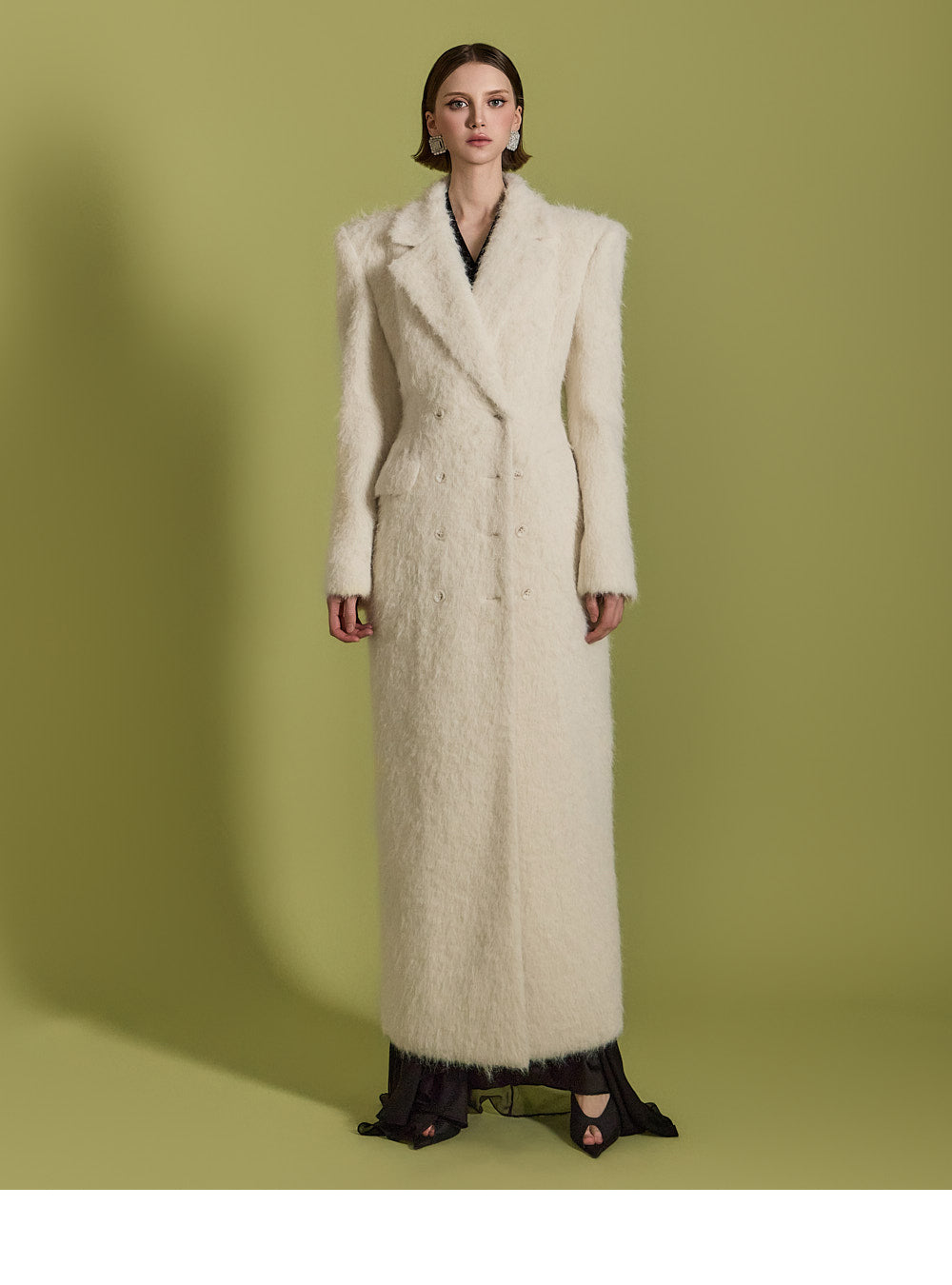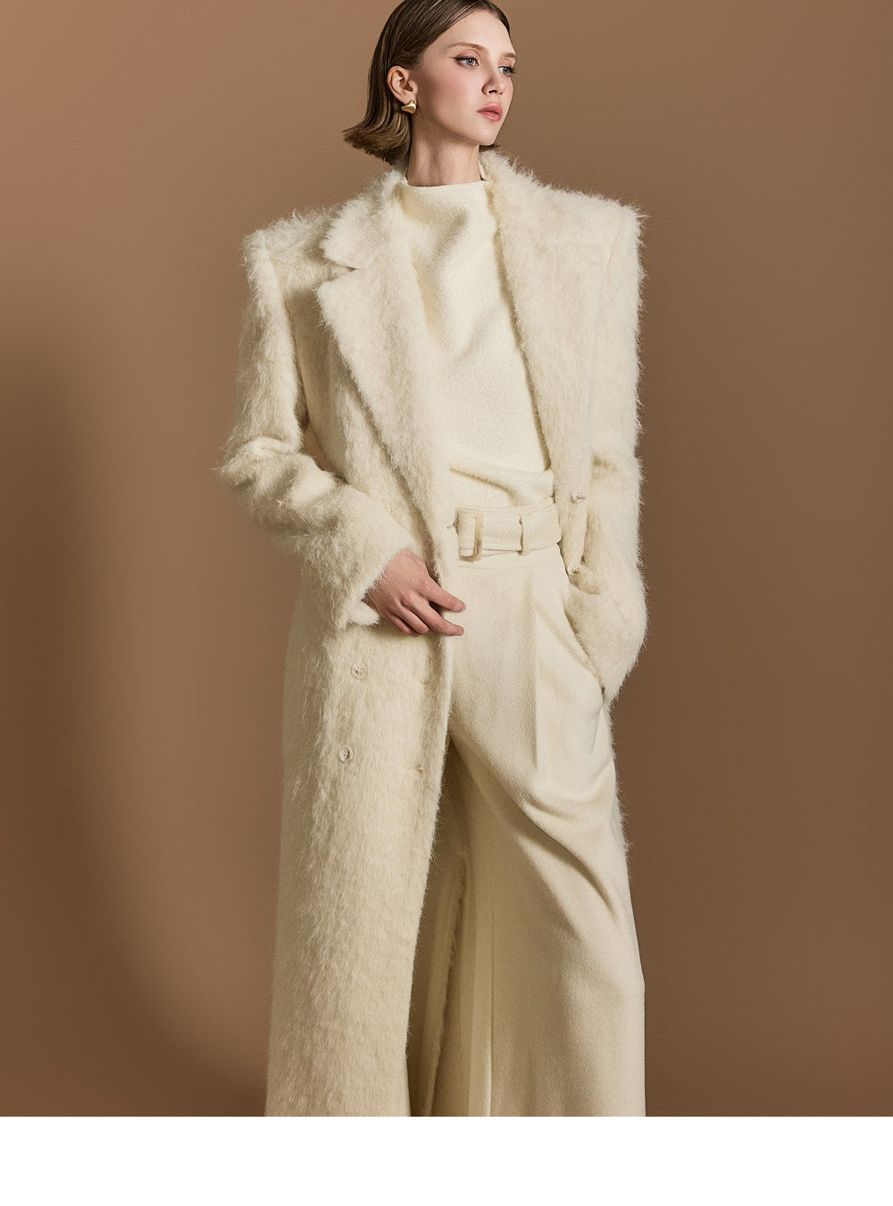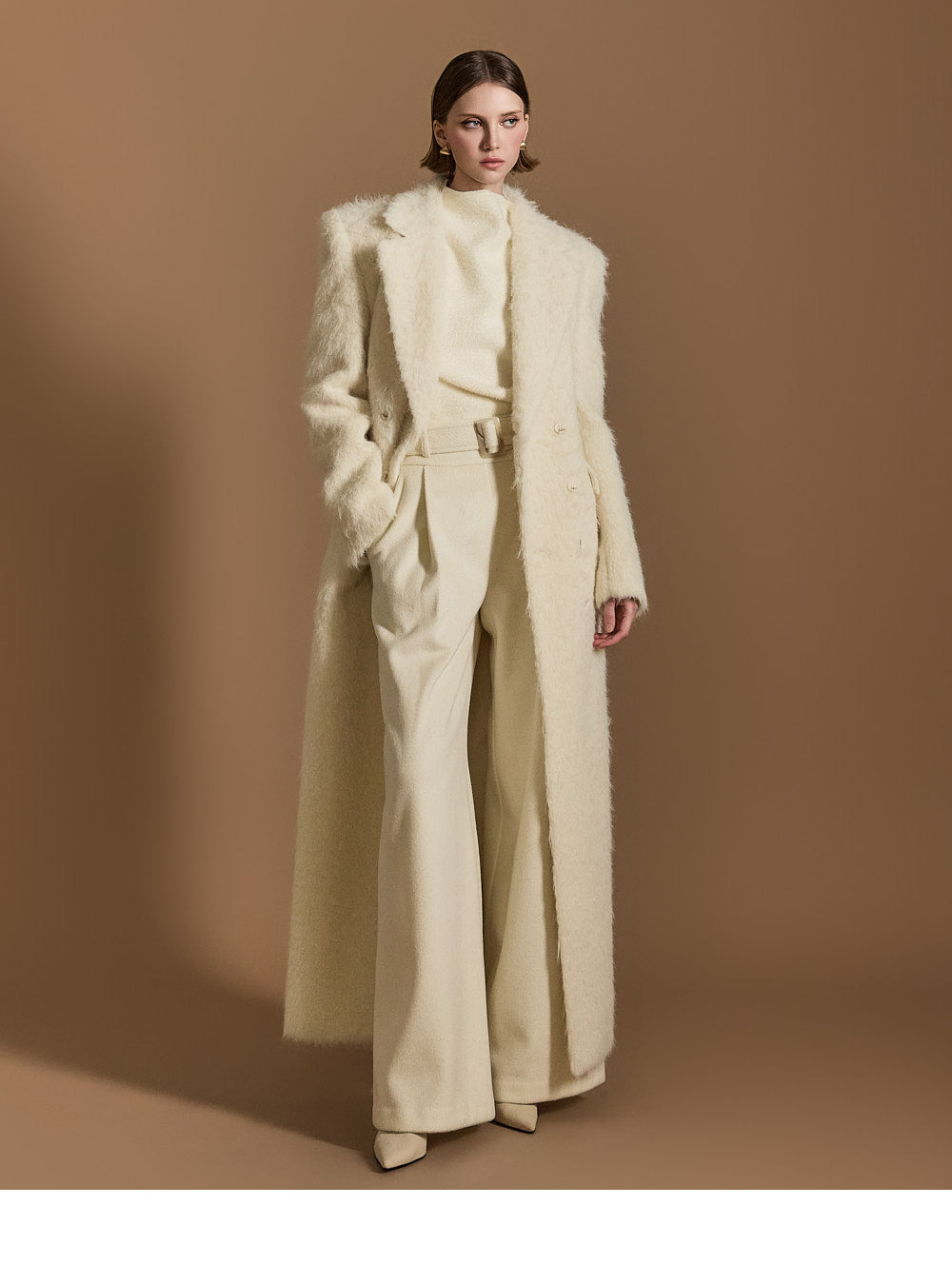 すっきりとしたラインのロングコートは、秋冬のスタイリッシュな装いにぴったりです。