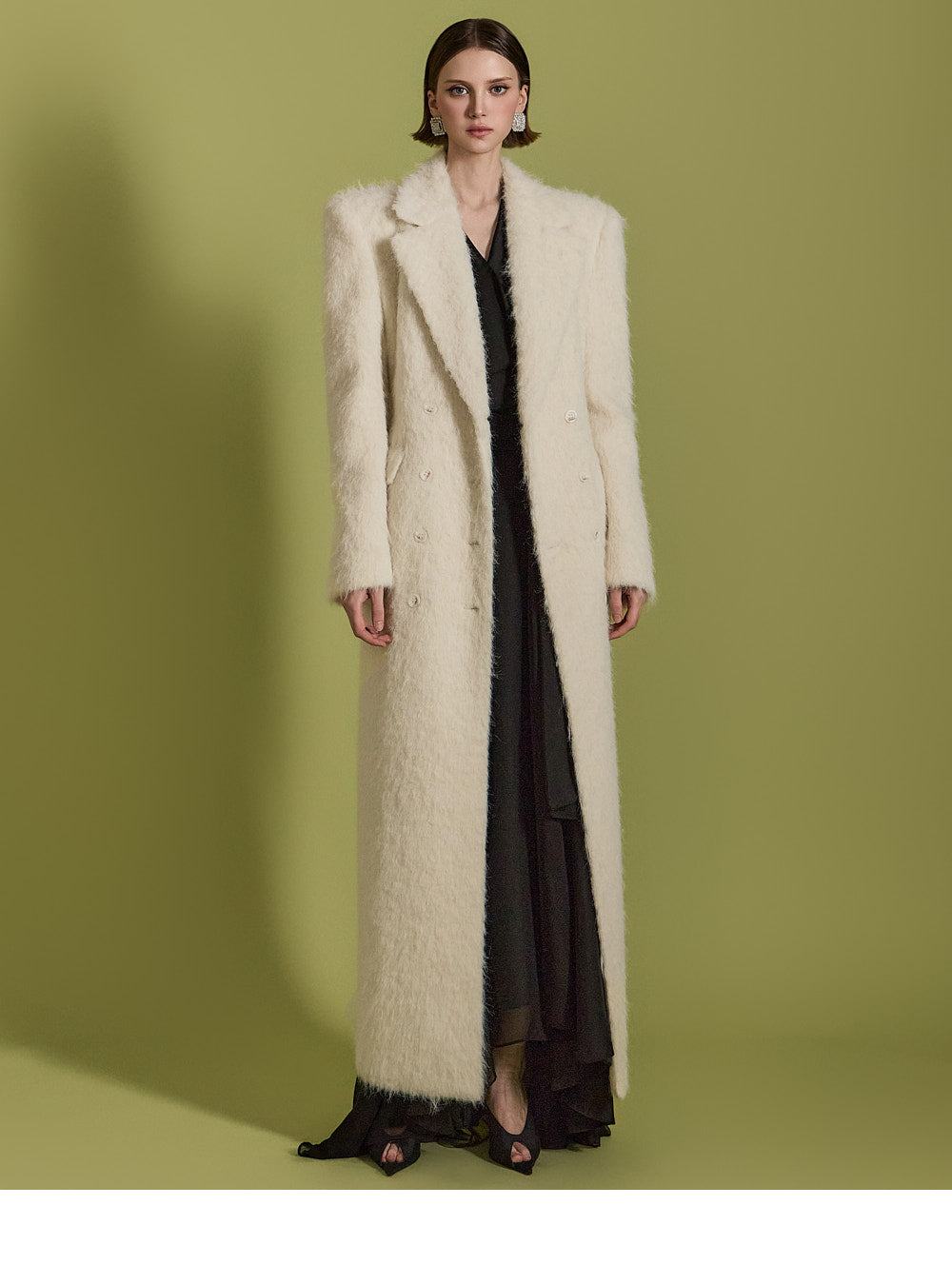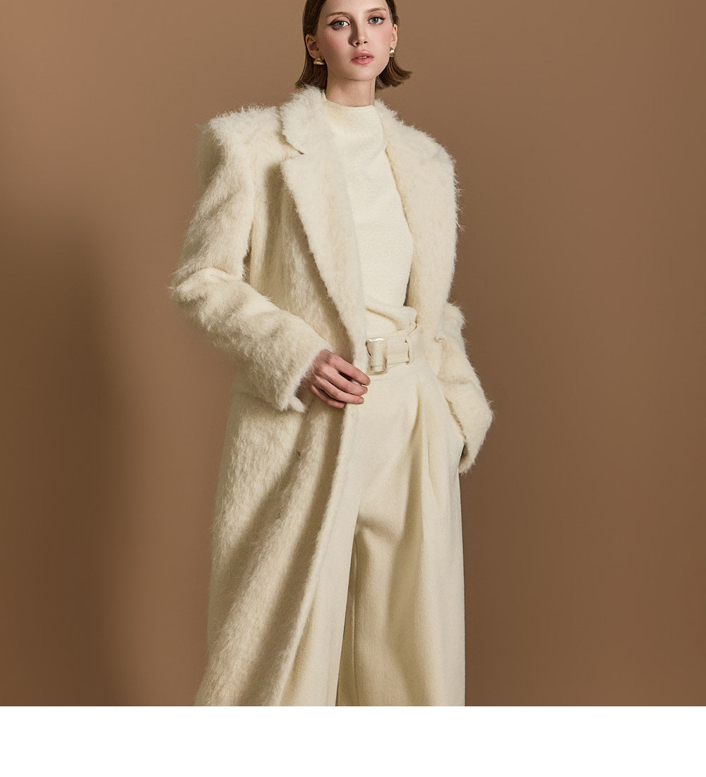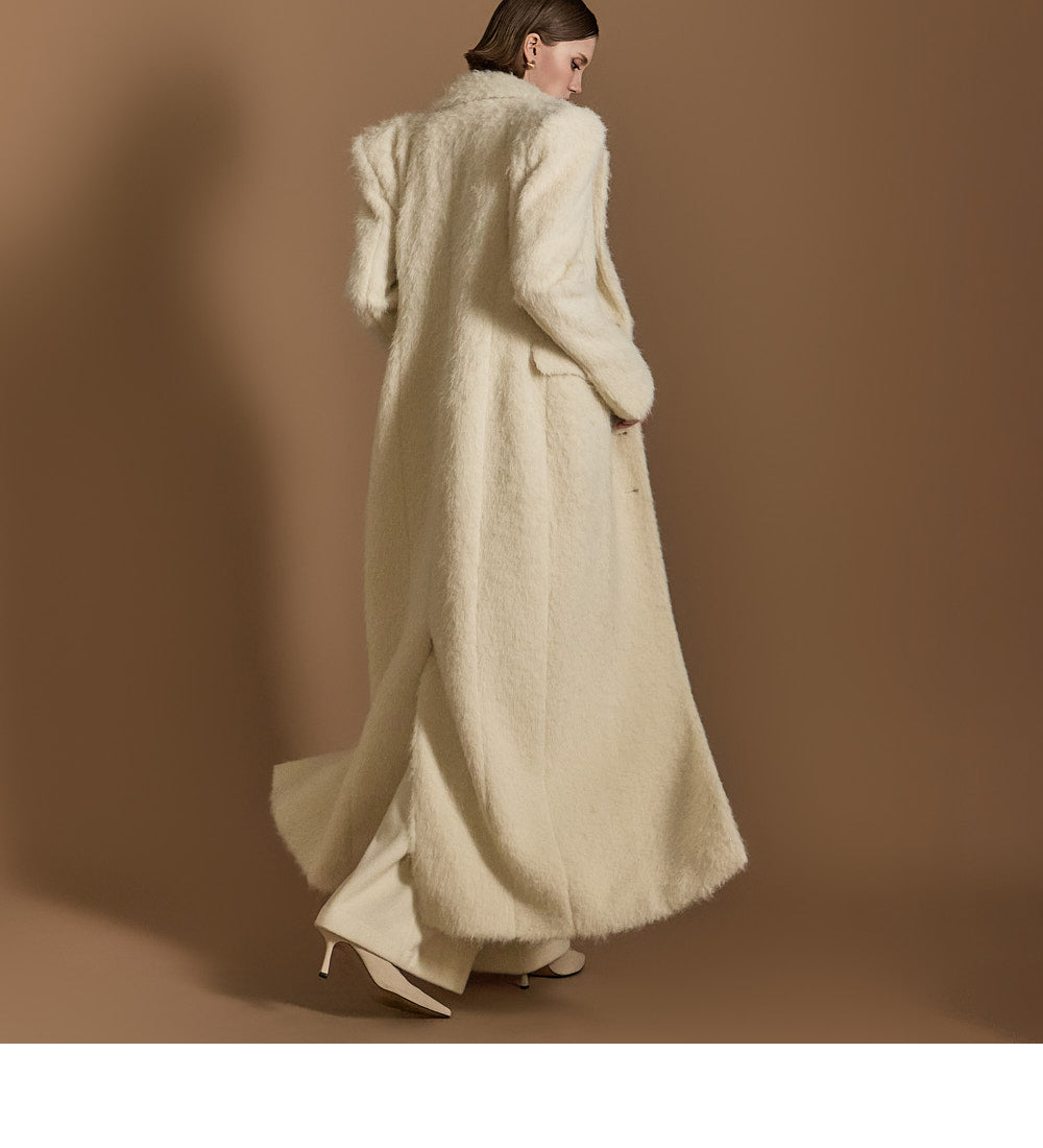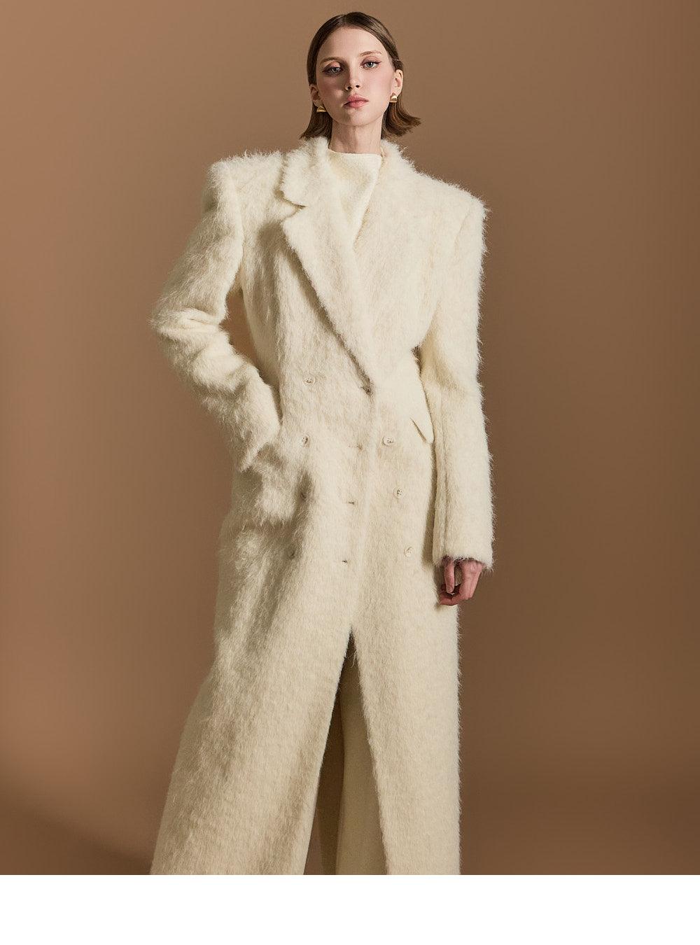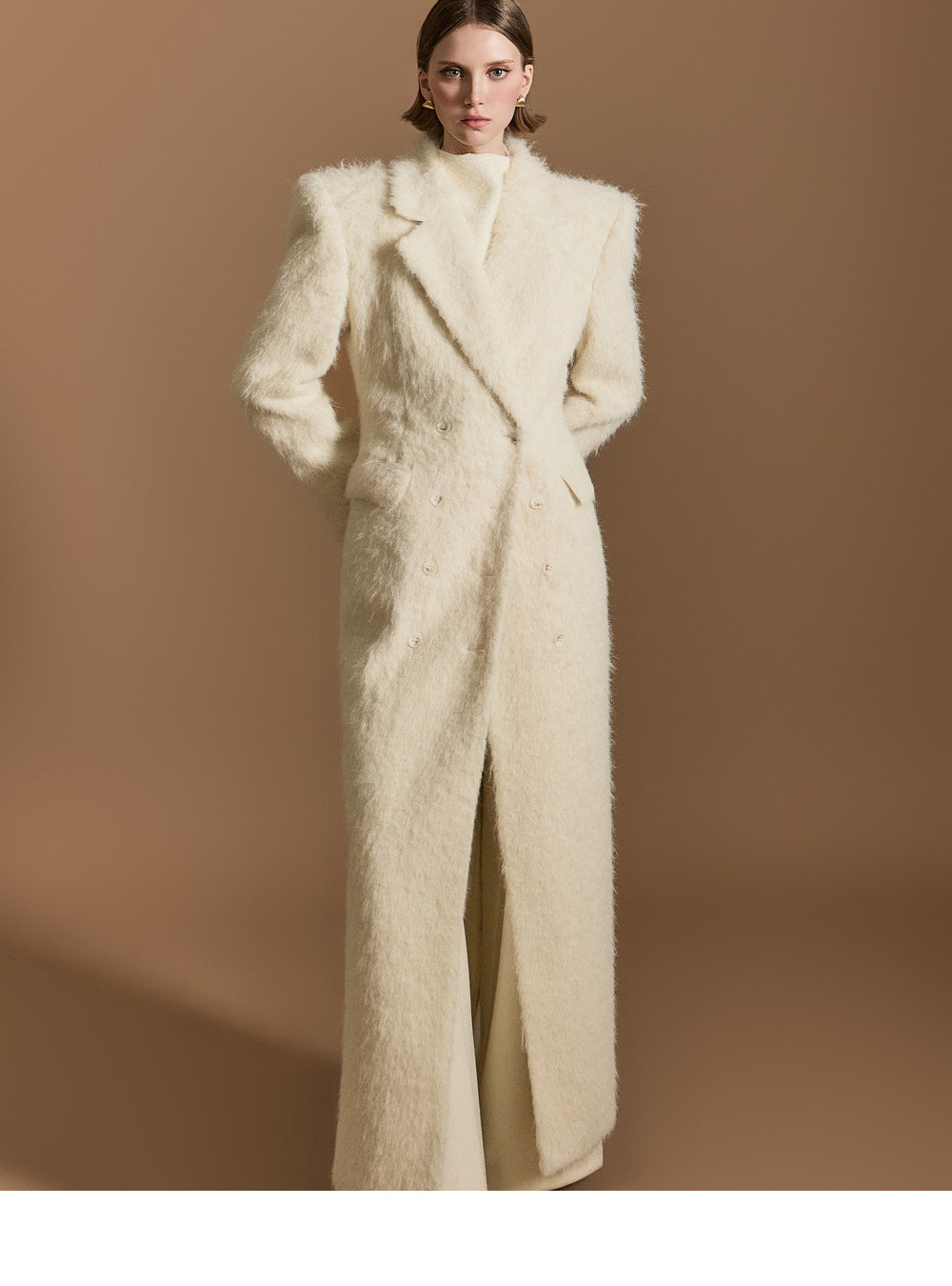 すっきりとしたラインのロングコートは、秋冬のスタイリッシュな装いにぴったりです。