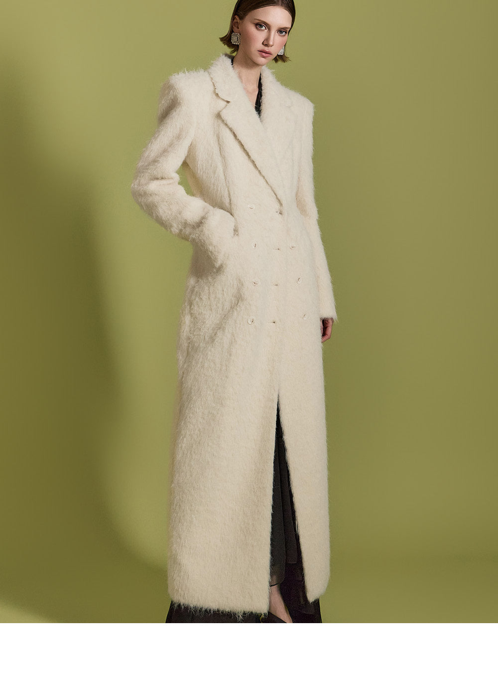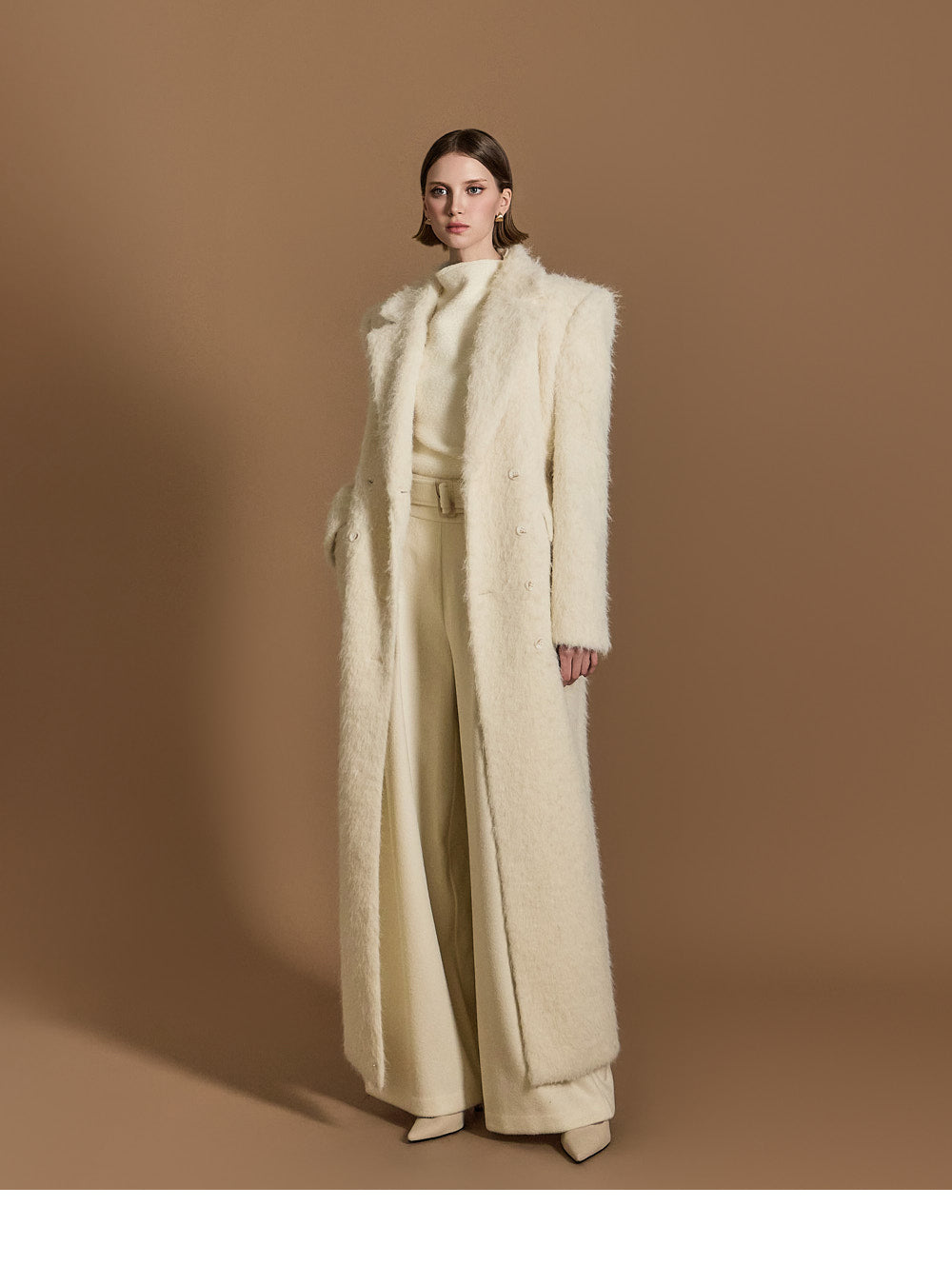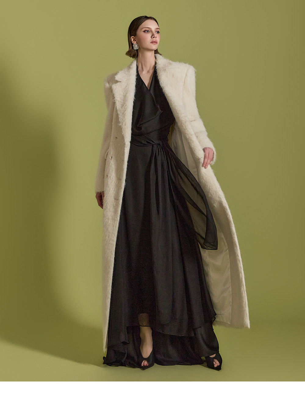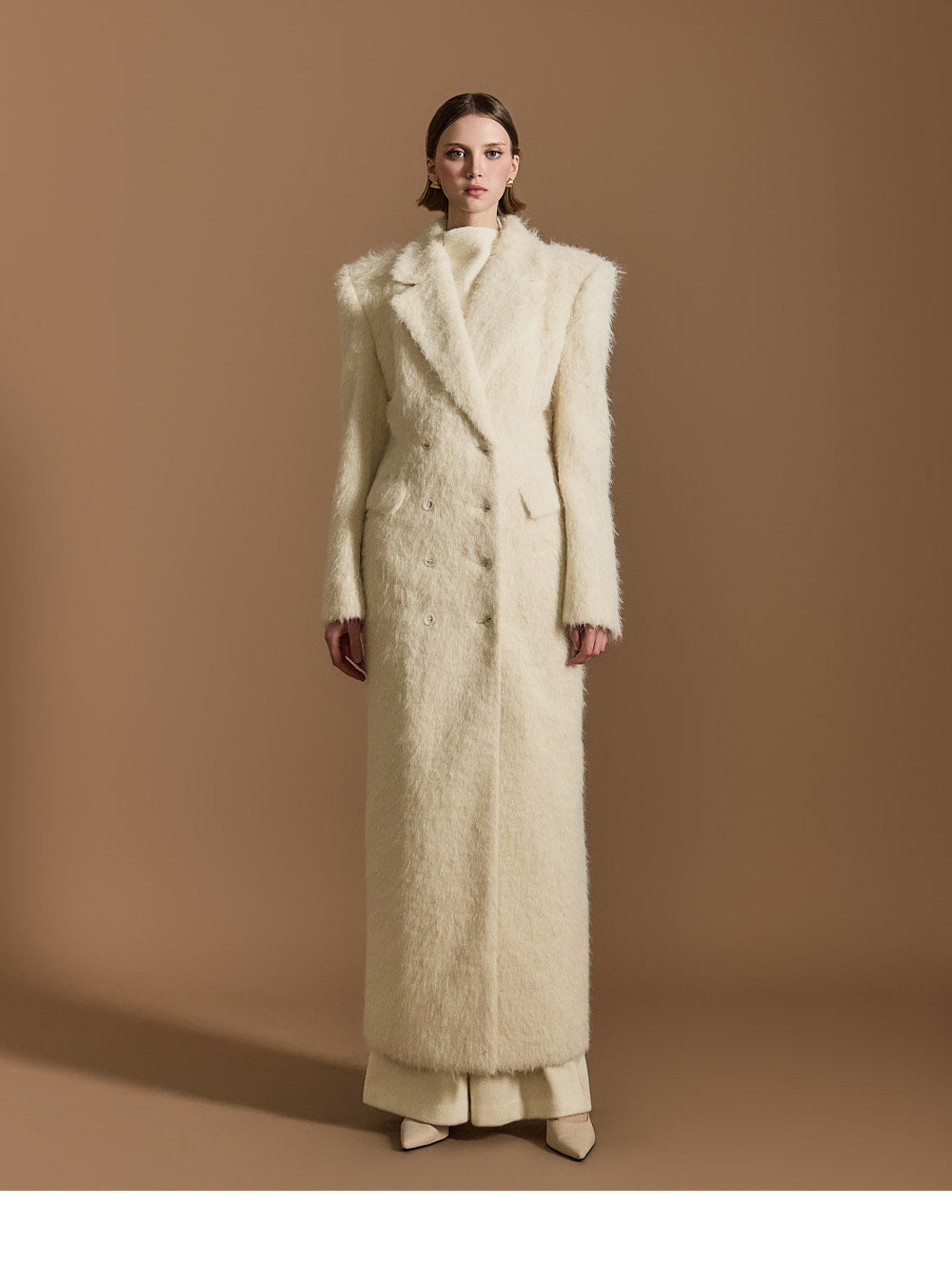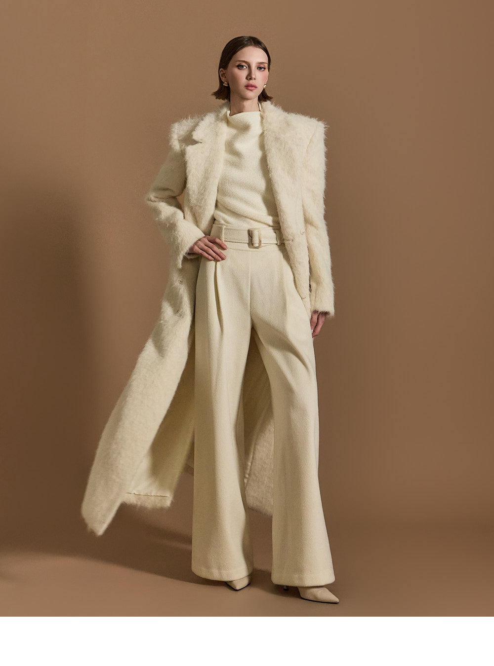 すっきりとしたラインのロングコートは、秋冬のスタイリッシュな装いにぴったりです。