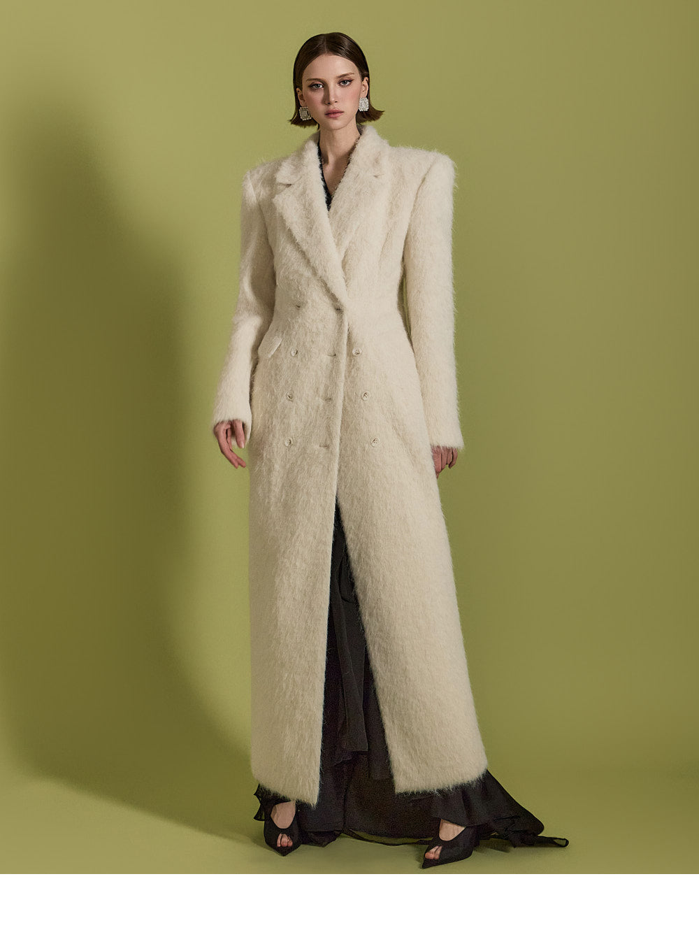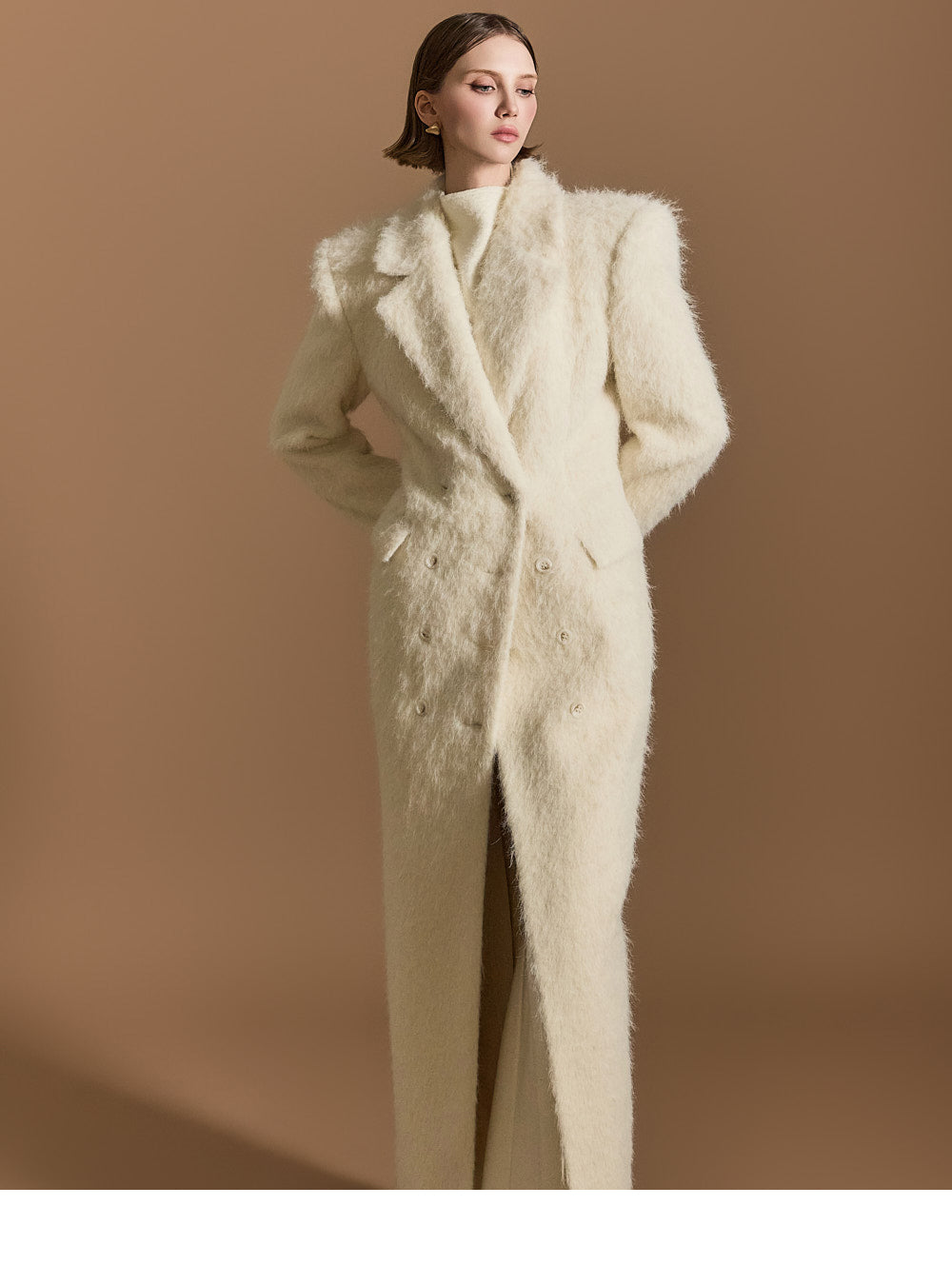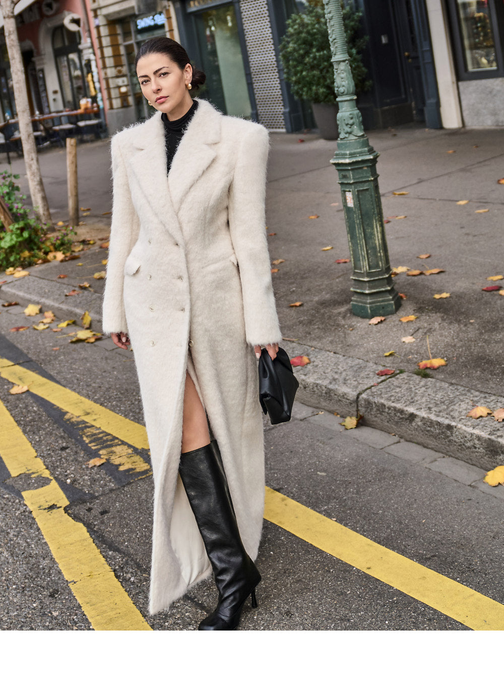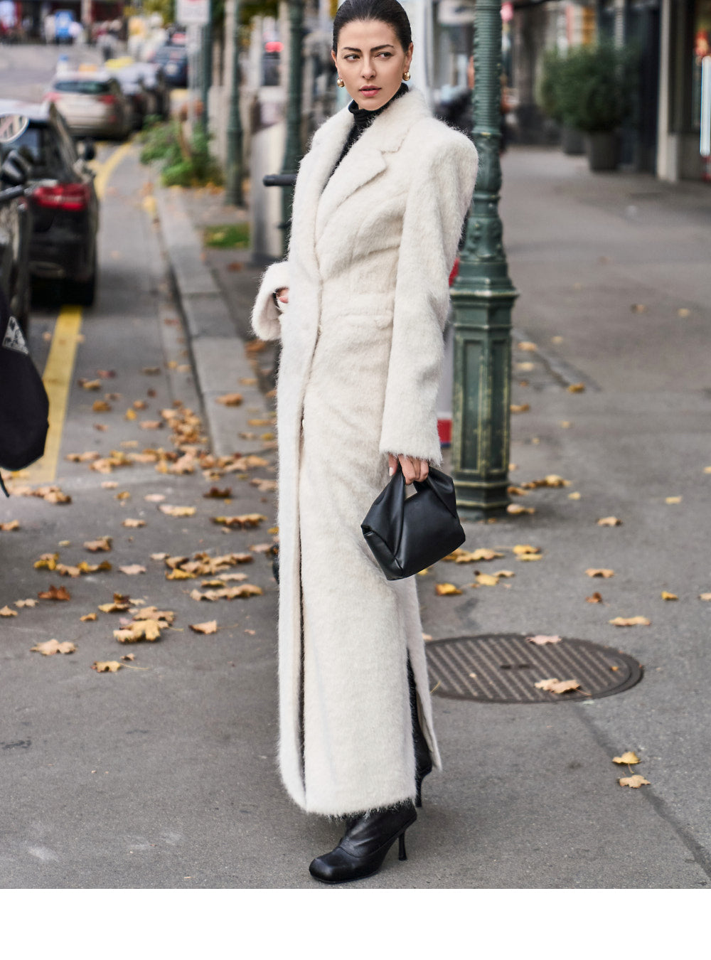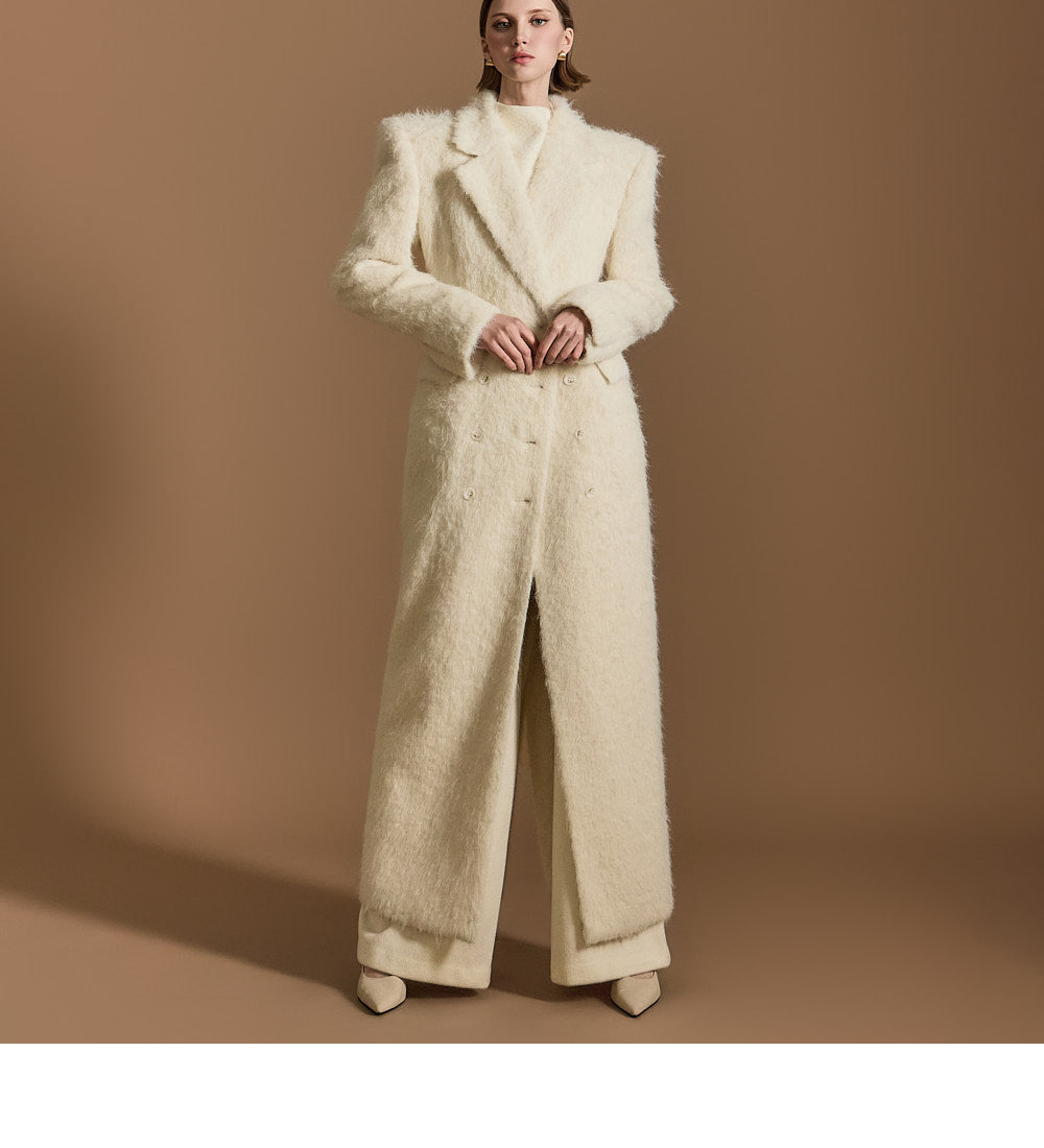 すっきりとしたラインのロングコートは、秋冬のスタイリッシュな装いにぴったりです。