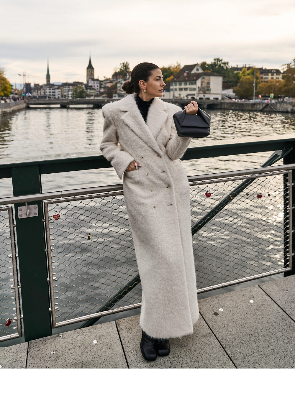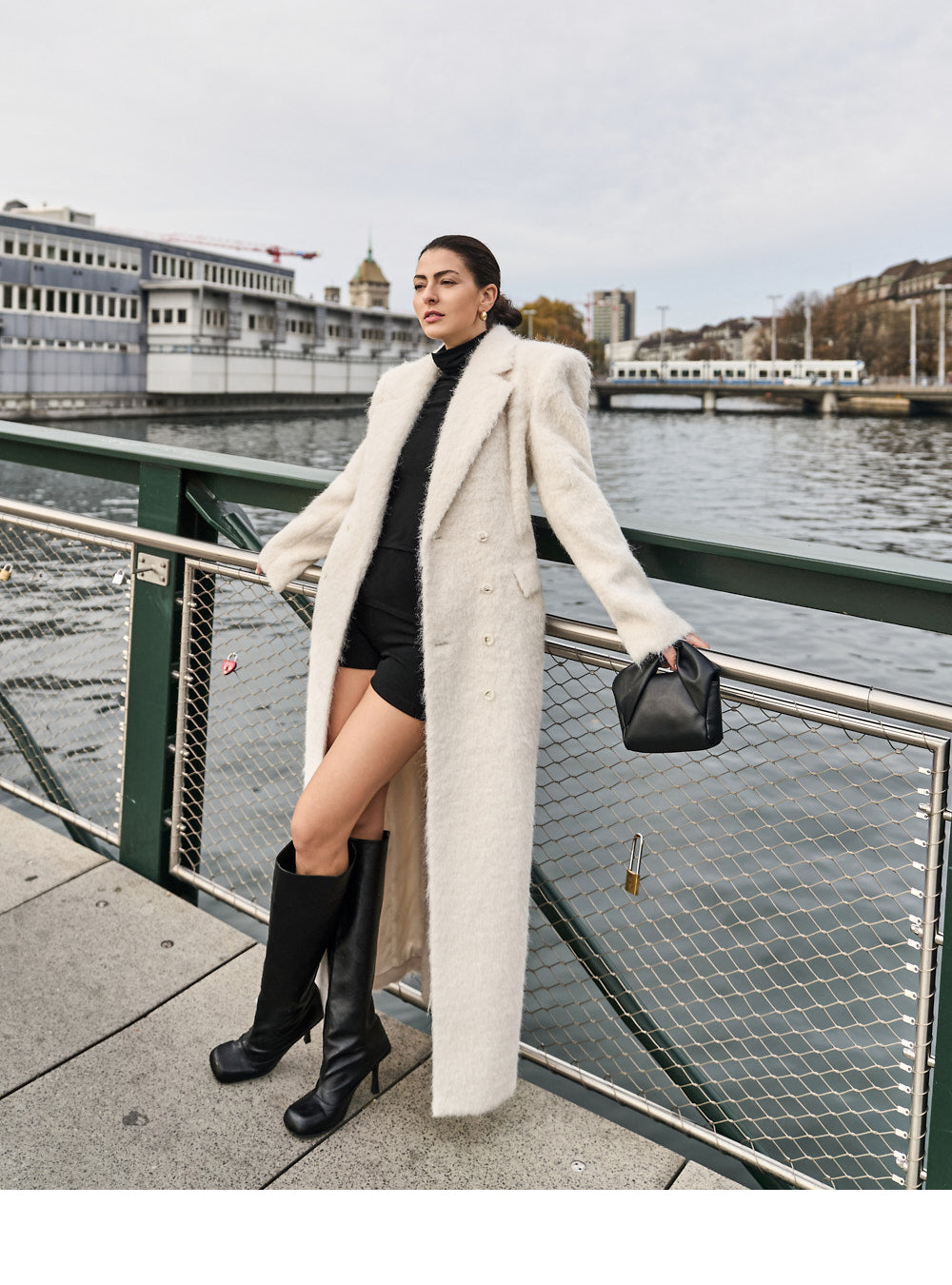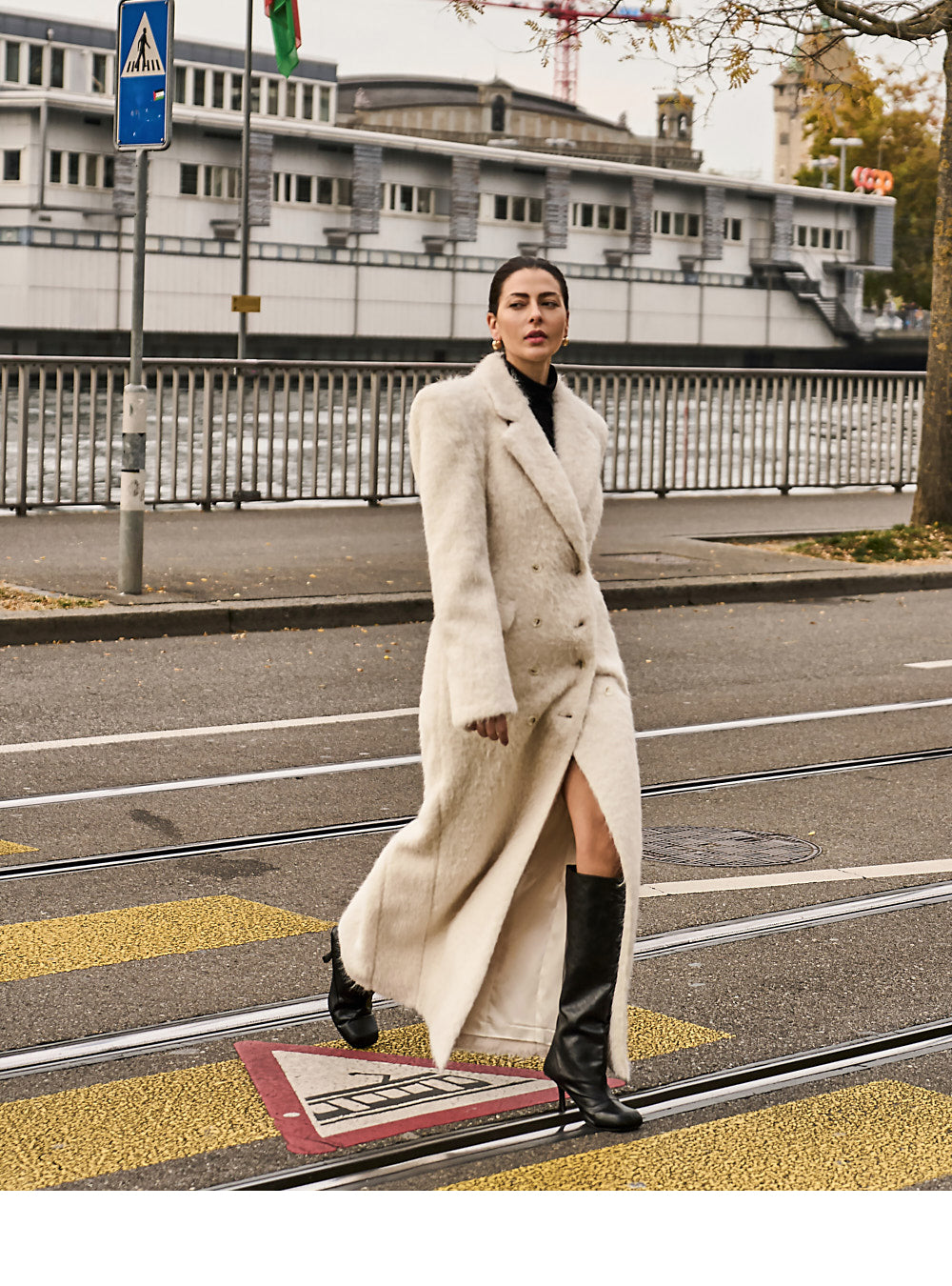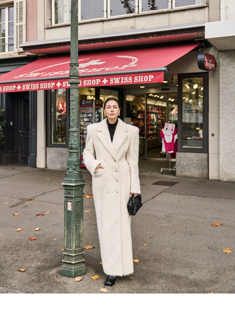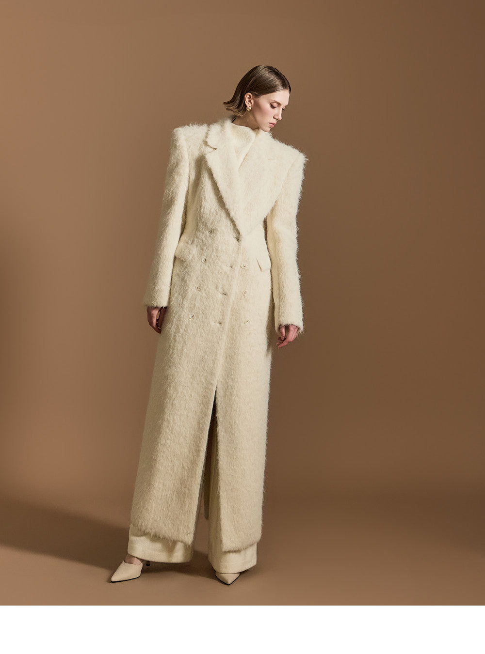 すっきりとしたラインのロングコートは、秋冬のスタイリッシュな装いにぴったりです。