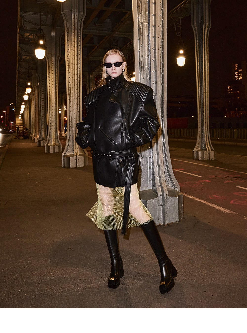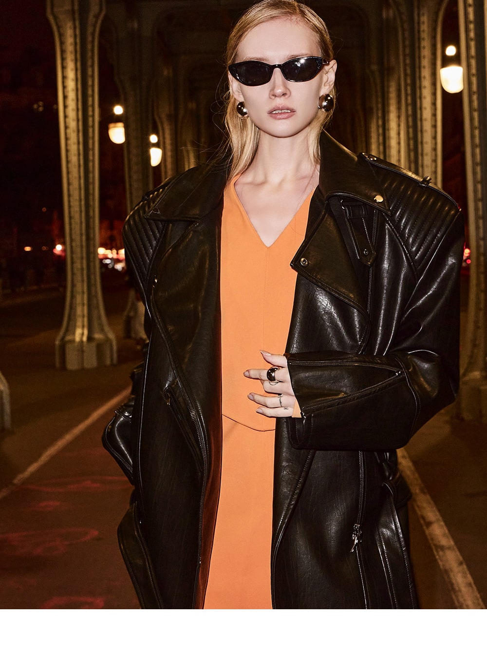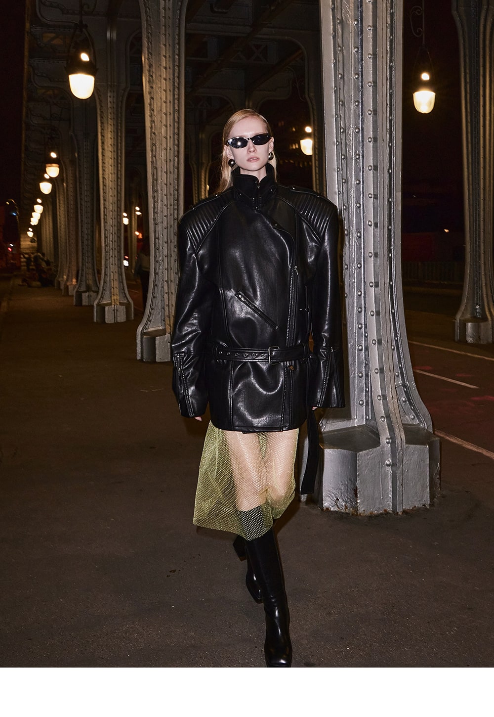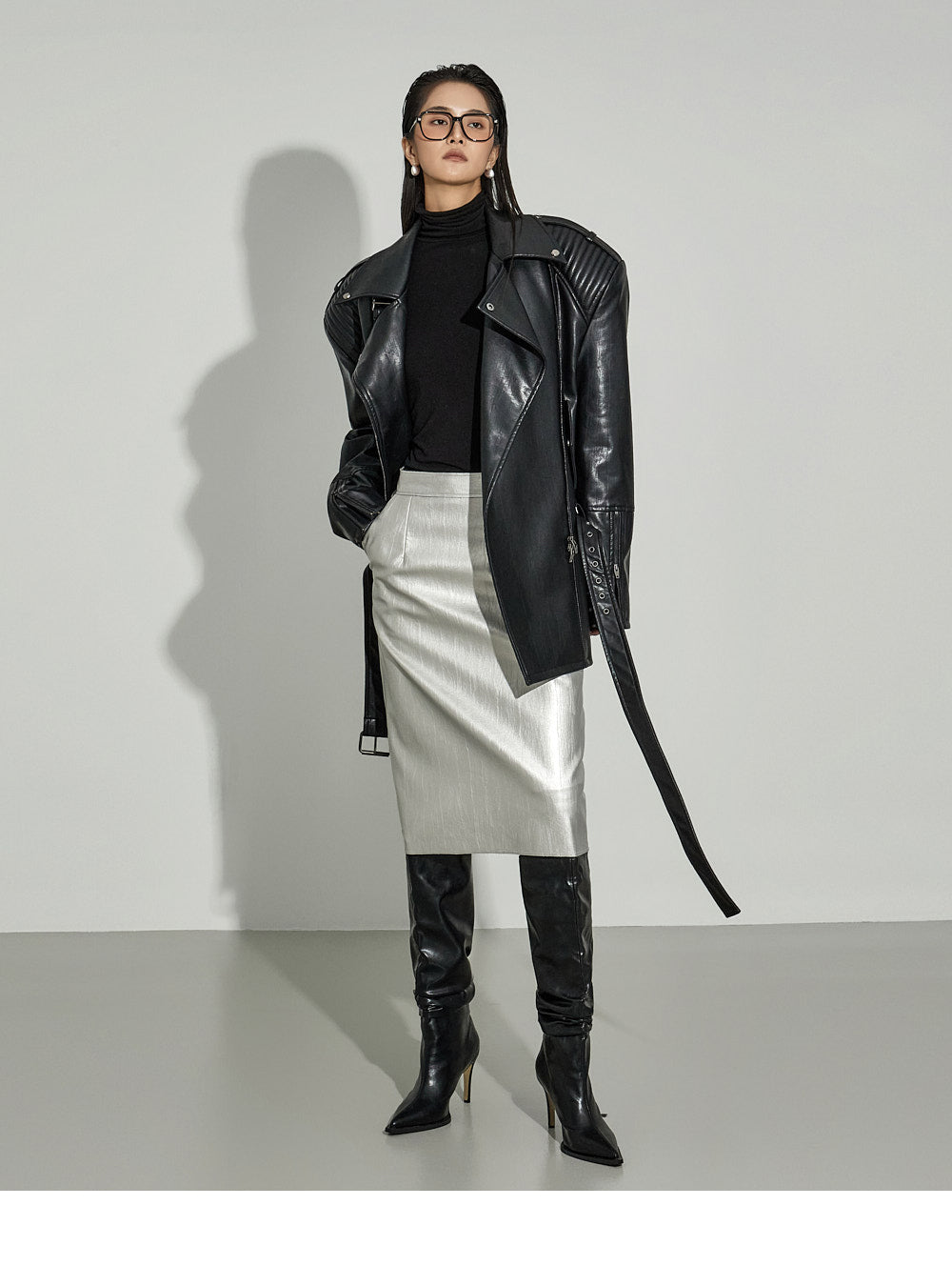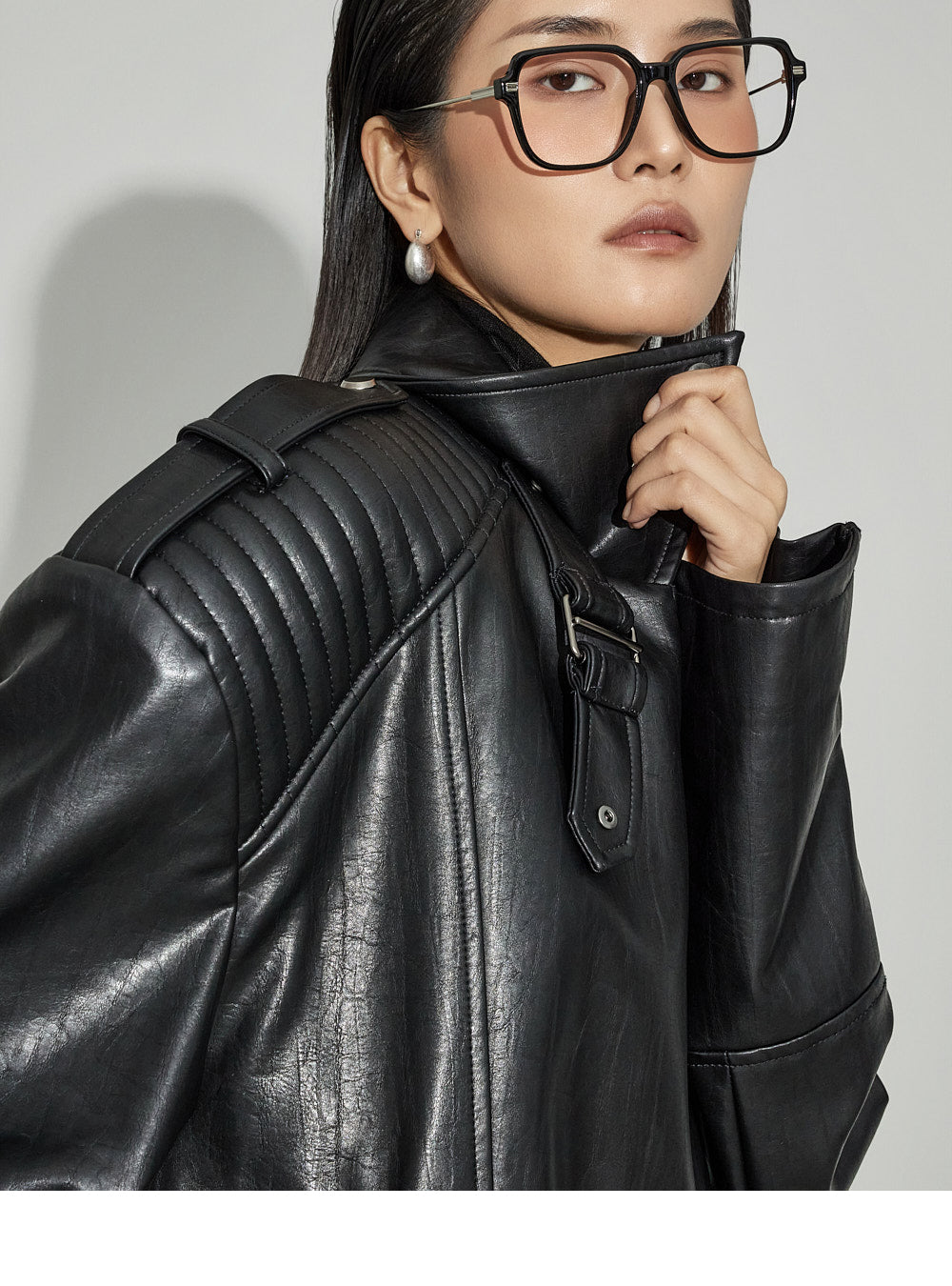 「ハイネックショルダーピンタックレザーライダースジャケット」