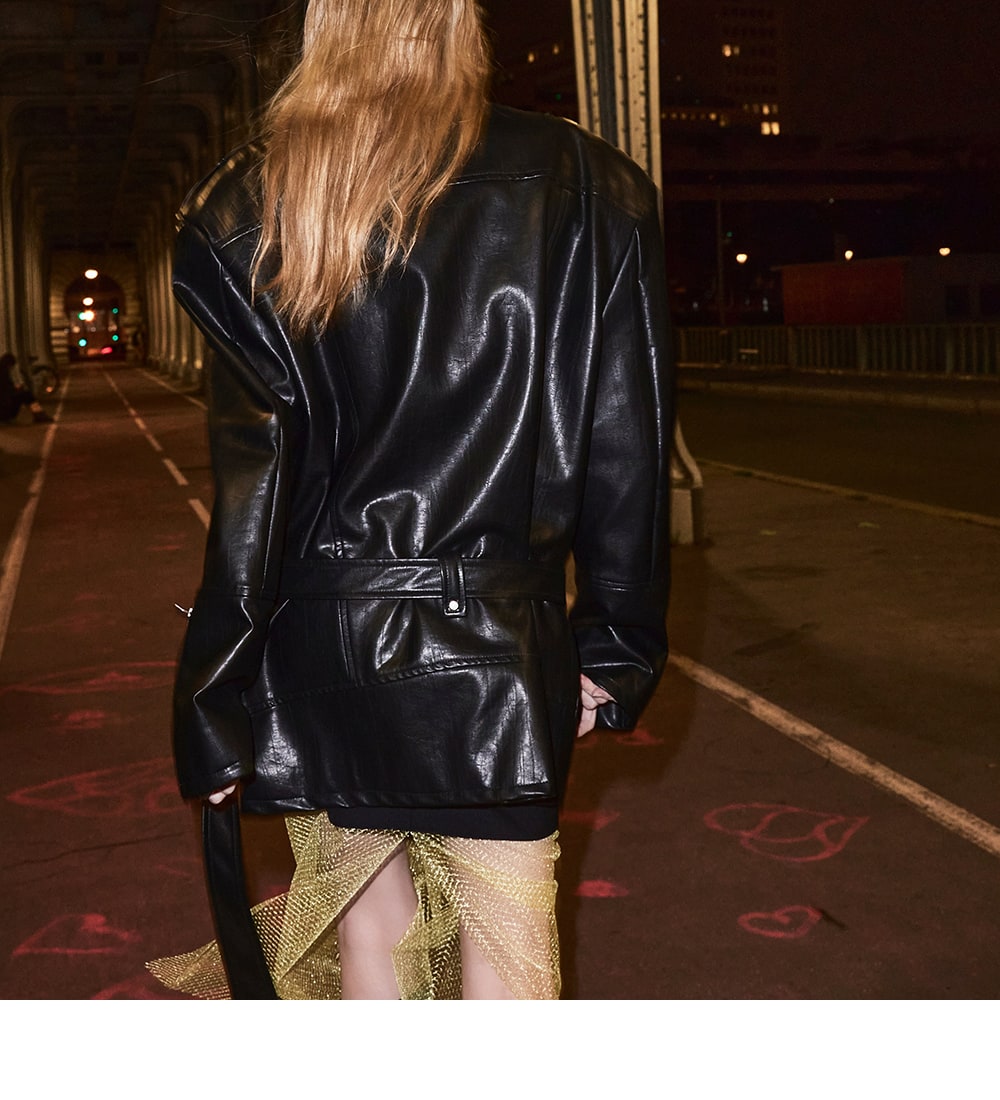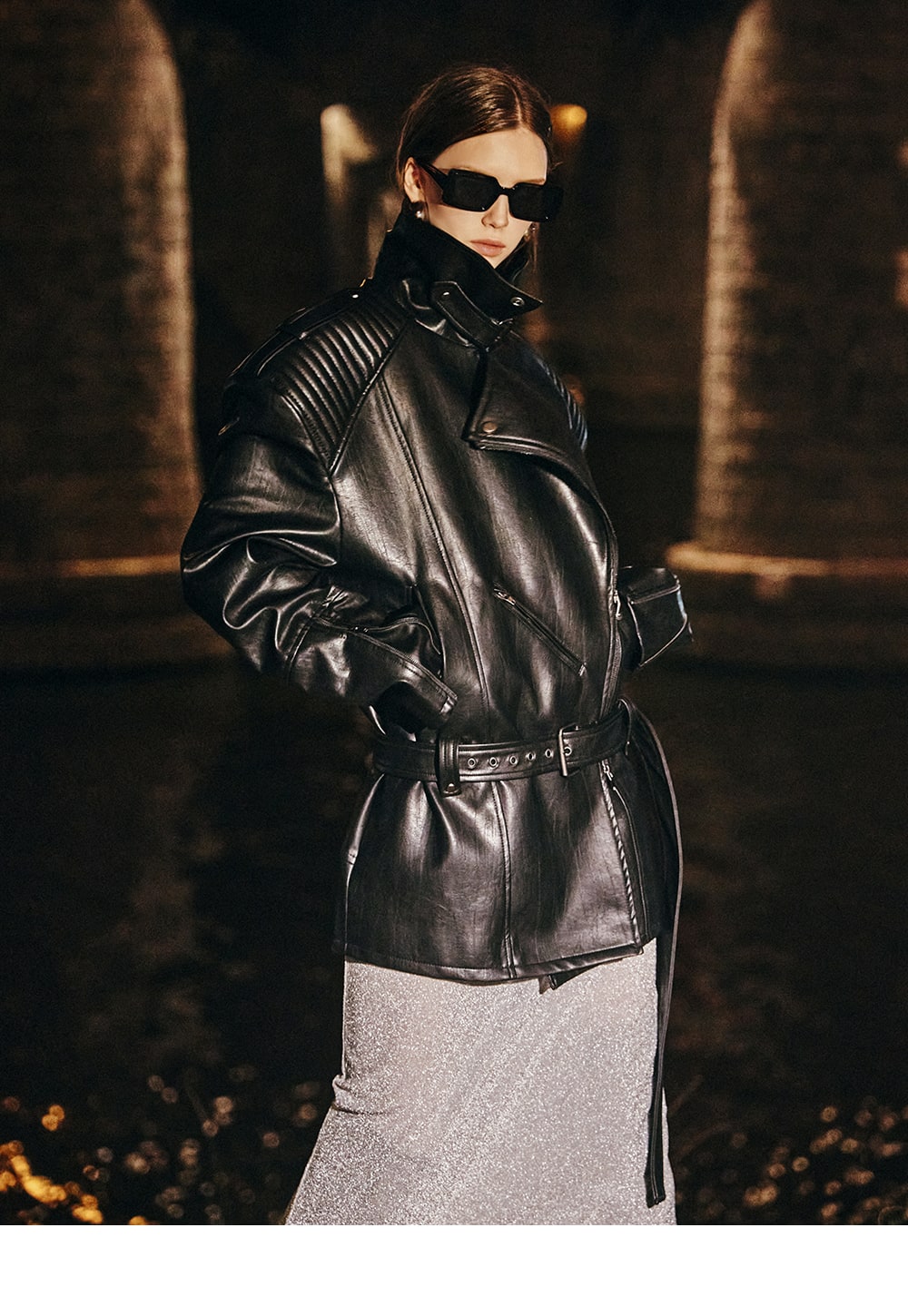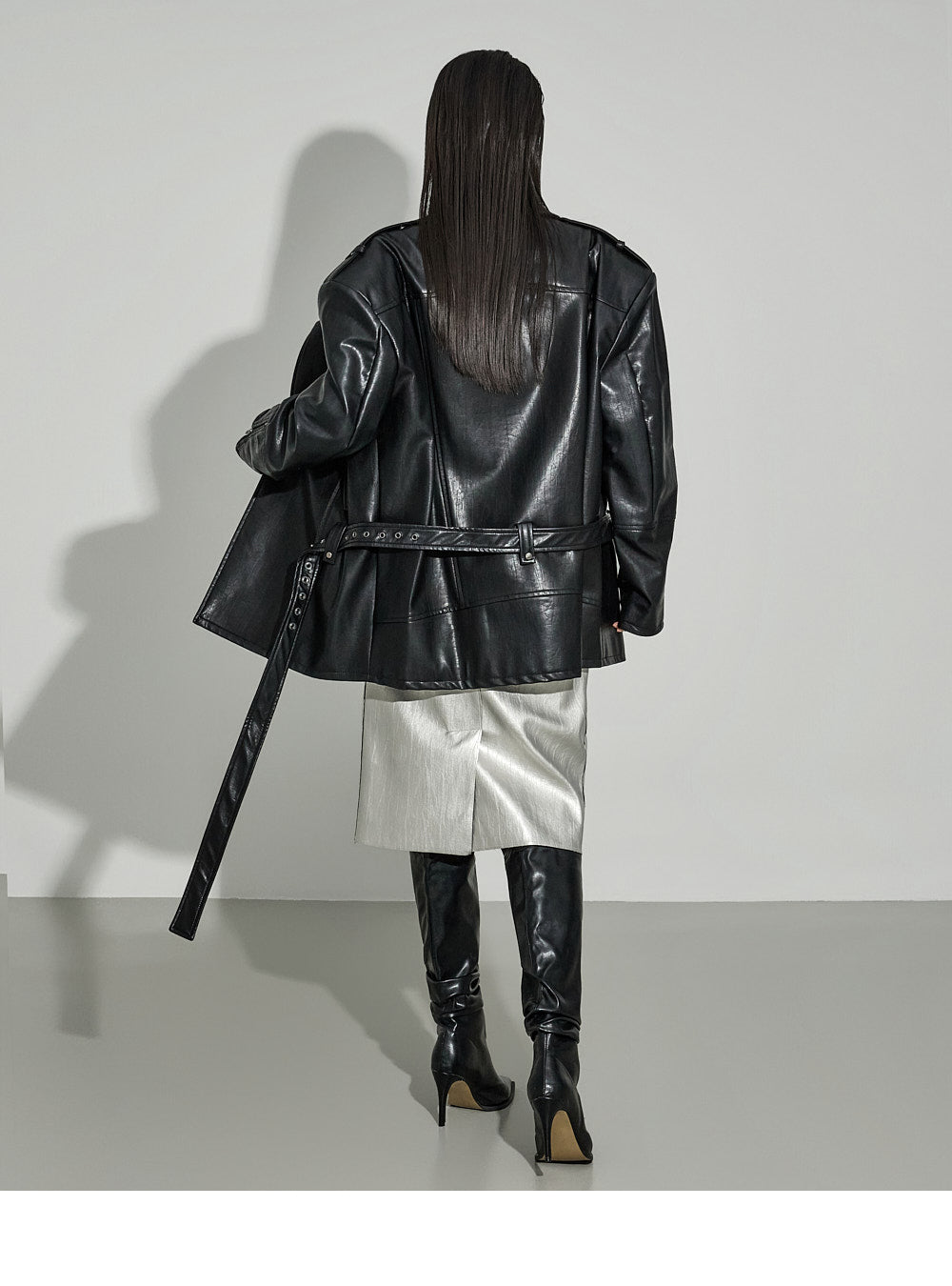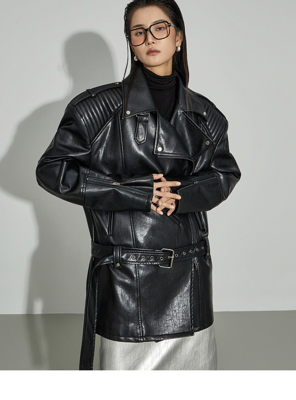 MBDJ018 ハイネックショルダーピンタックレザーライダースジャケット(ベルトセット)