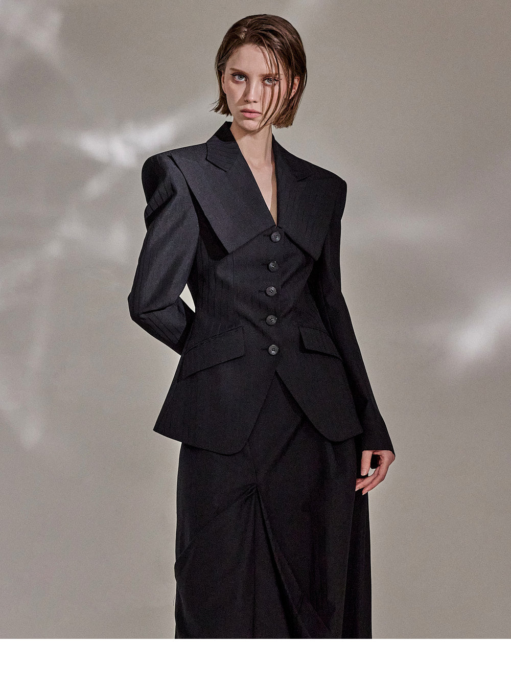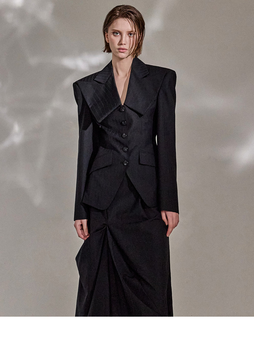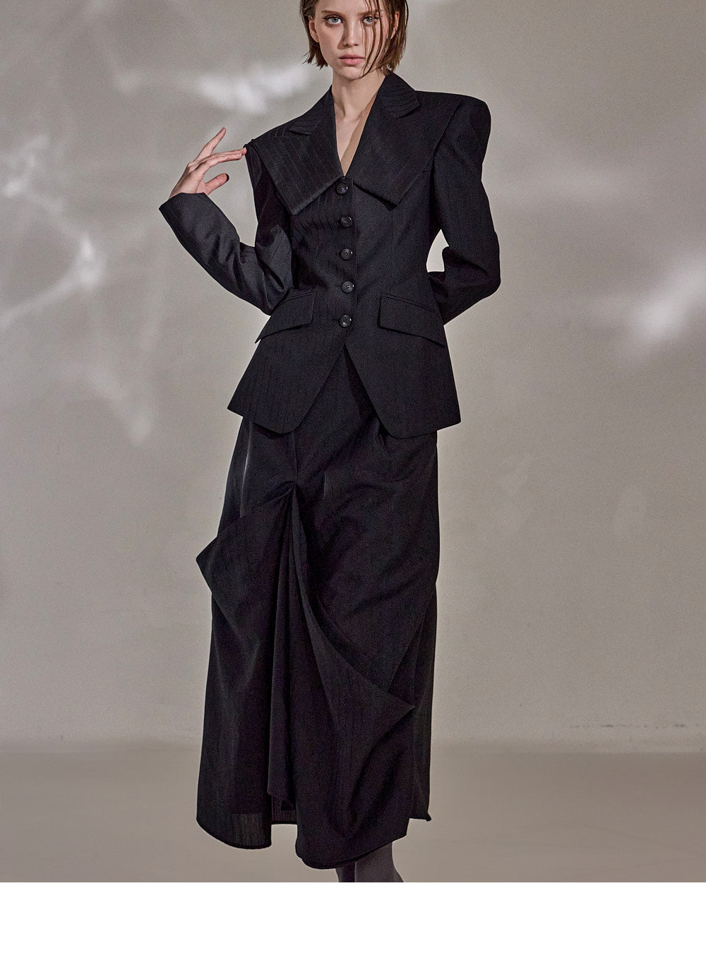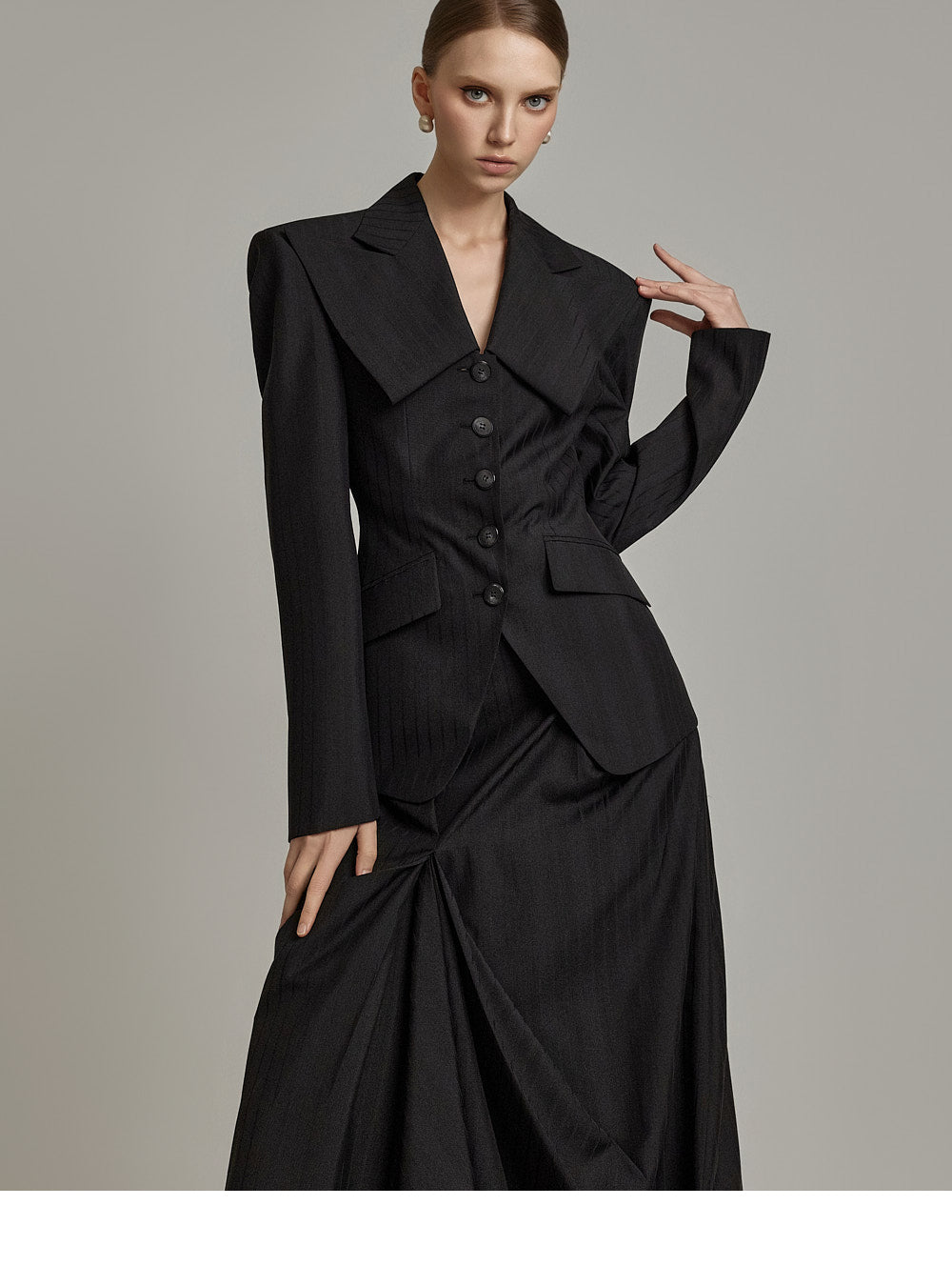 このジャケットは、柔らかい印象を与える幅広のラペルカラーが特徴です。