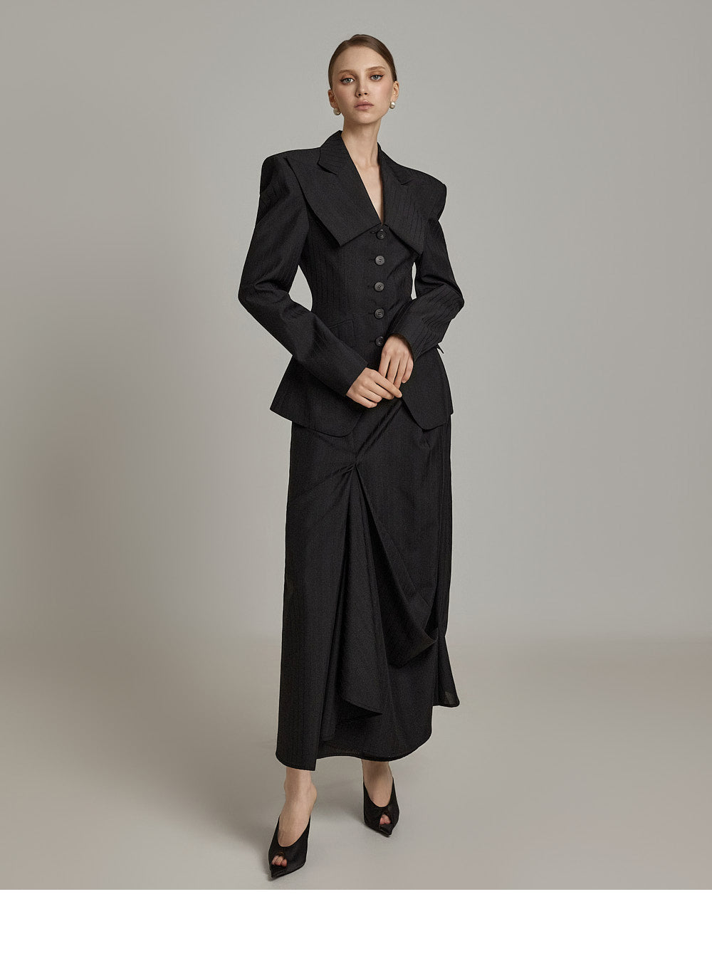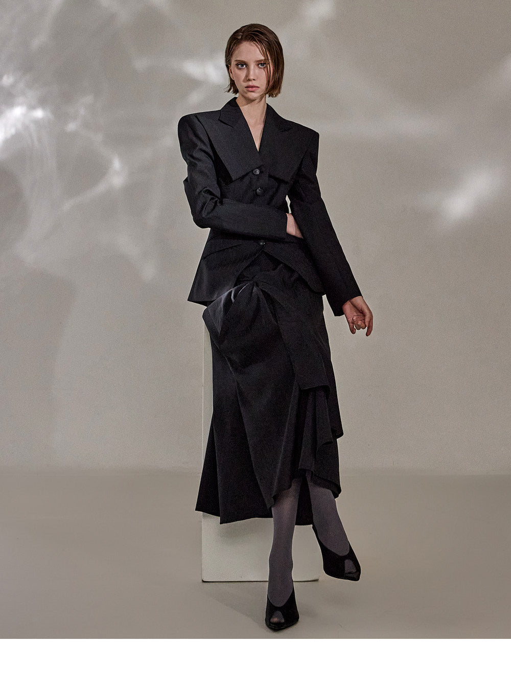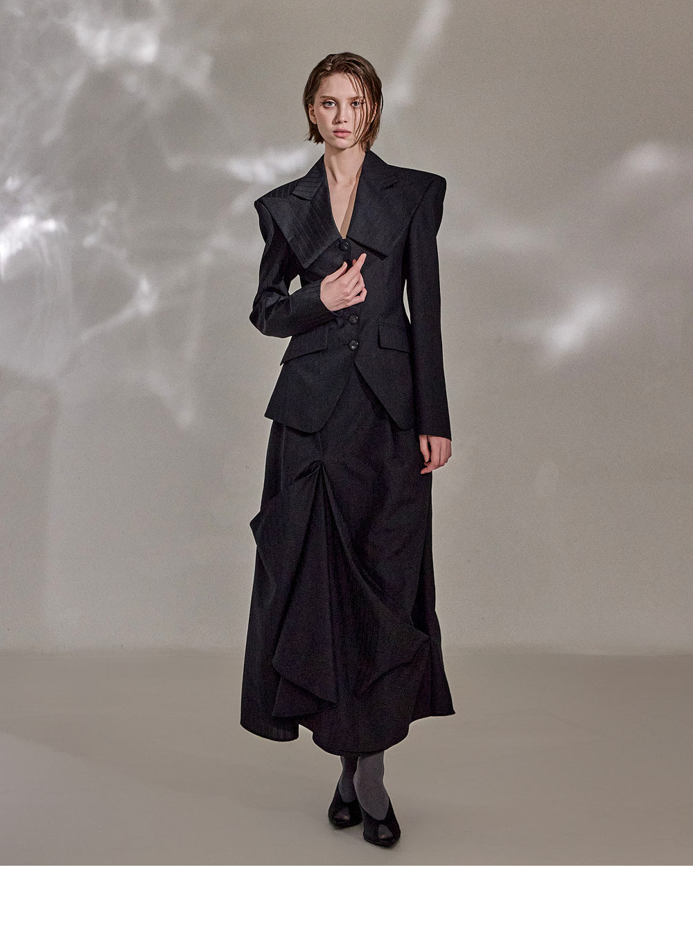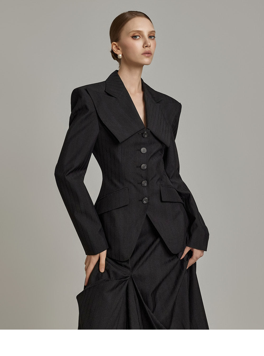 このジャケットは、柔らかい印象を与える幅広のラペルカラーが特徴です。