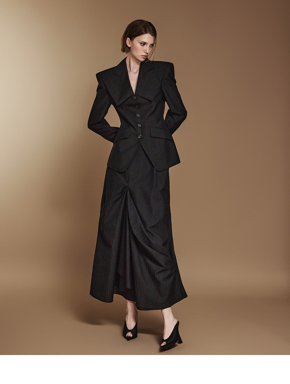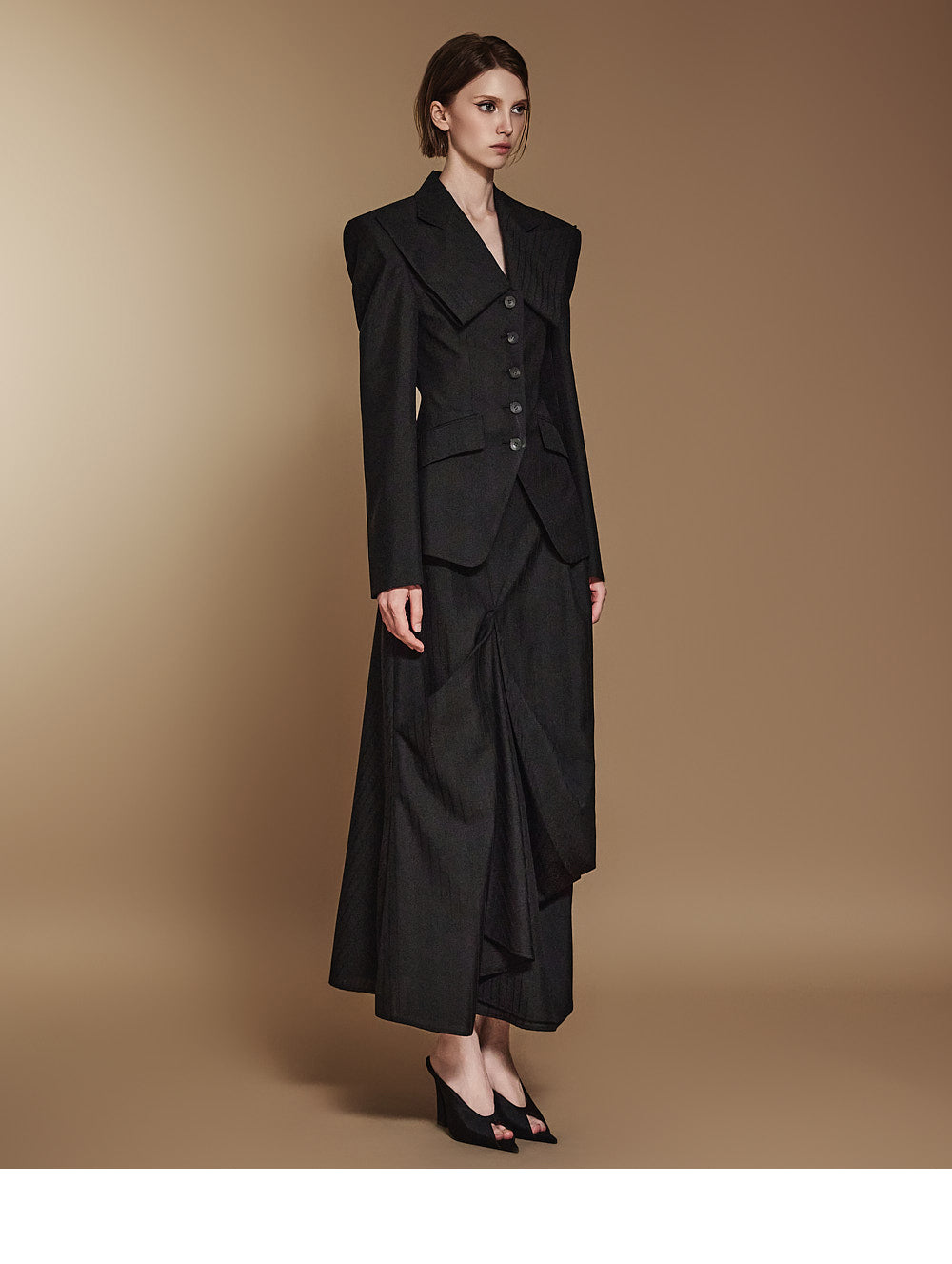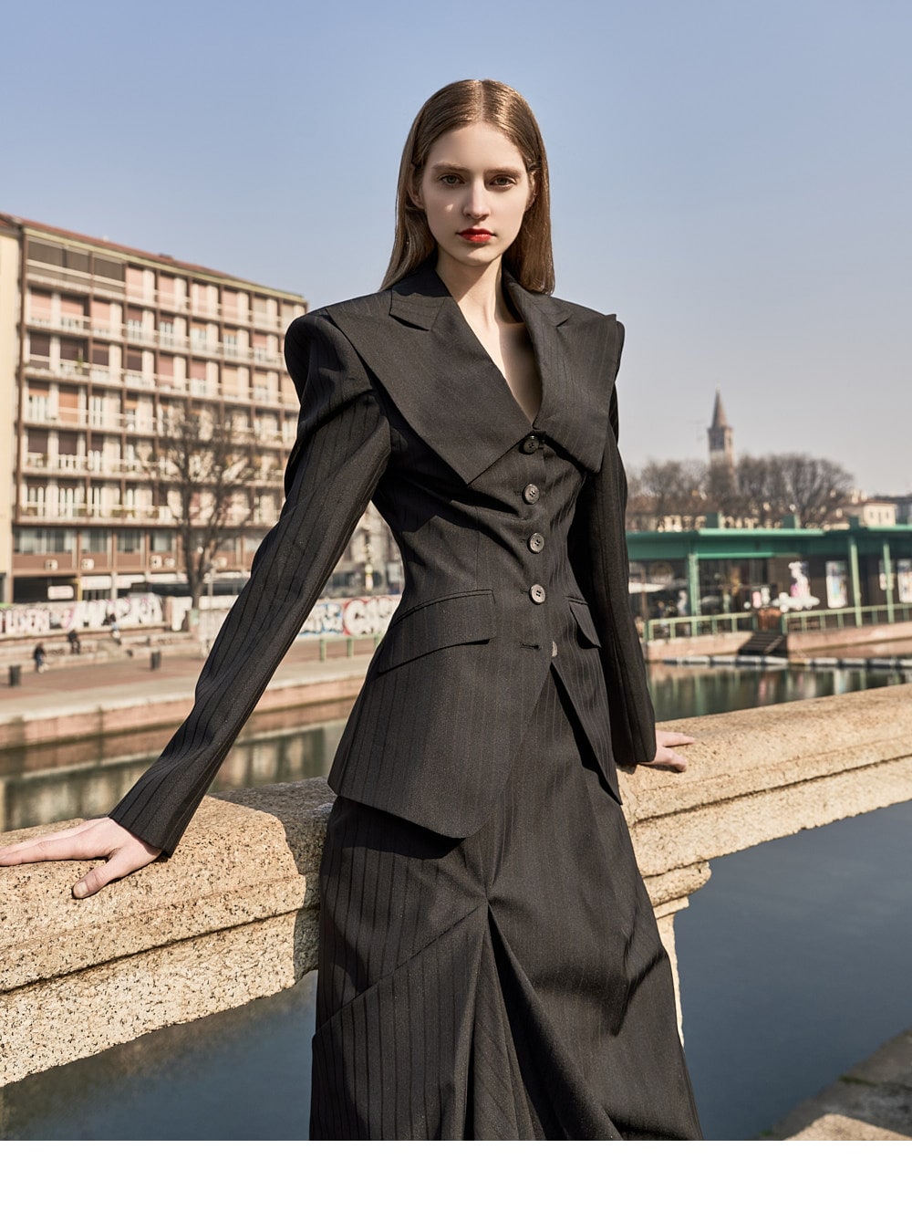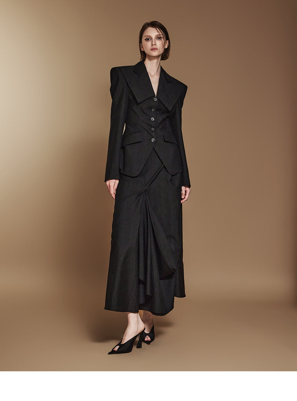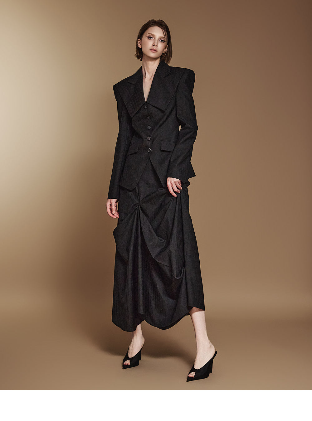 このジャケットは、柔らかい印象を与える幅広のラペルカラーが特徴です。