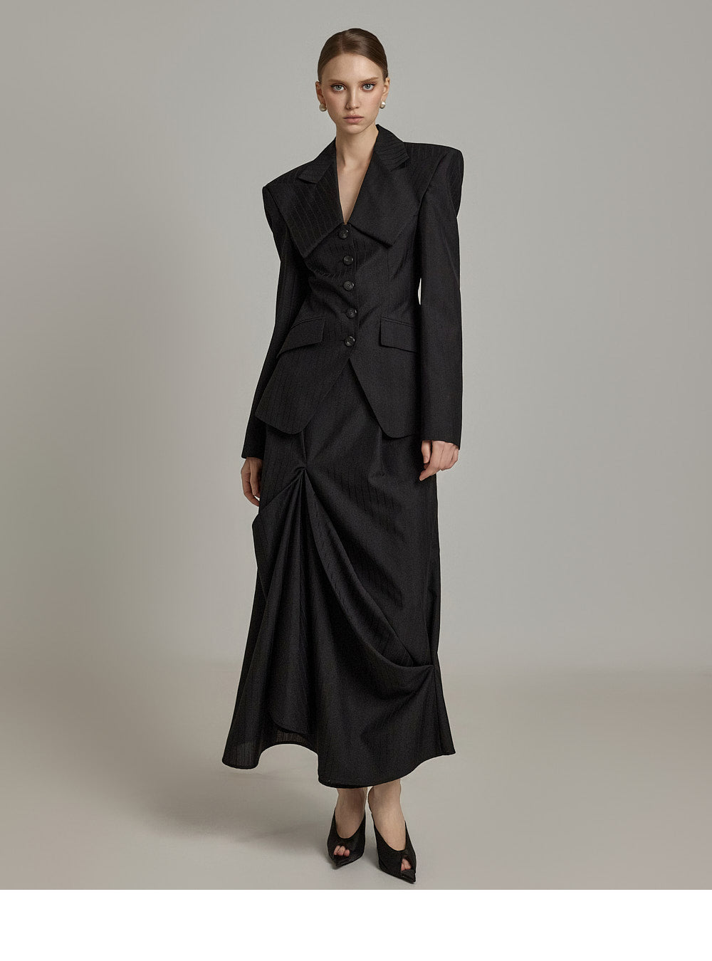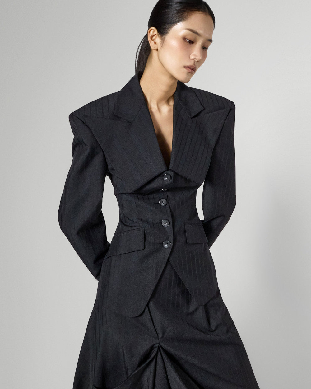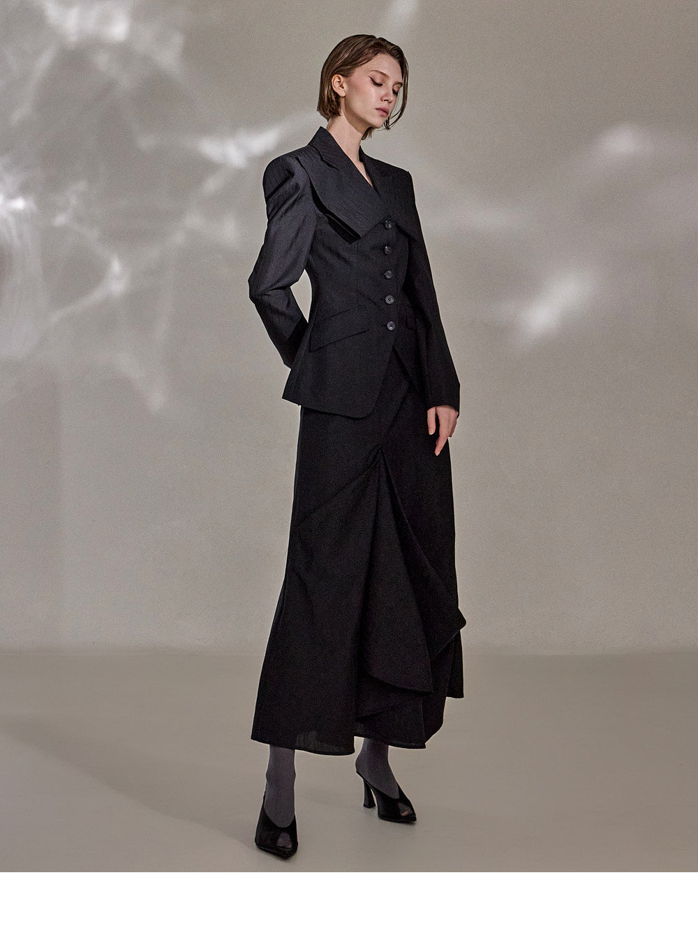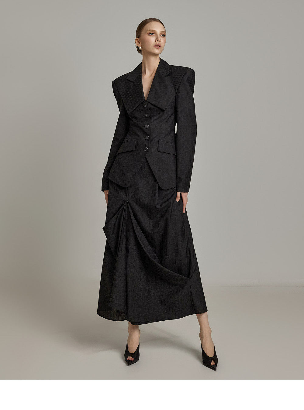 このジャケットは、柔らかい印象を与える幅広のラペルカラーが特徴です。