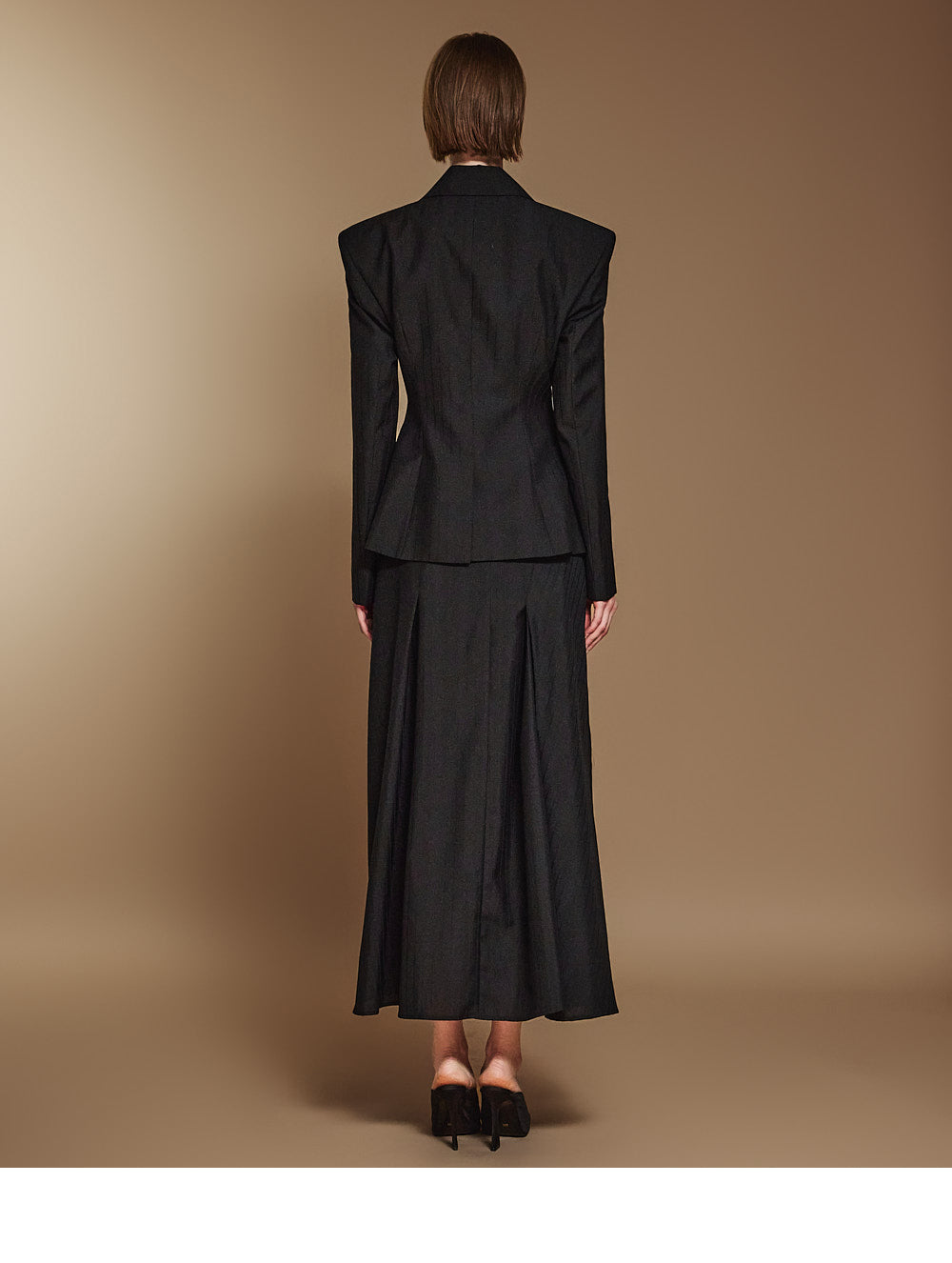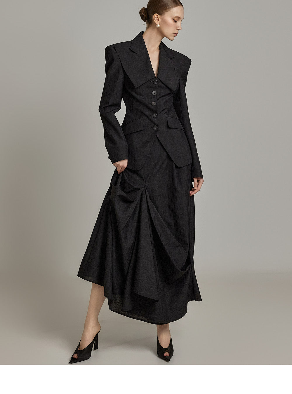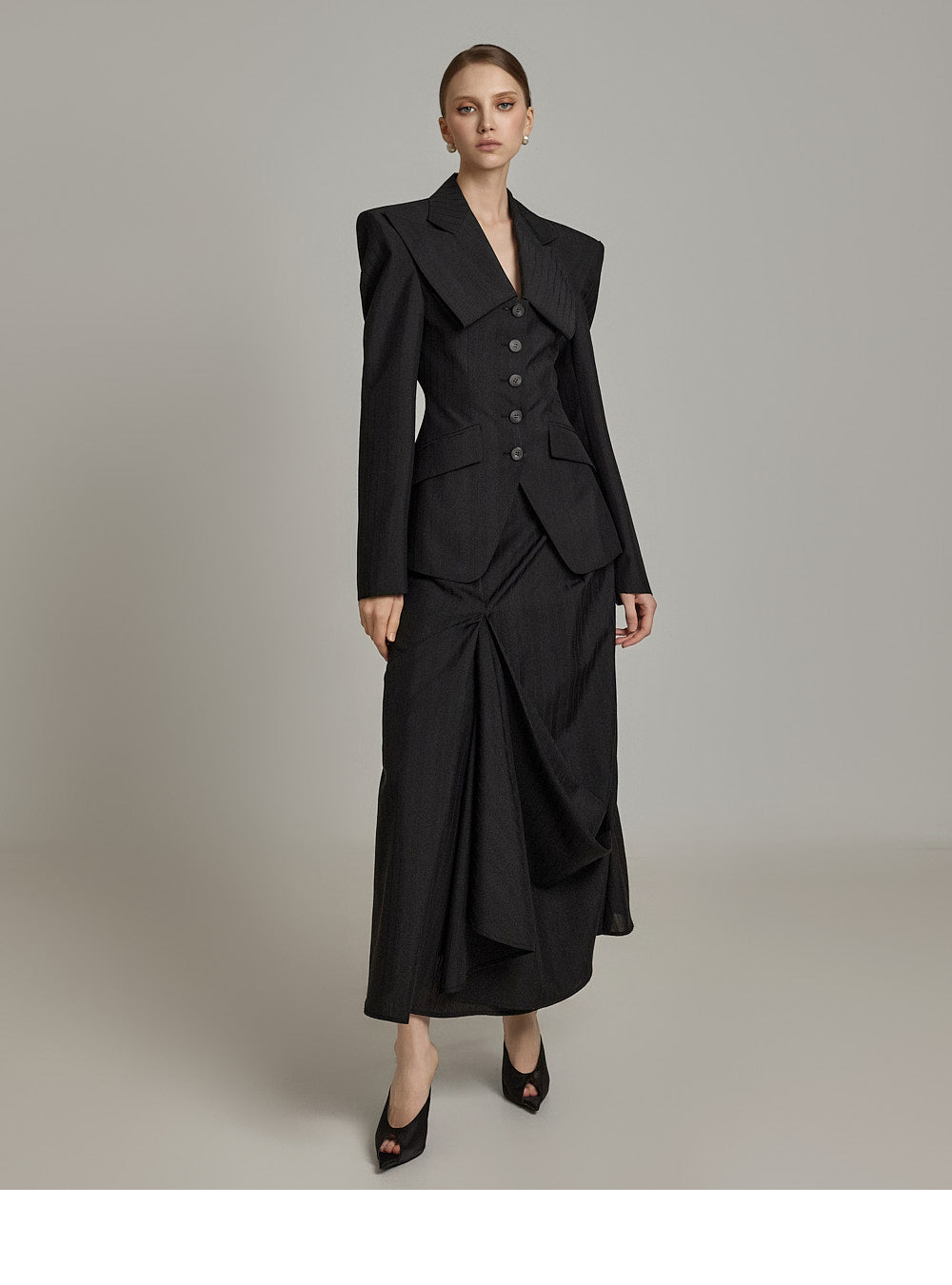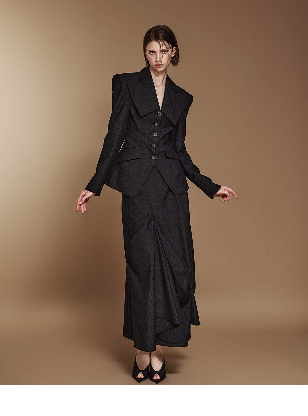 このジャケットは、柔らかい印象を与える幅広のラペルカラーが特徴です。