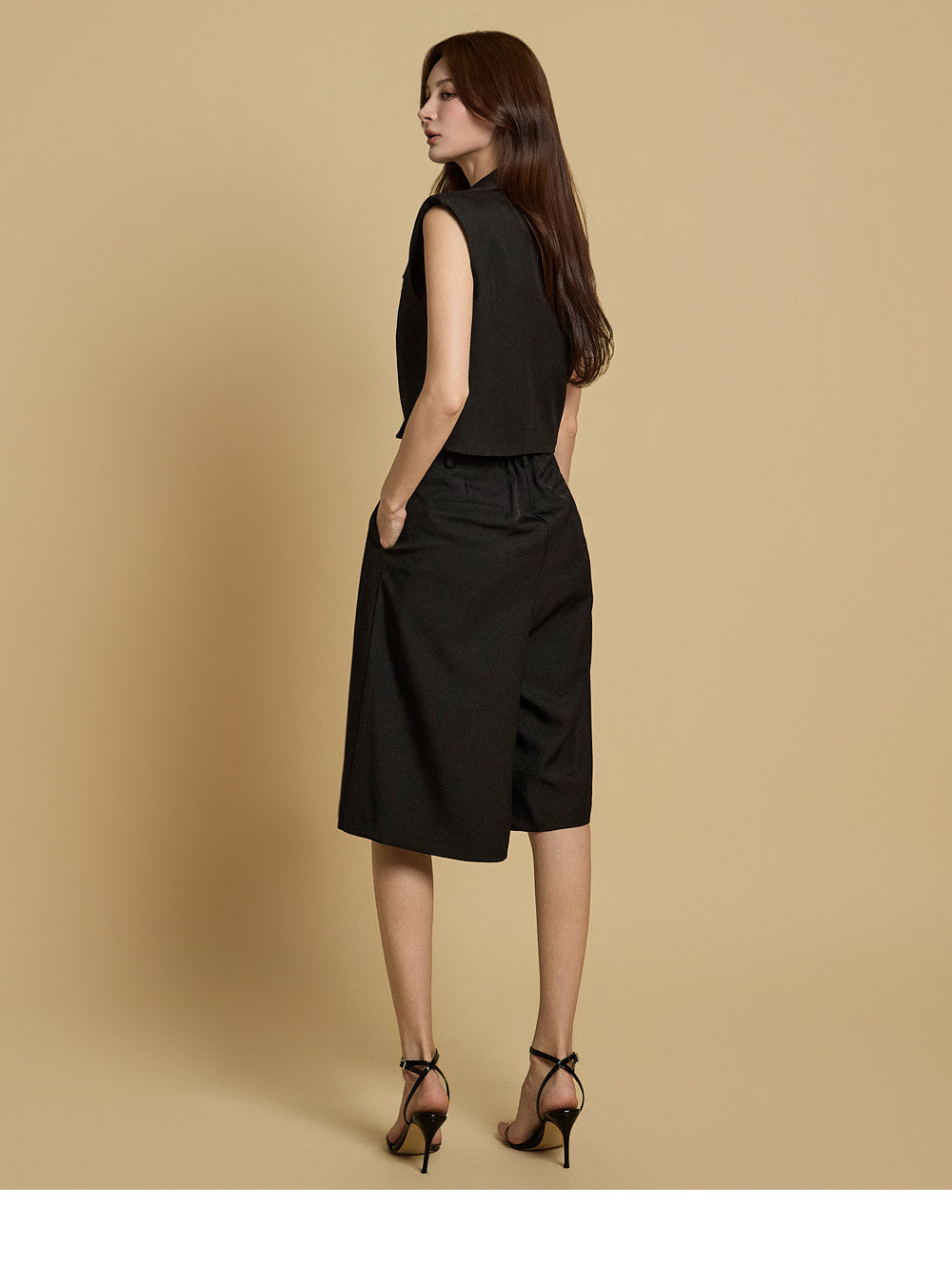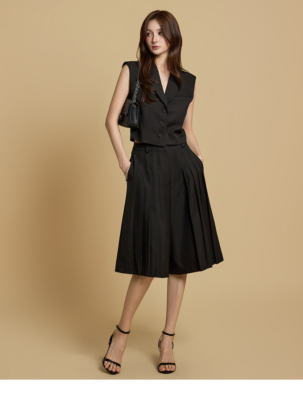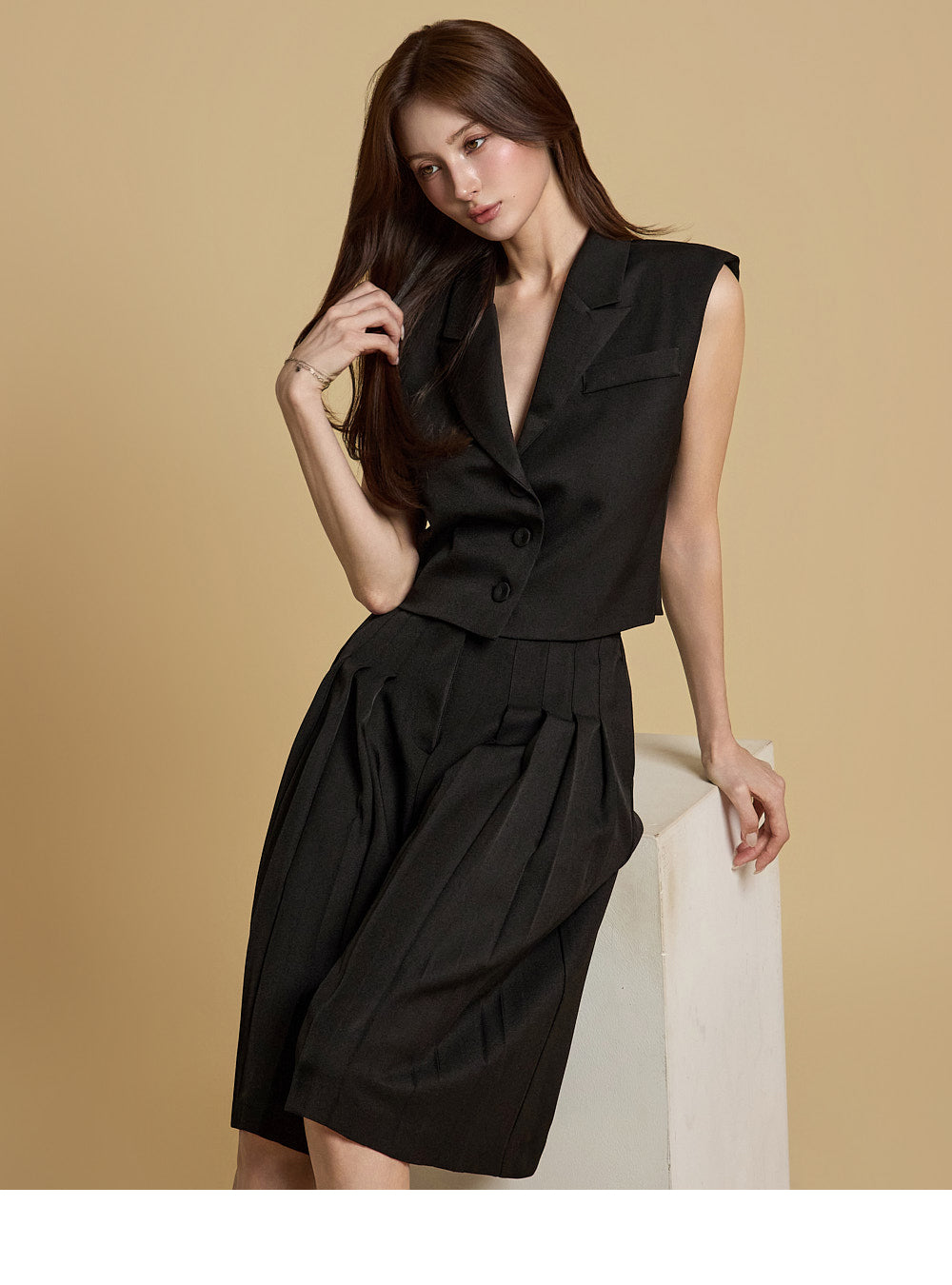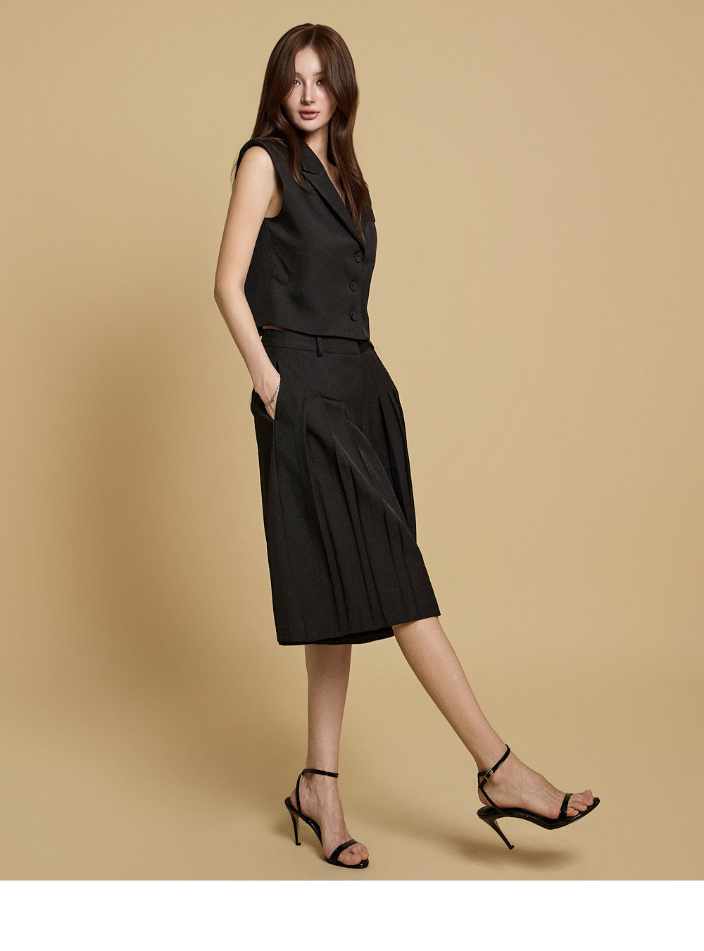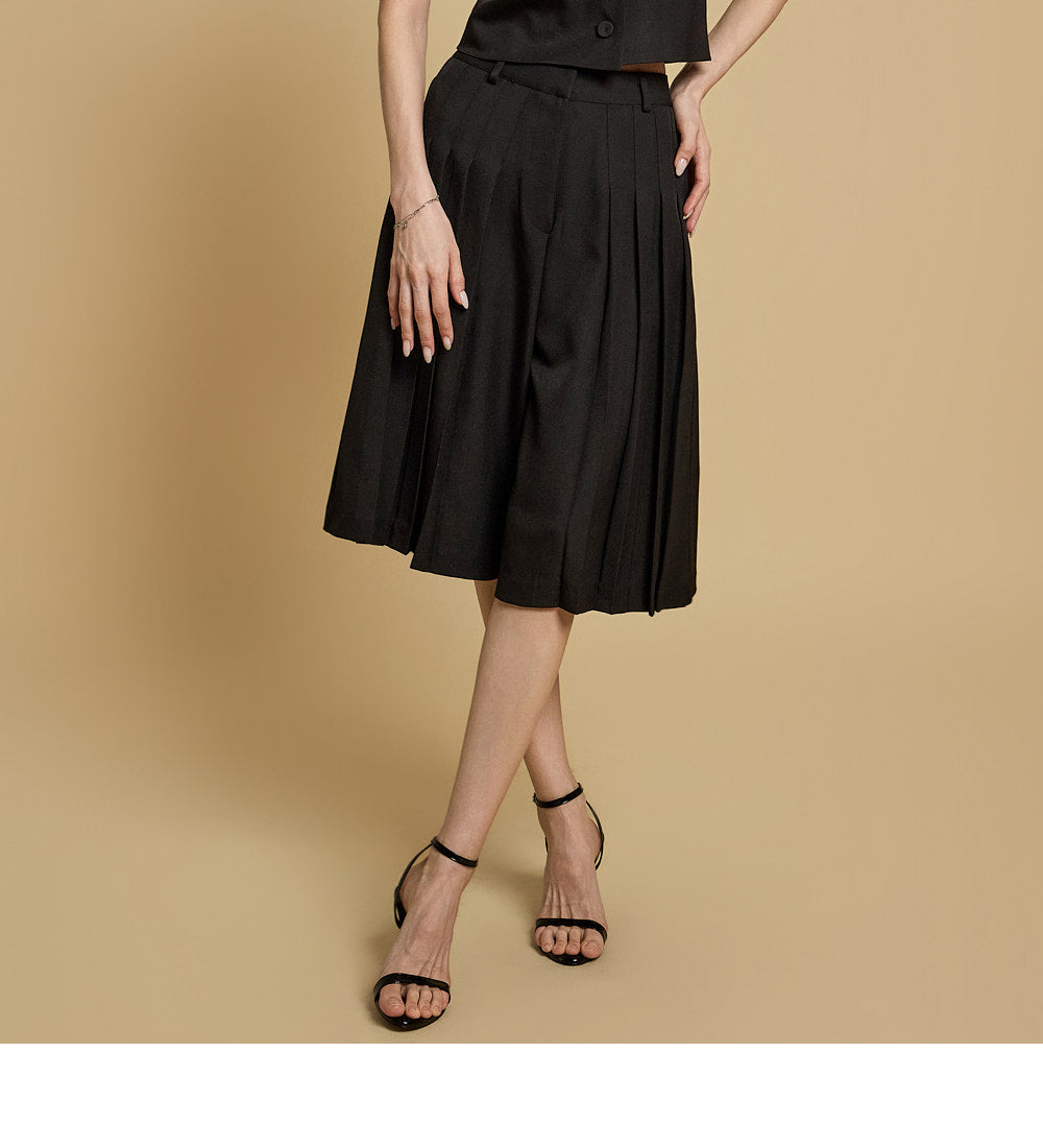 プリーツのディテールが自然な流れのフィット感を生み出し、