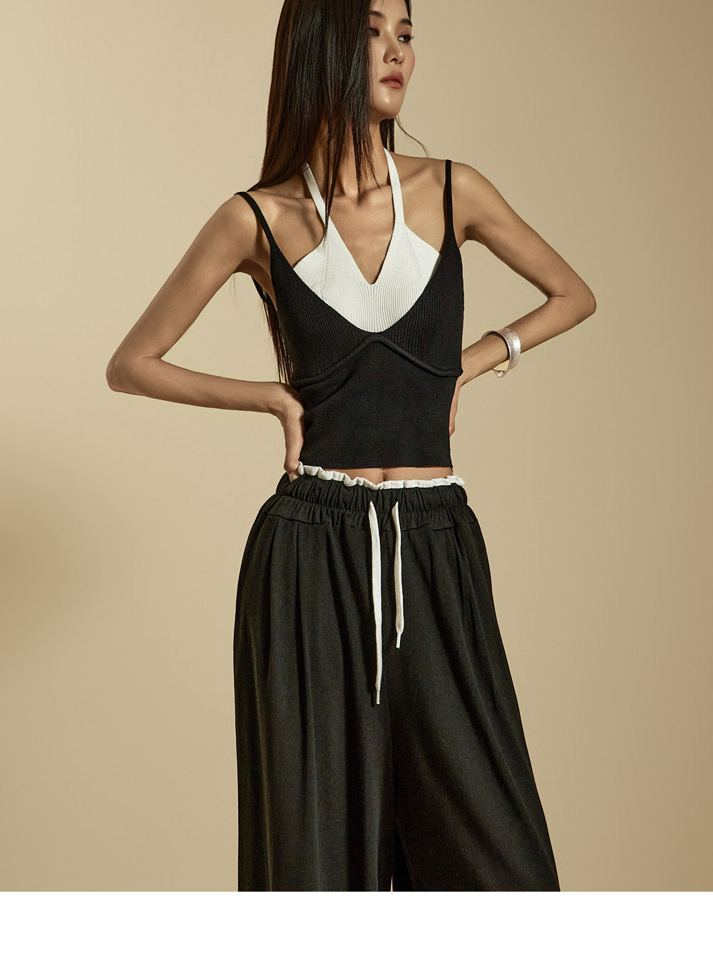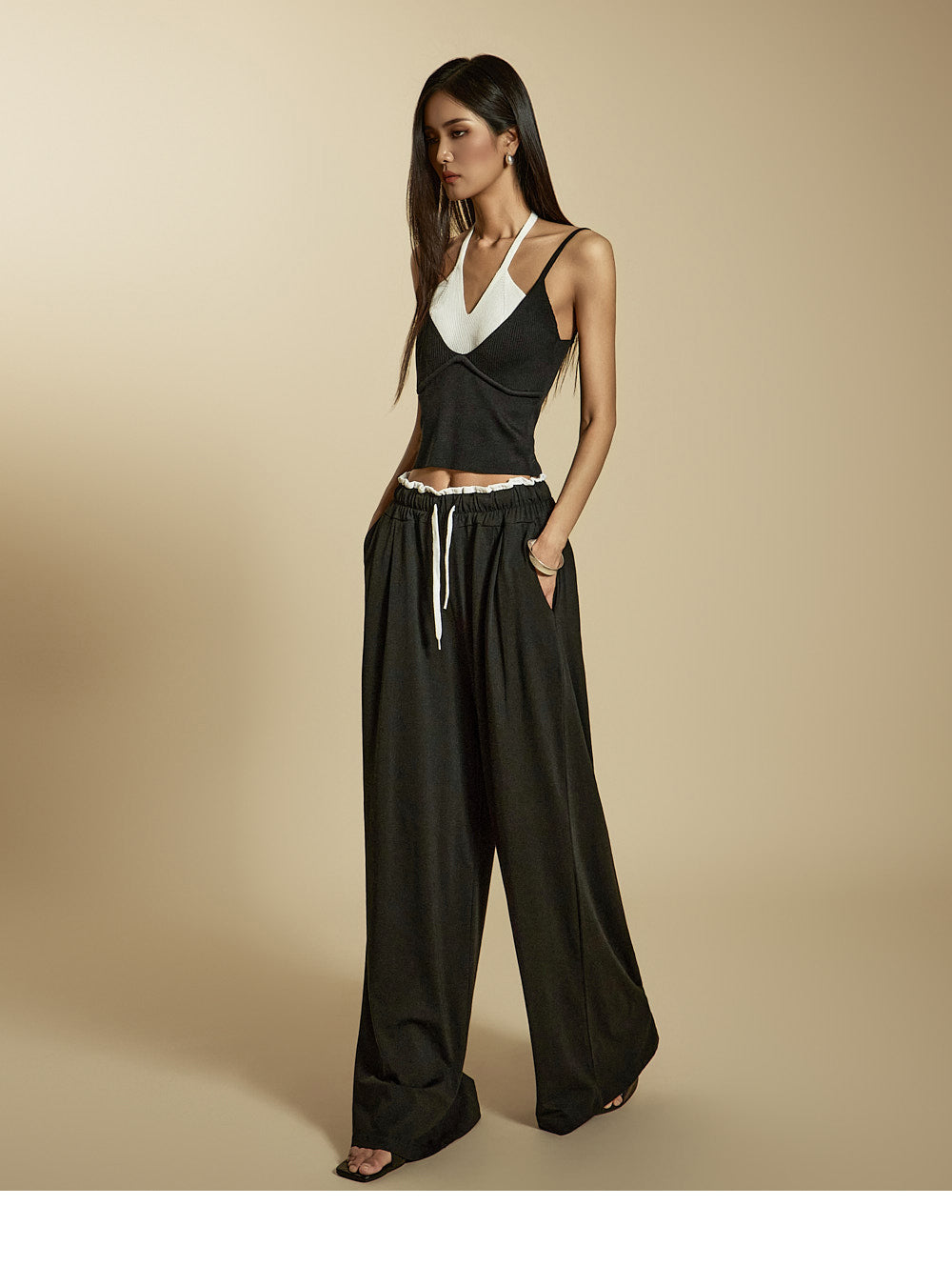 ハイライズのウエストバンドには、フィット感を調節できるドローストリングが付いており、サイドポケットがデザインに実用性を加えています。