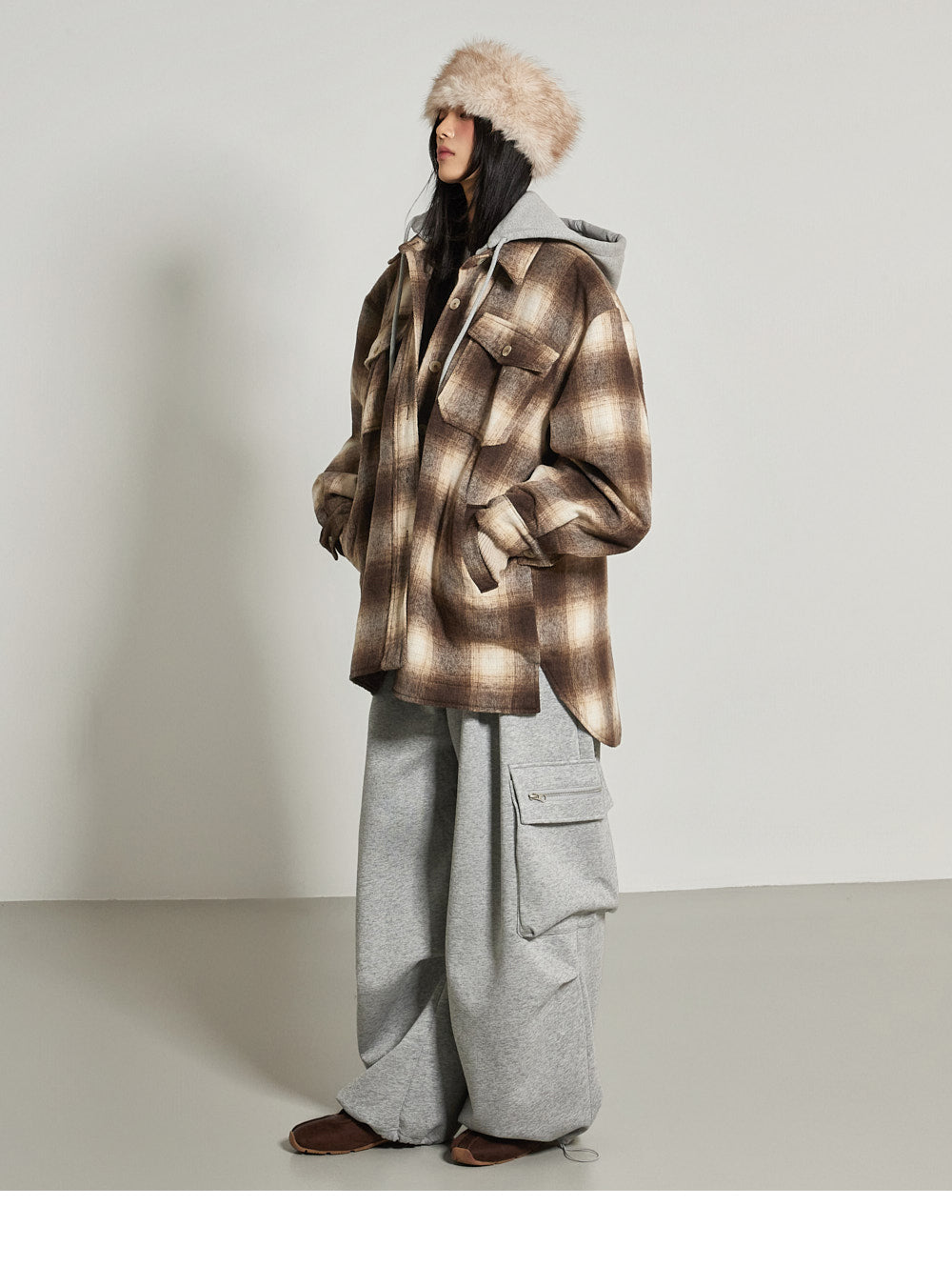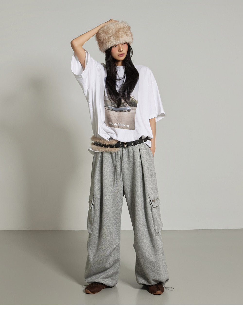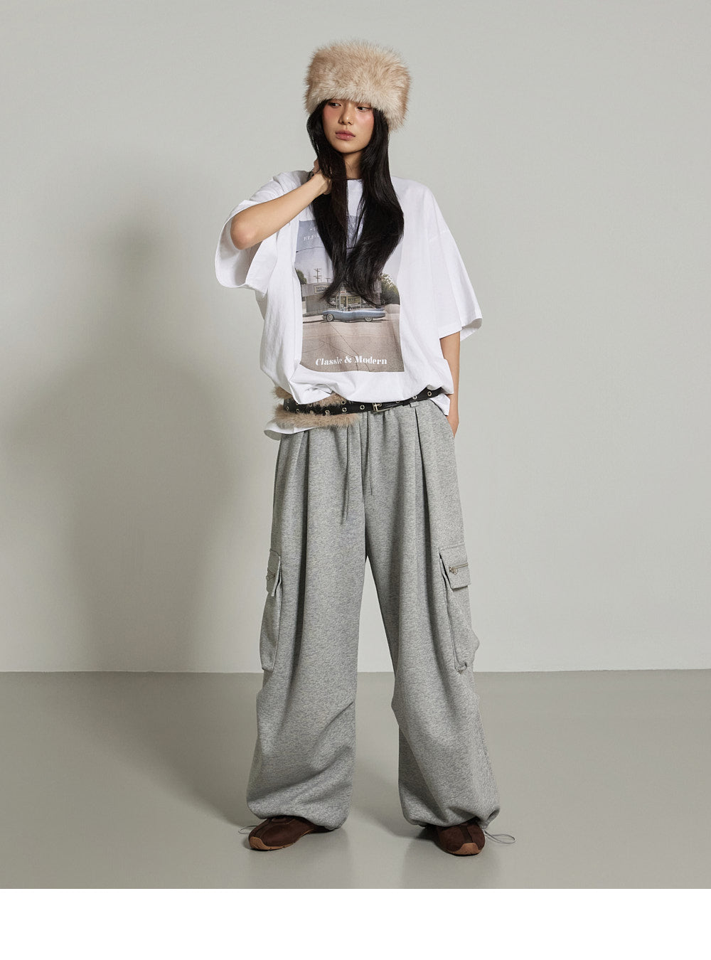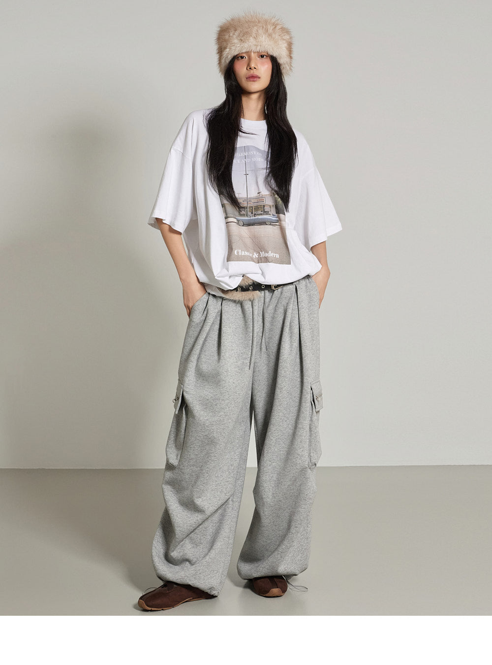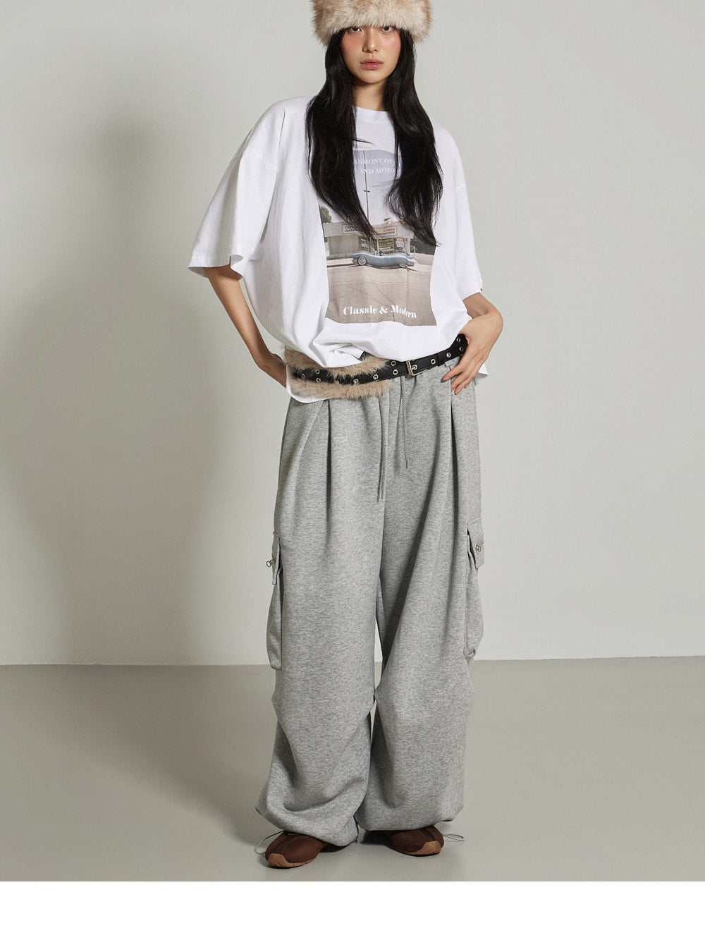 The wide-fit silhouette features cargo pockets and front pin tuck details.