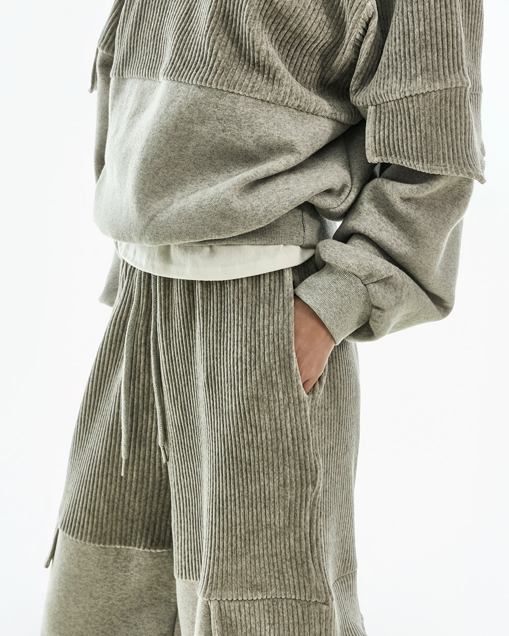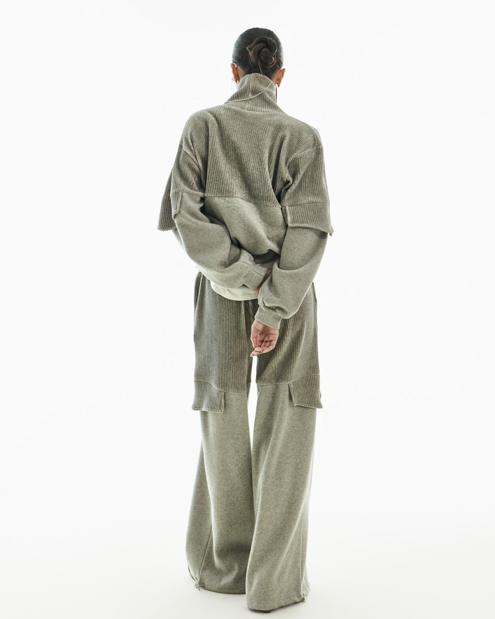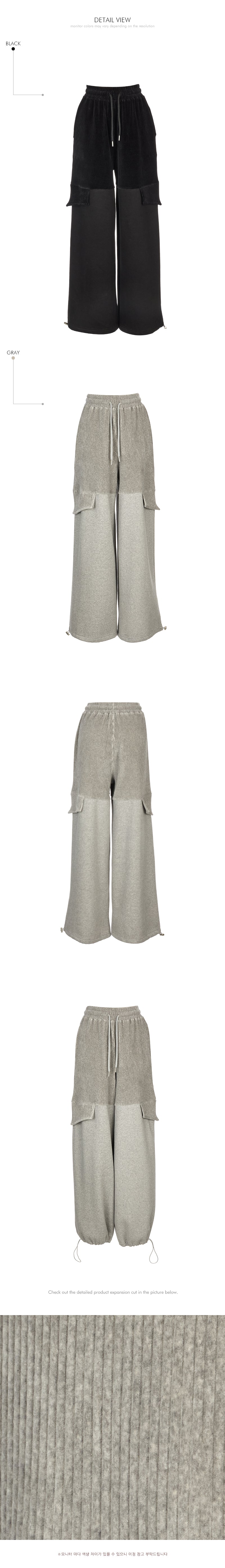 The wide silhouette and corduroy color blocking details