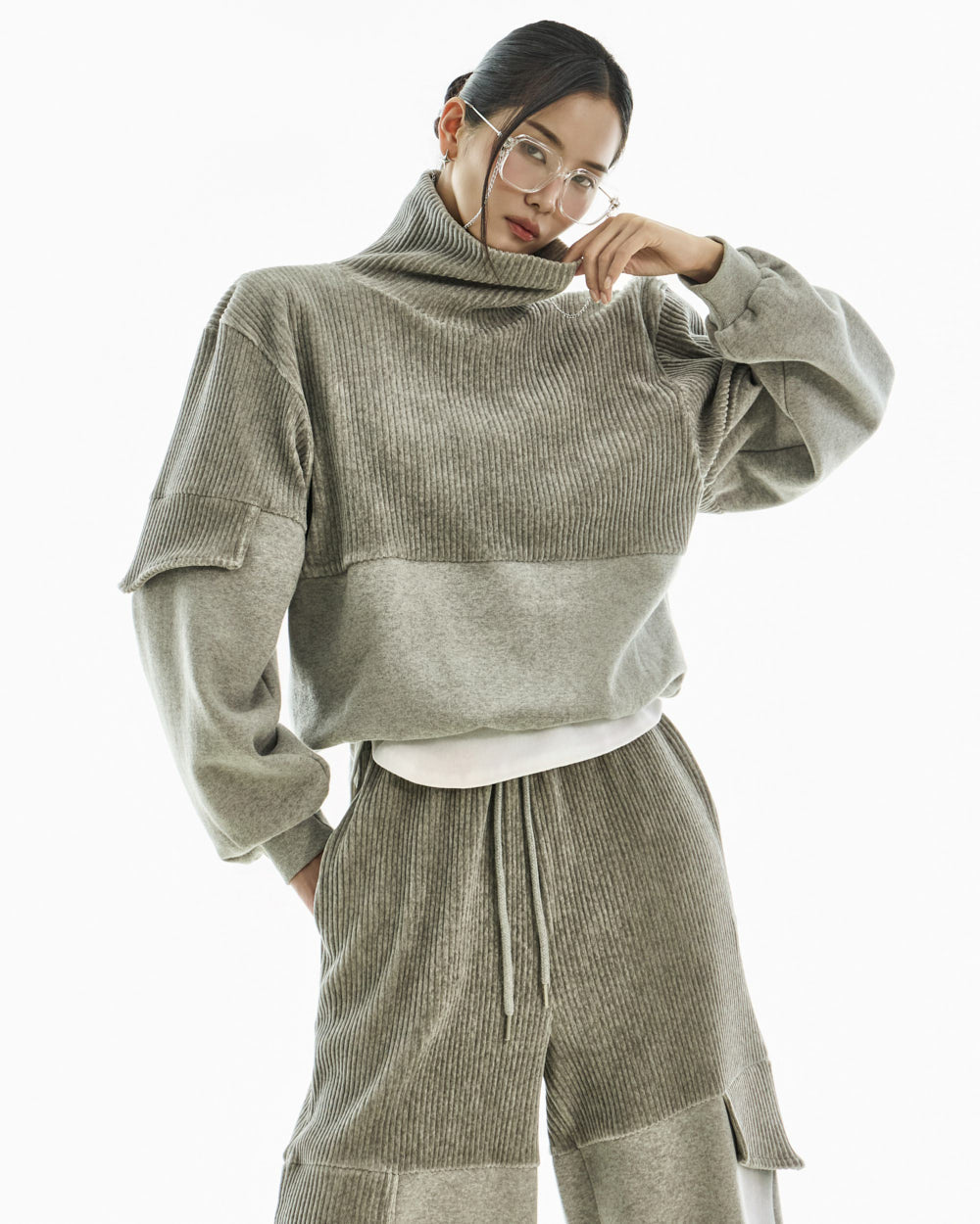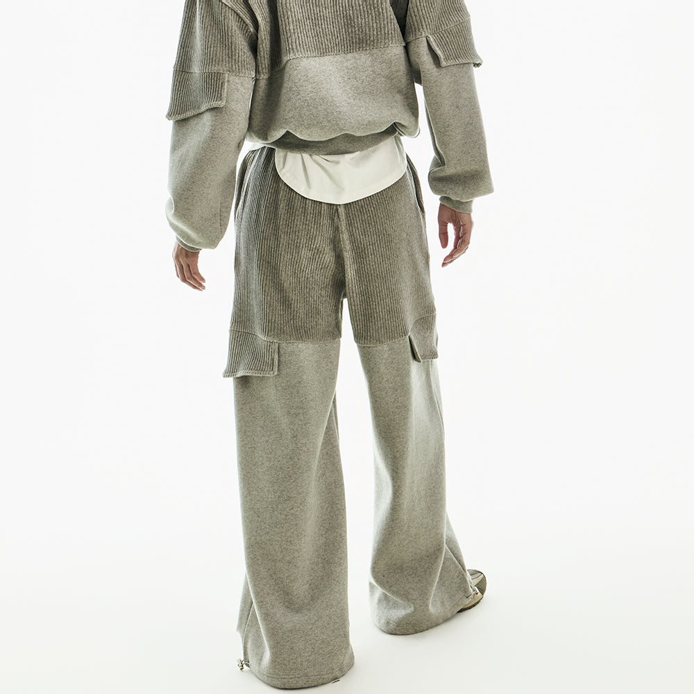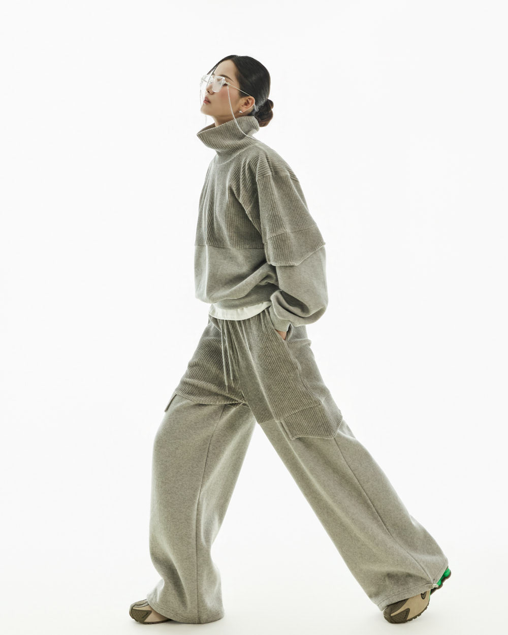 The wide silhouette and corduroy color blocking details