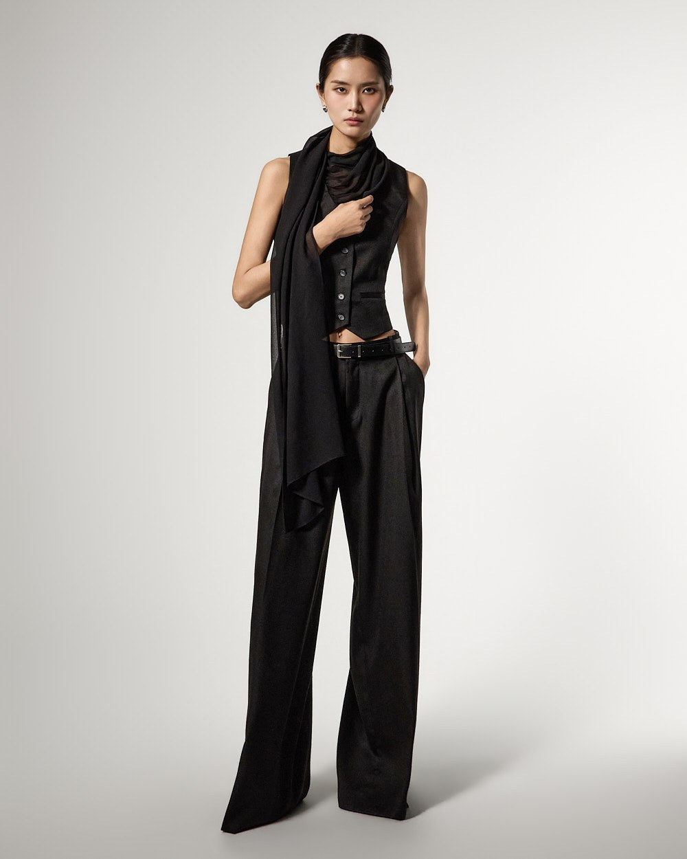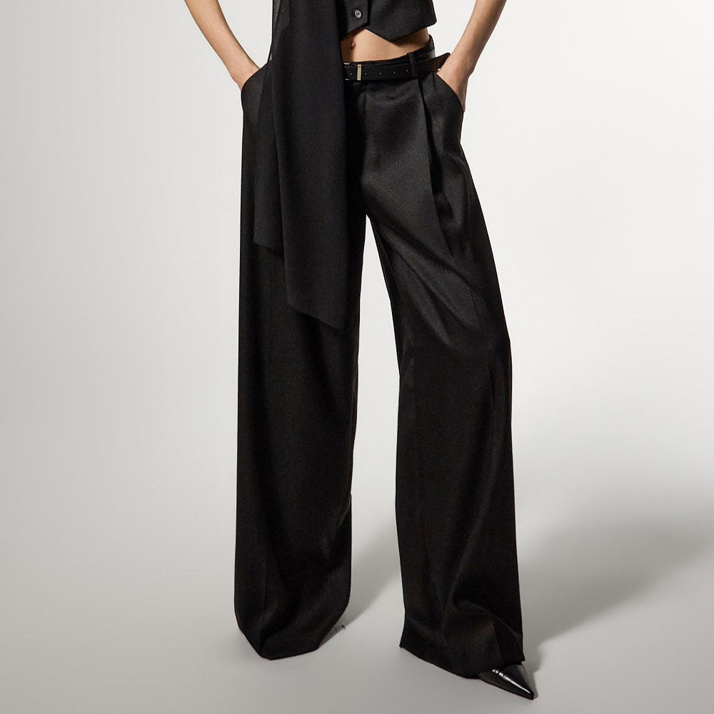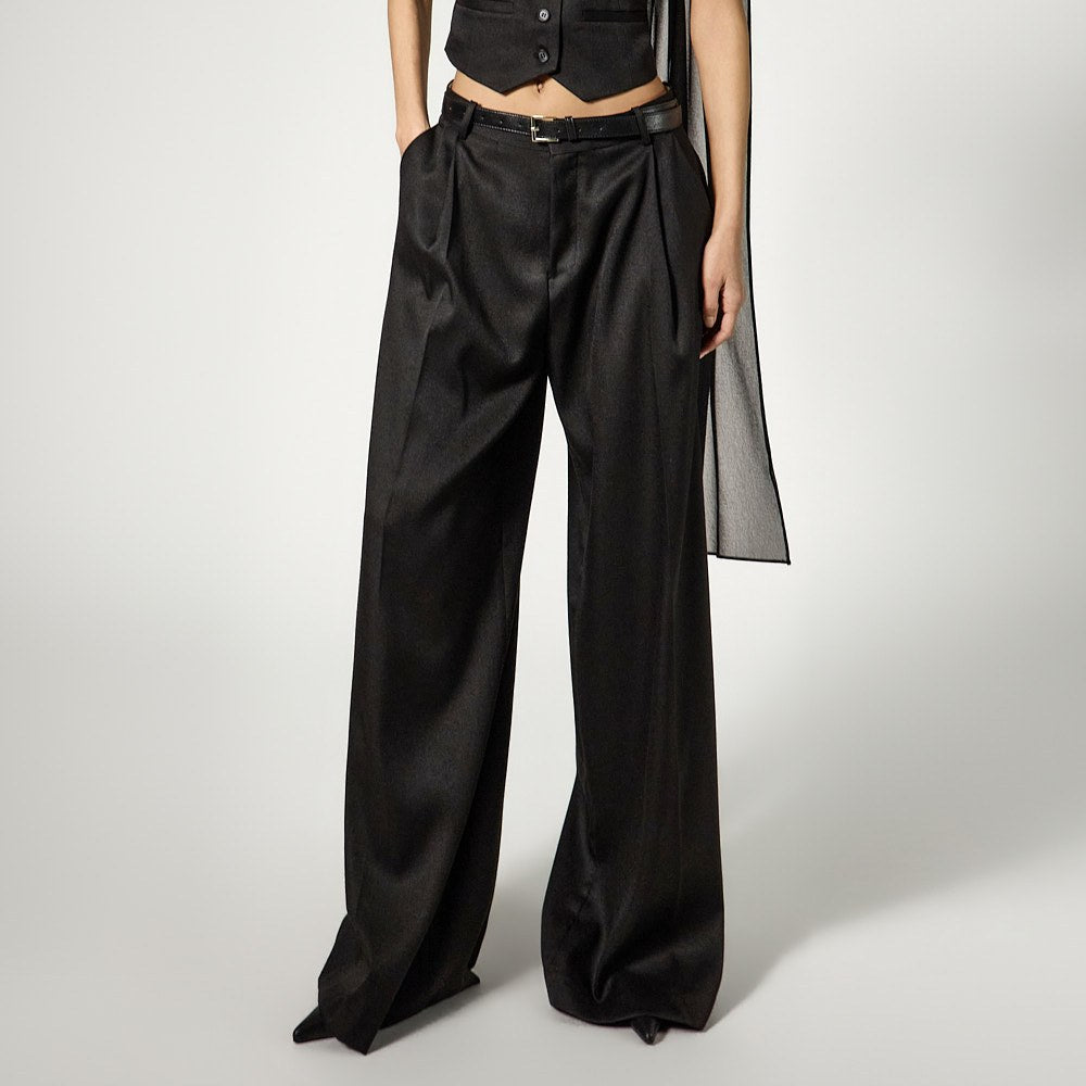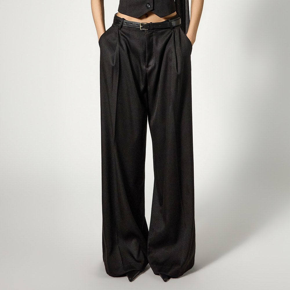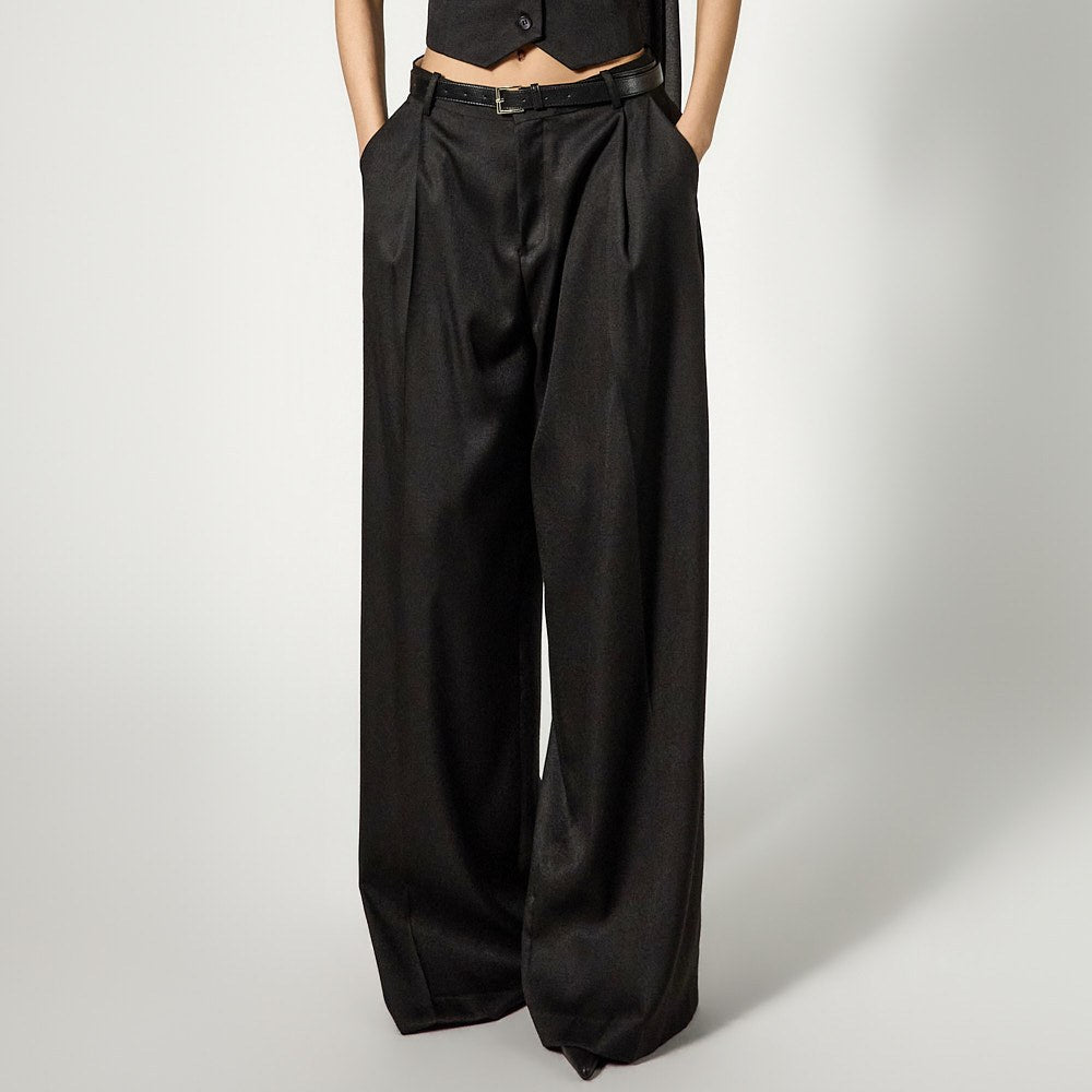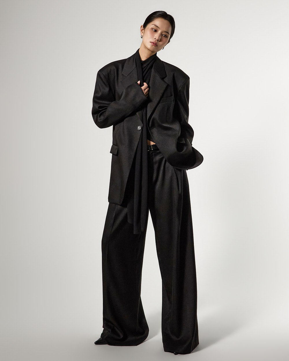 フロントピンタックディテールで立体的なシルエットを演出し、ワイドなストレートフィットで脚を長く見せる効果があります。