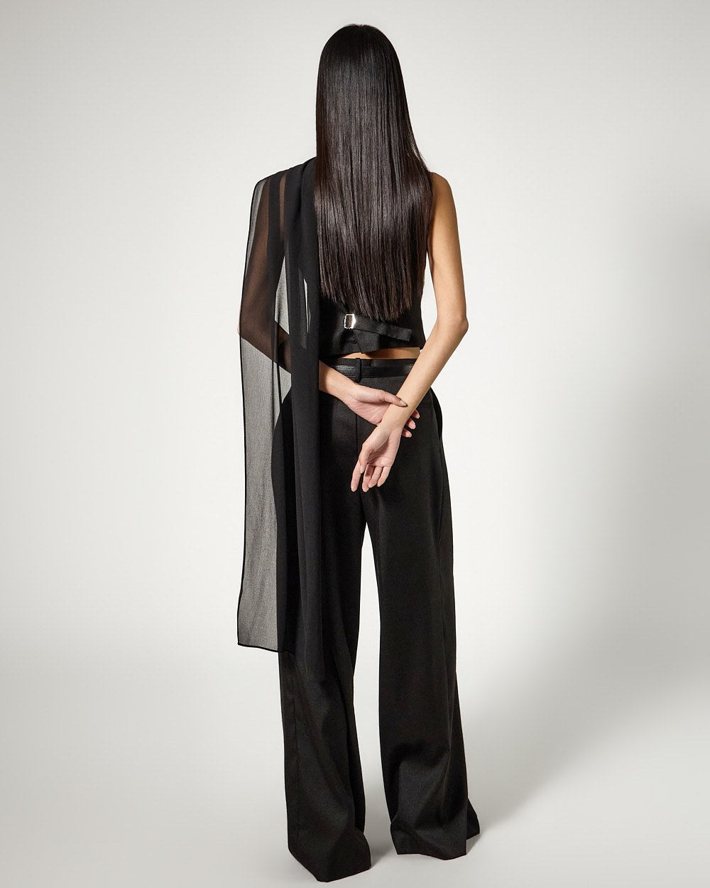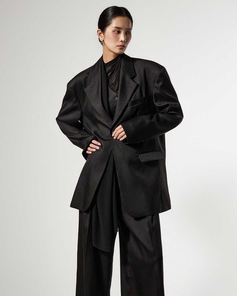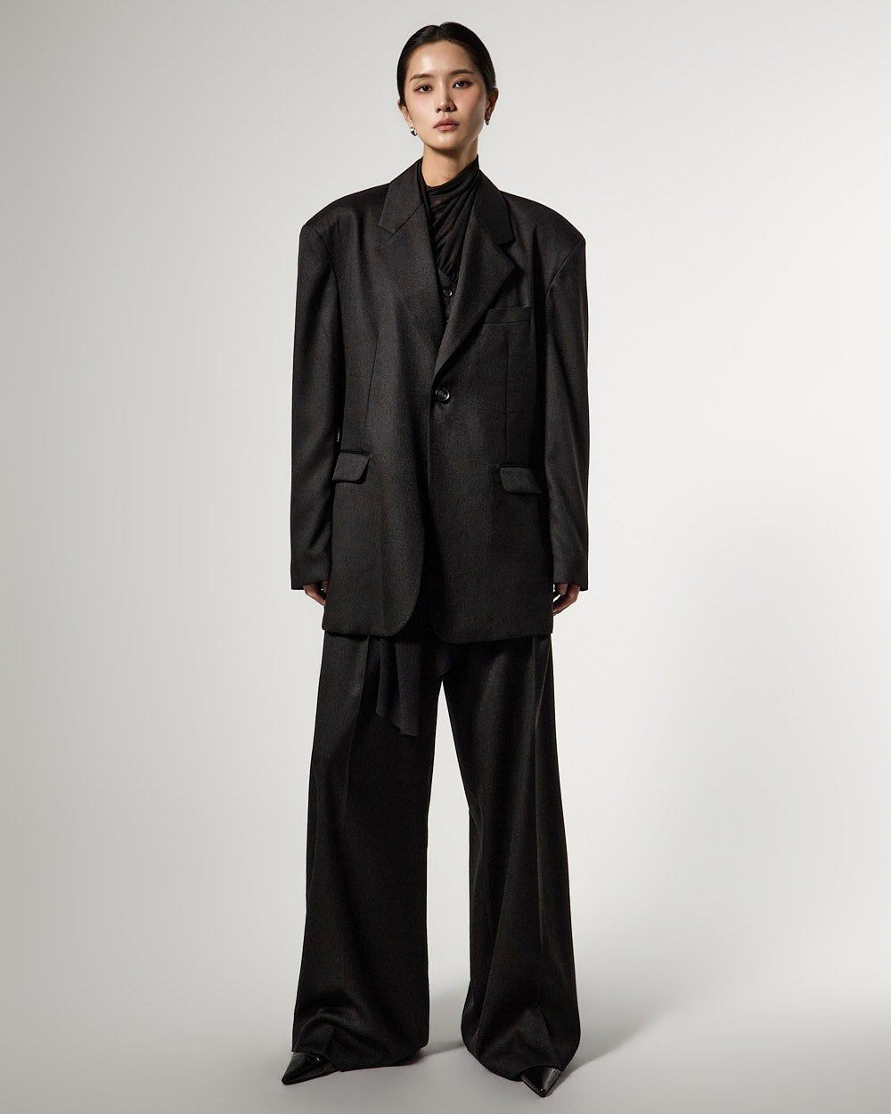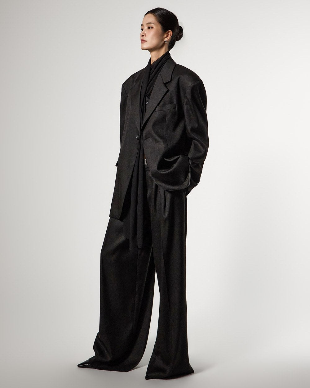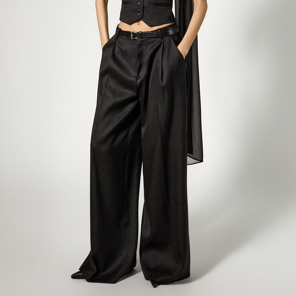フロントピンタックディテールで立体的なシルエットを演出し、ワイドなストレートフィットで脚を長く見せる効果があります。