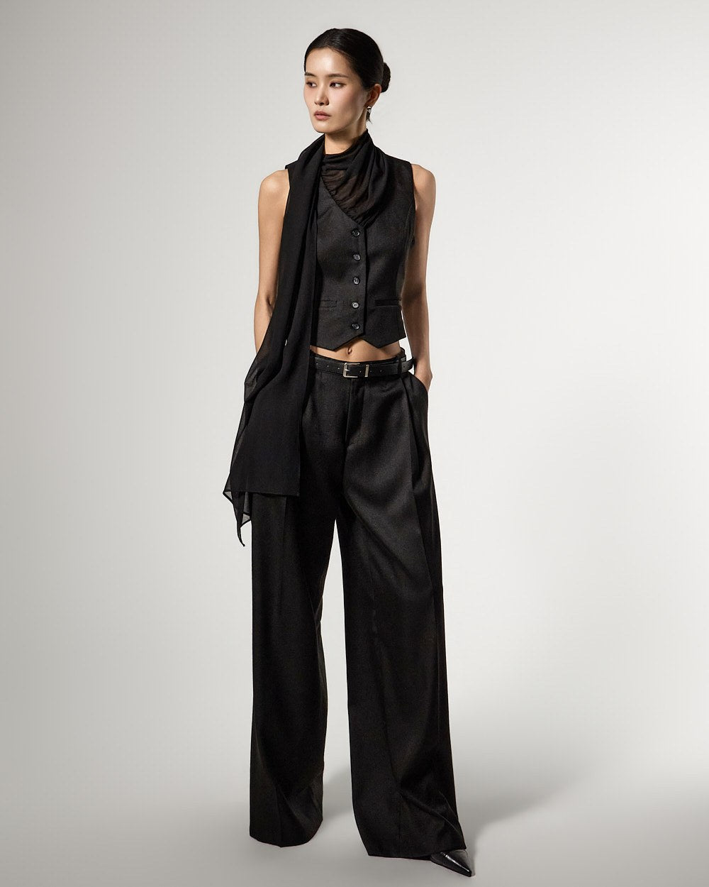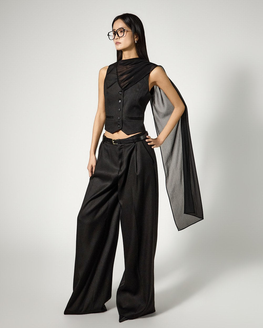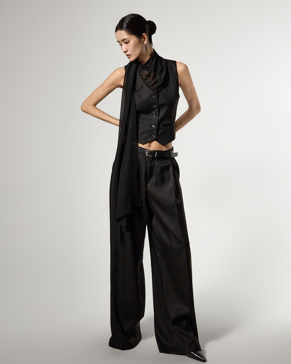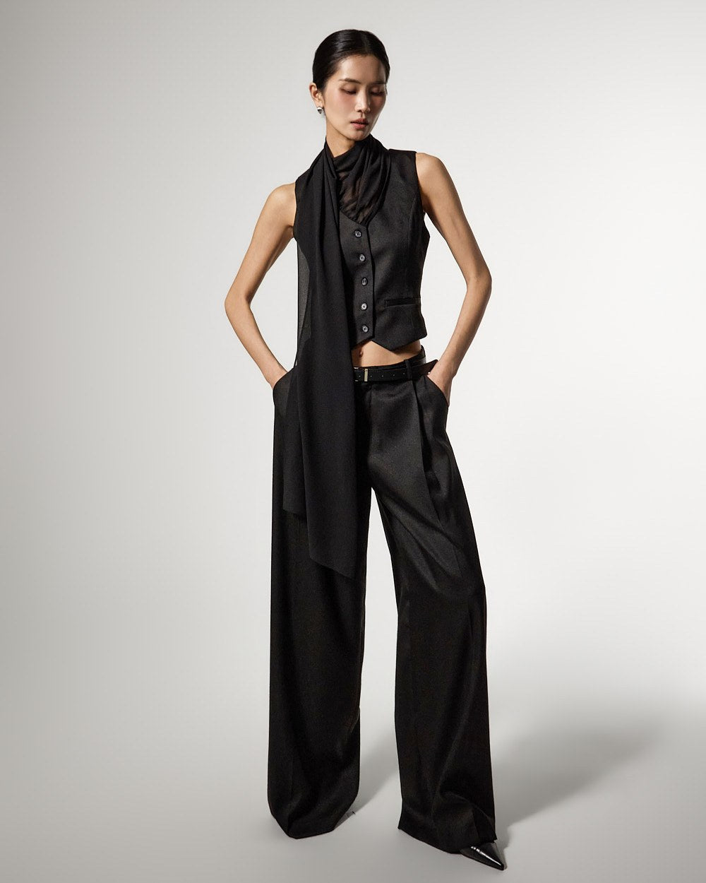 様々なトップスと自然にマッチし、デイリーウェアとして活用しやすく、セットアップとして付属のジャケットやベストとコーディネートすると、洗練されたスタイルを完成させる素晴らしいアイテムです。