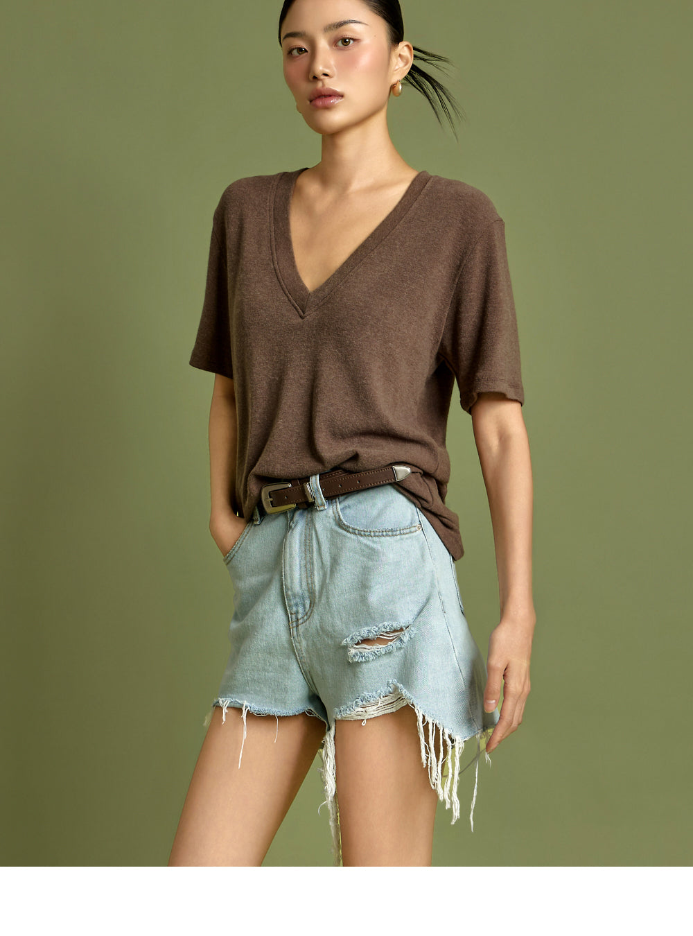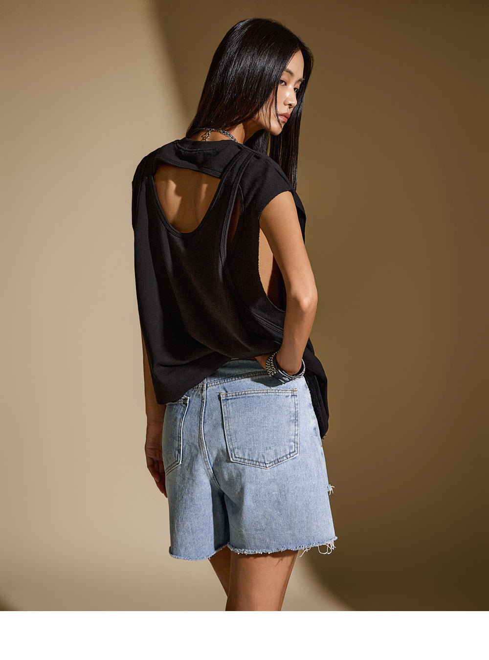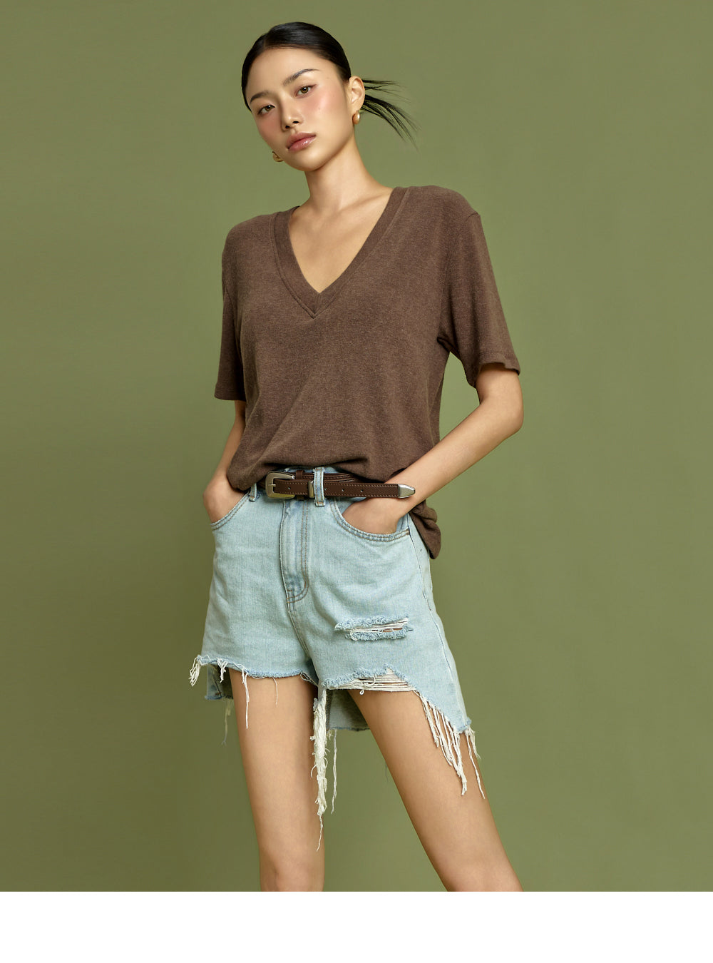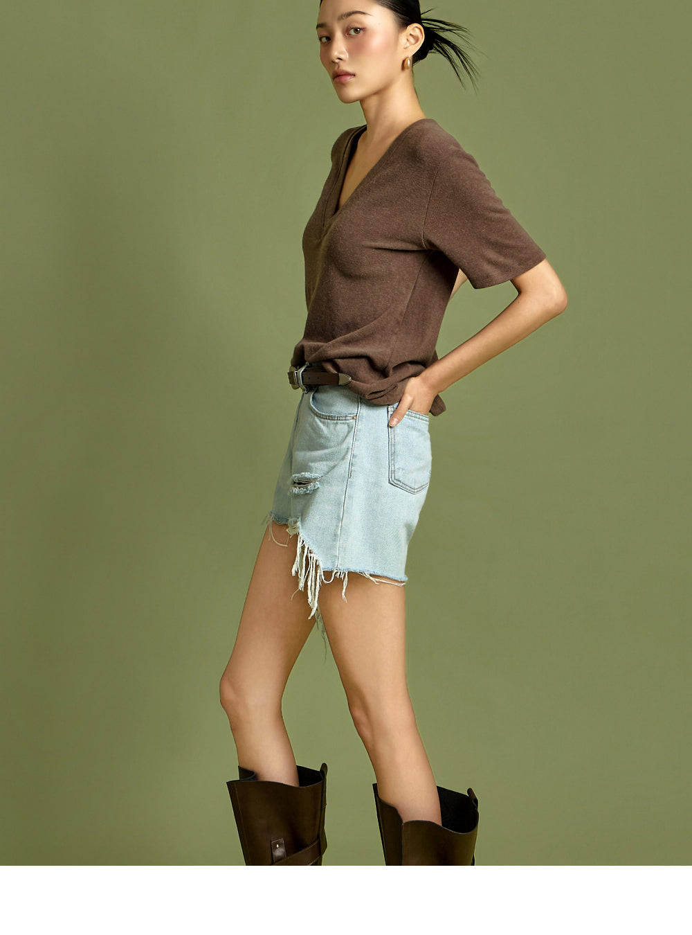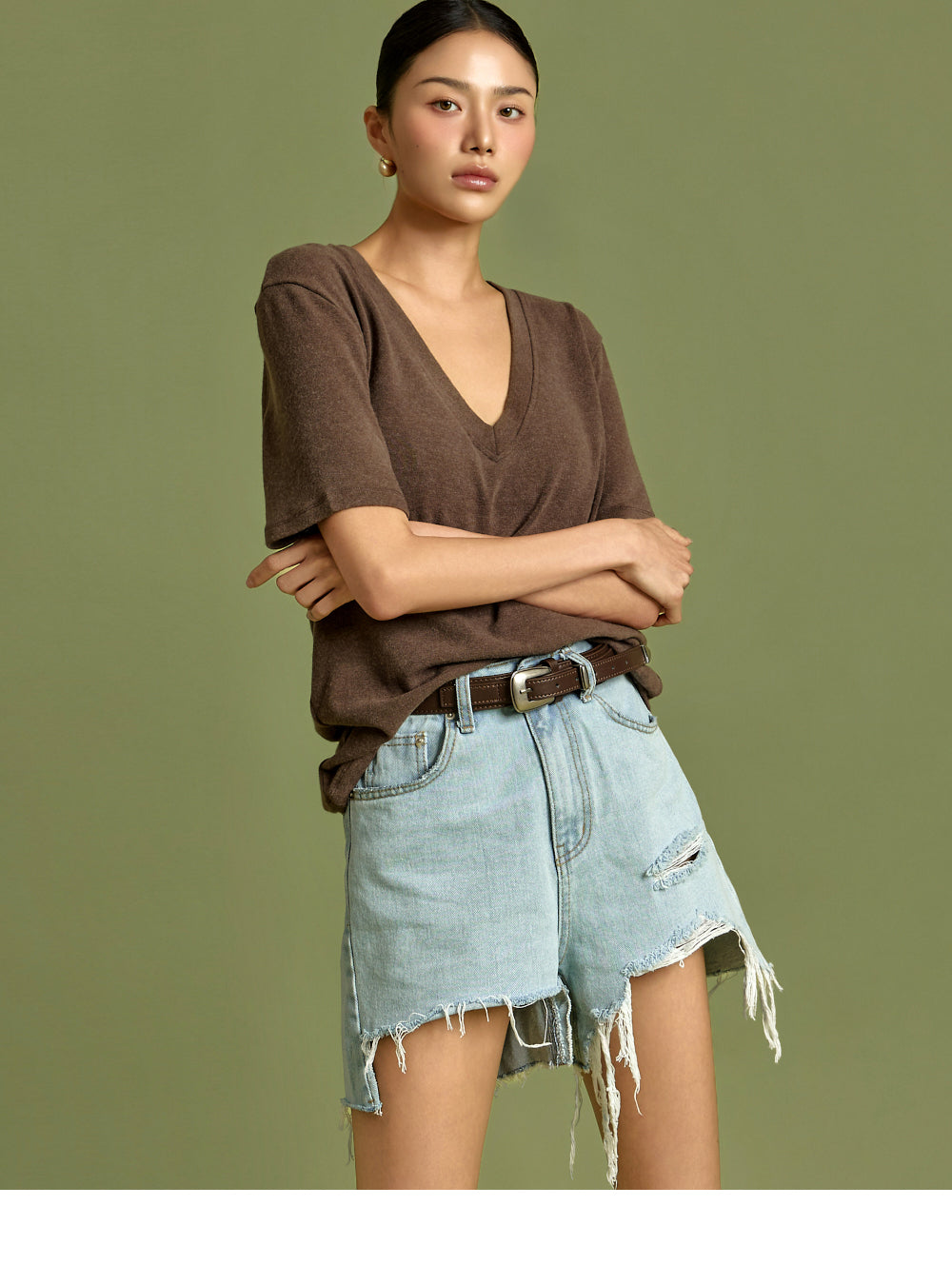 ダメージ加工のディテールがショートジーンズのカジュアルな雰囲気をプラスします。