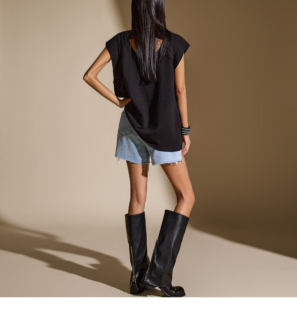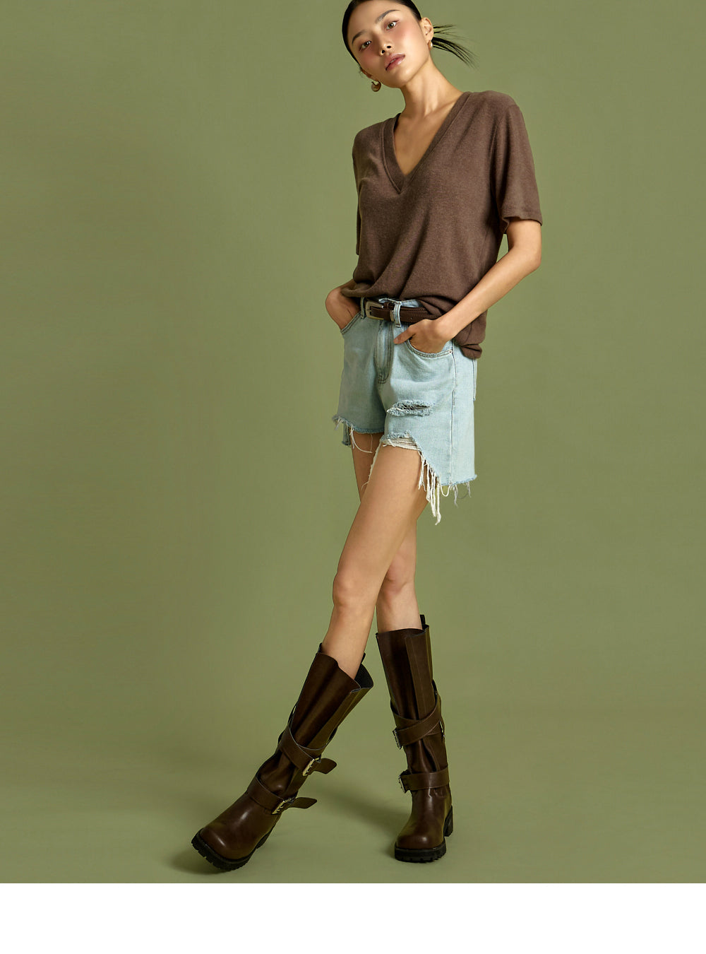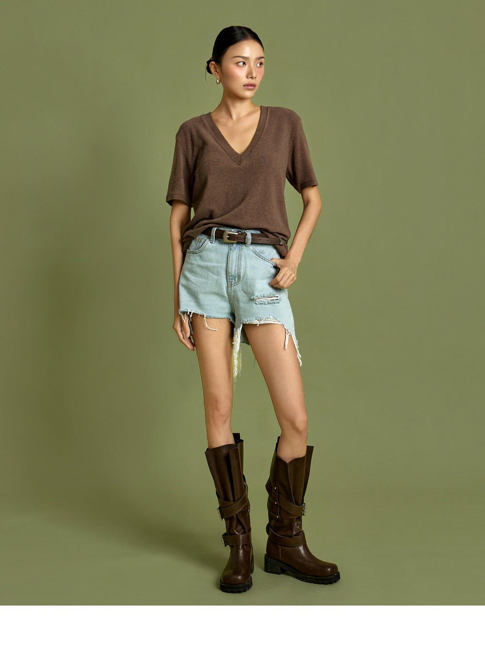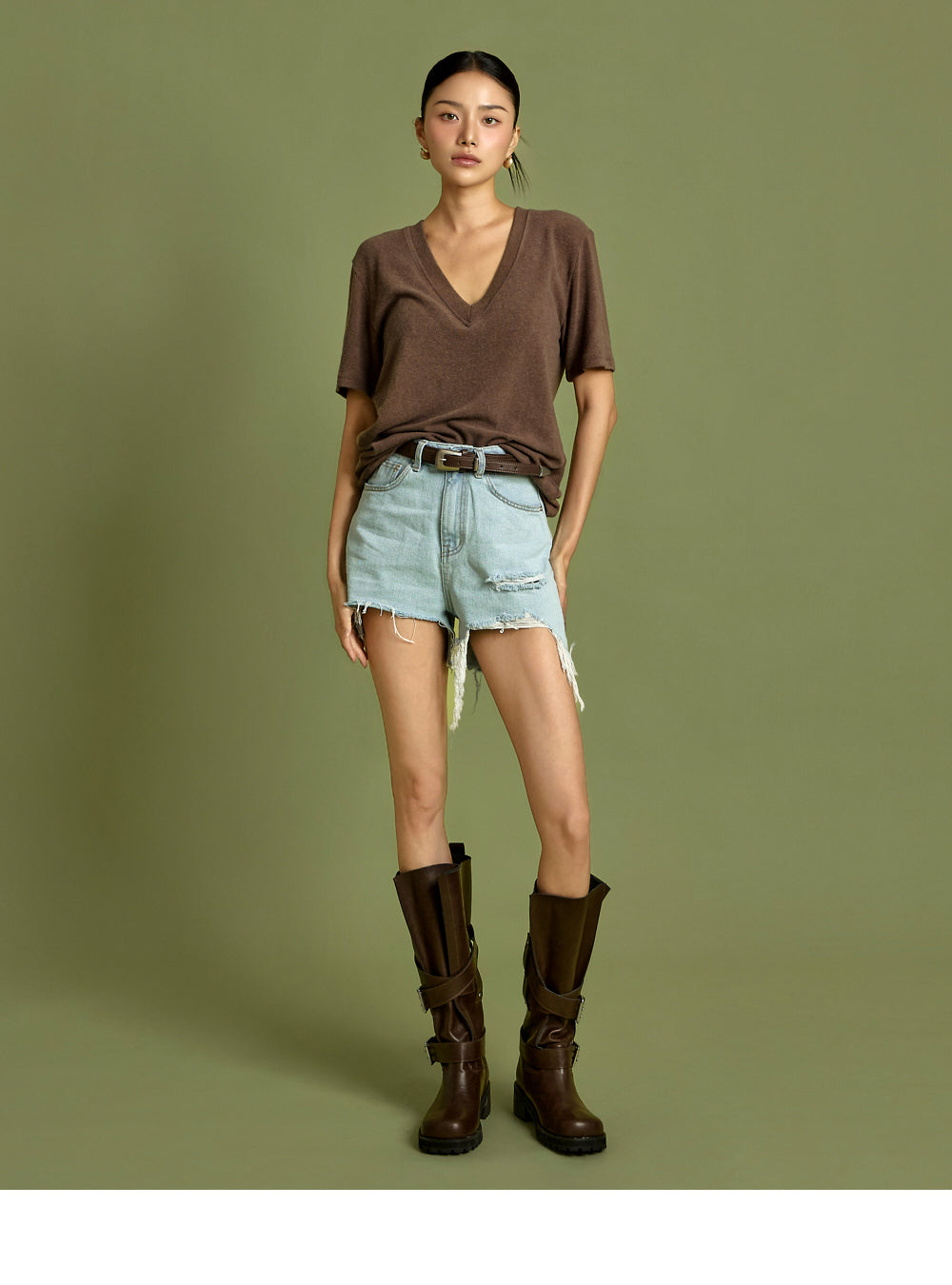 ダメージ加工のディテールがショートジーンズのカジュアルな雰囲気をプラスします。