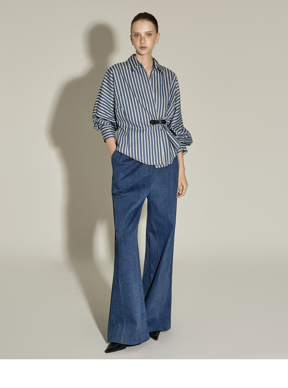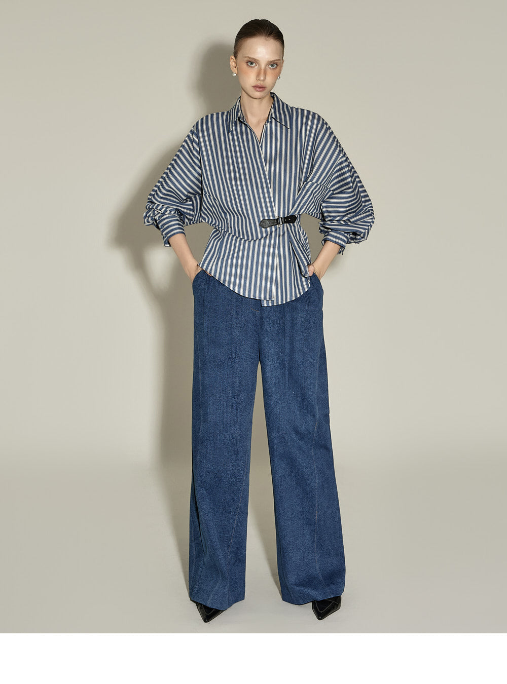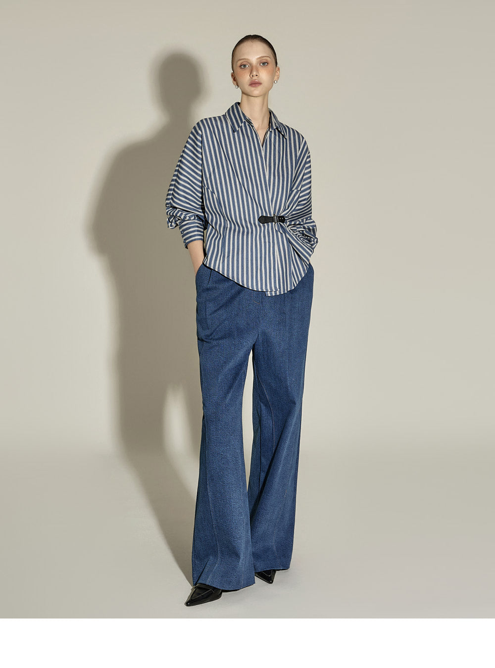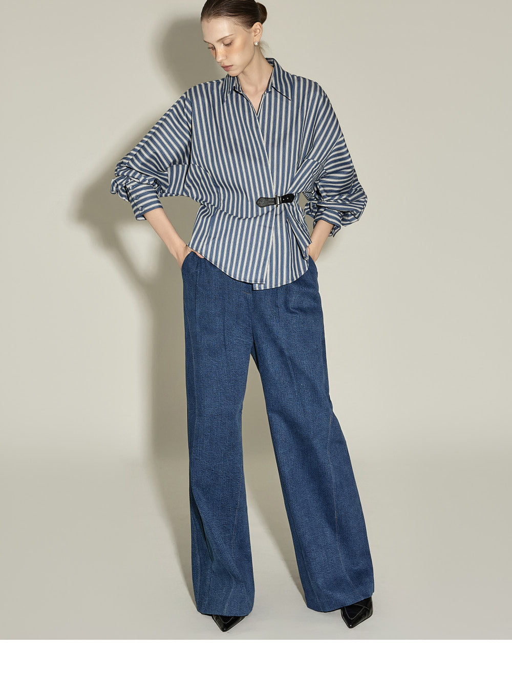 The pintuck details and wide silhouettecreate the illusion of straight, elongated legs,