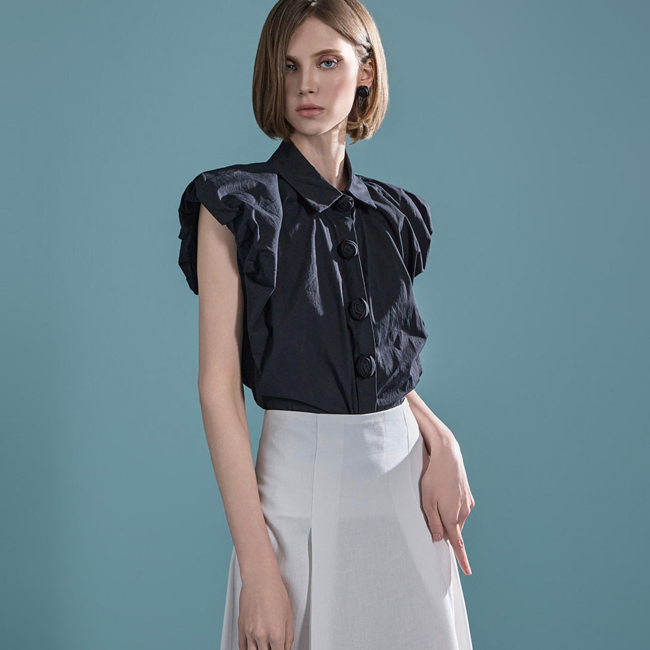 ローズボタンのディテールが愛らしい雰囲気を高め、