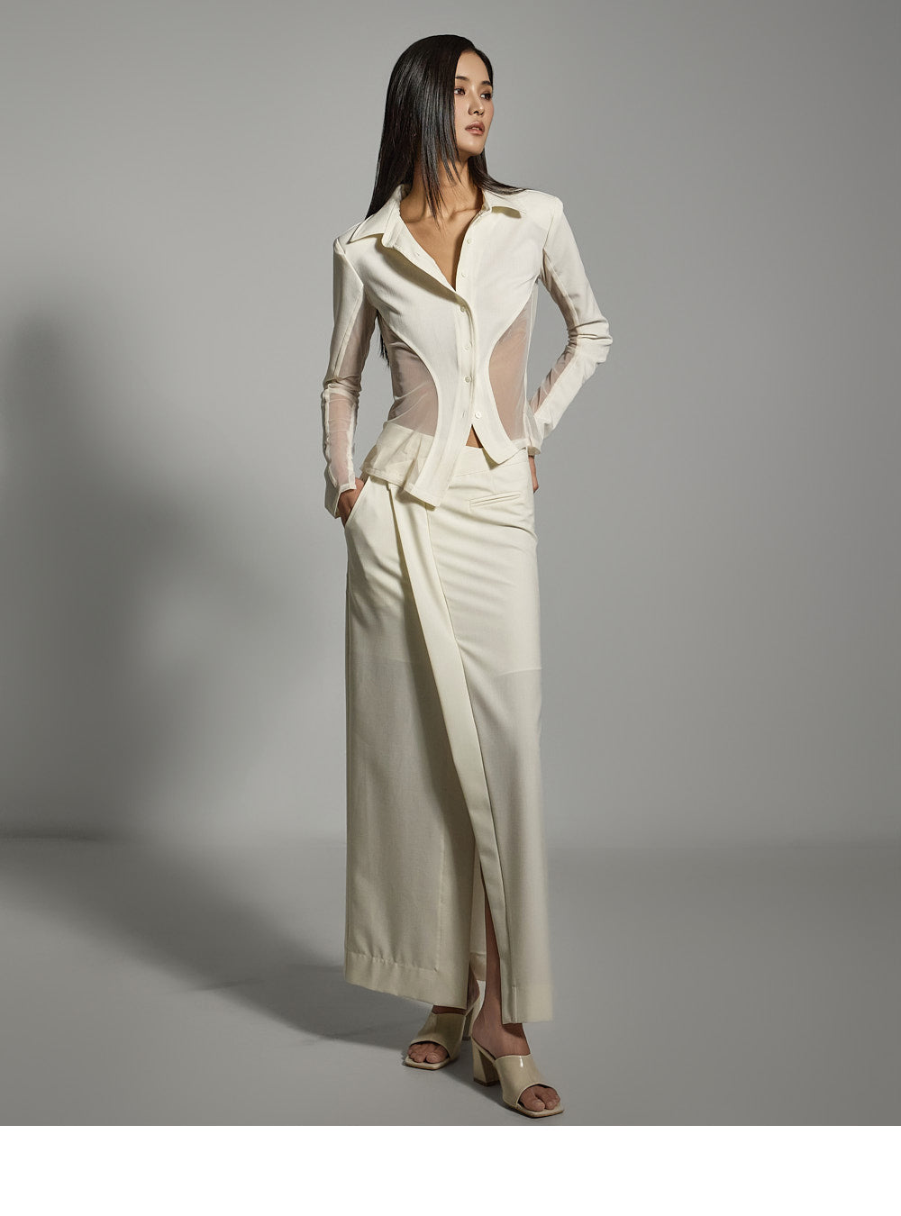スリムなシルエットとアシンメトリーな裾がスタイリッシュでモダンな印象を演出します。