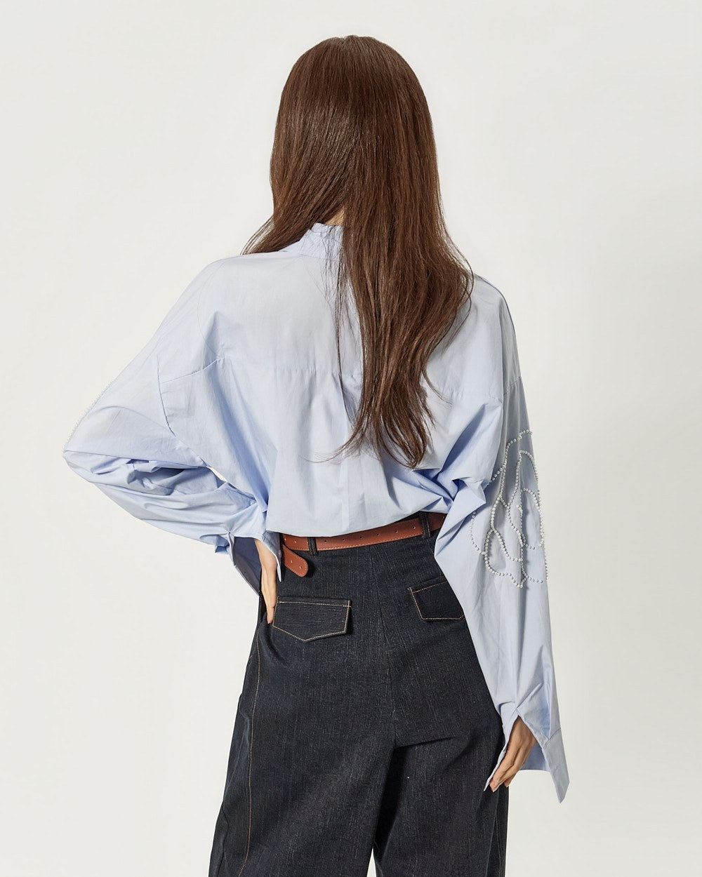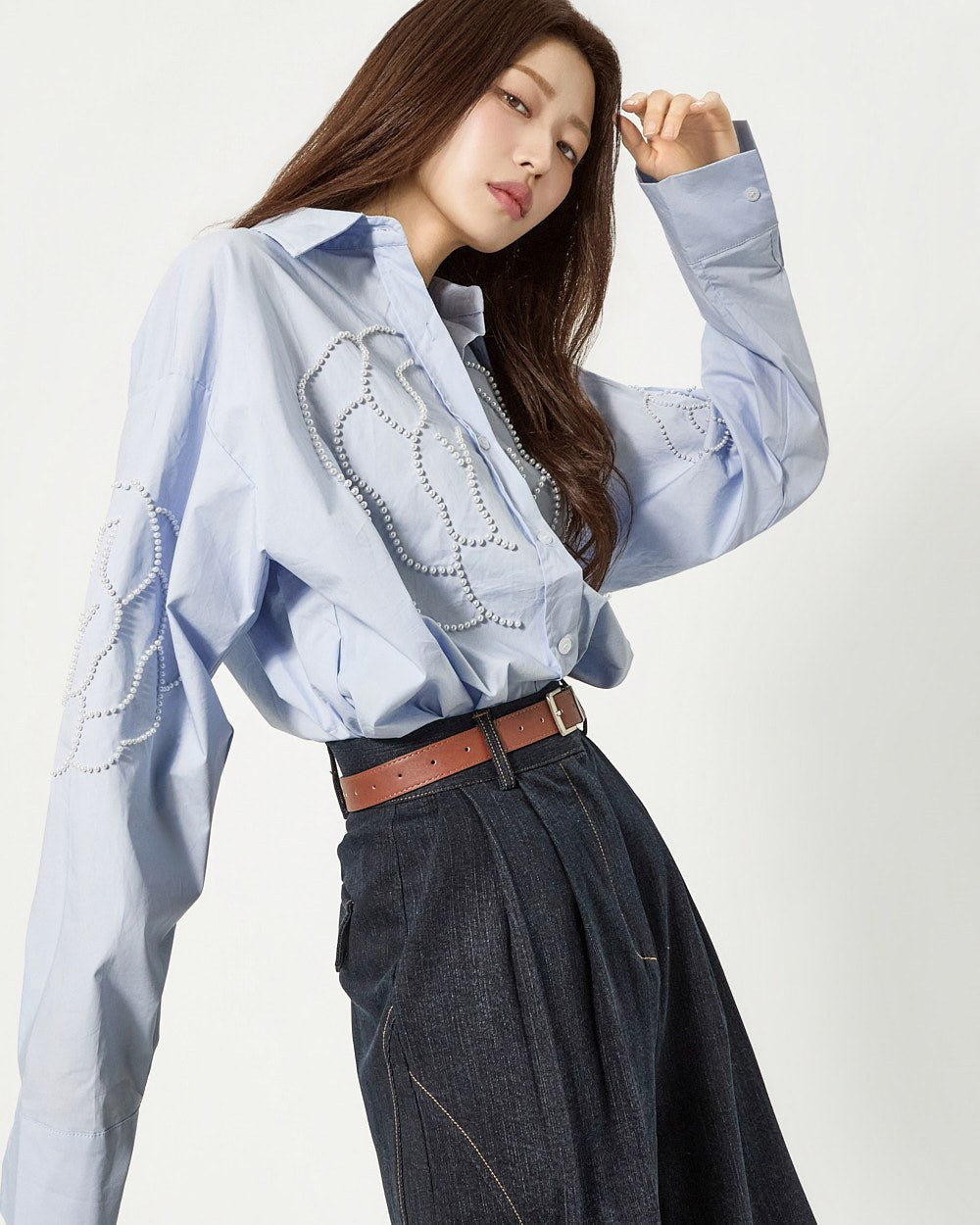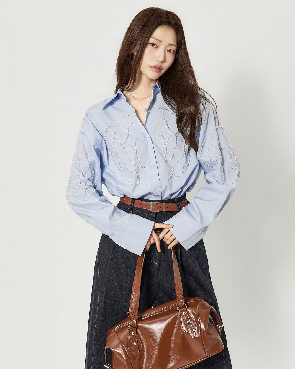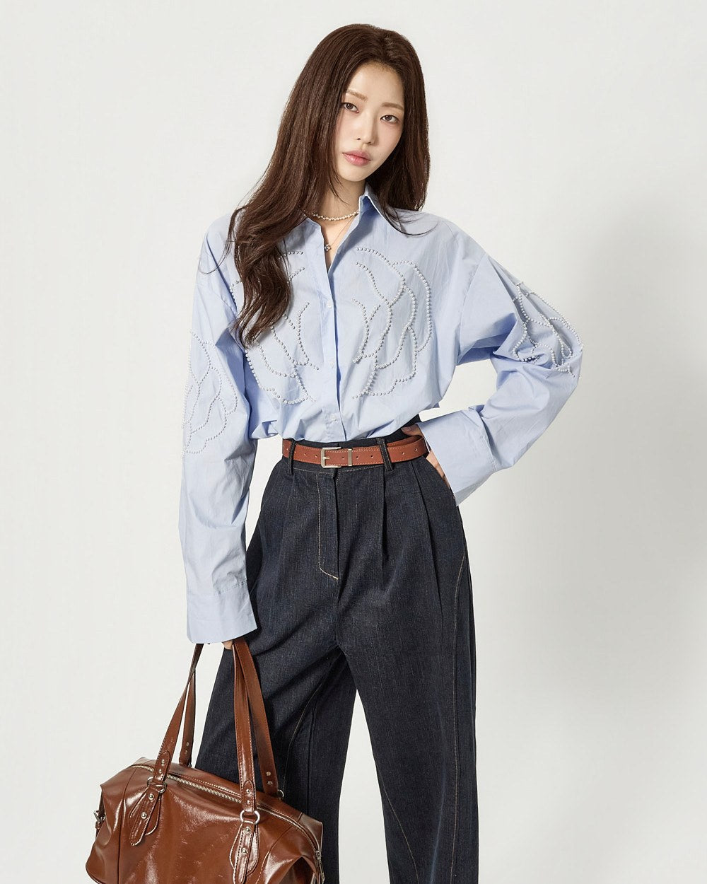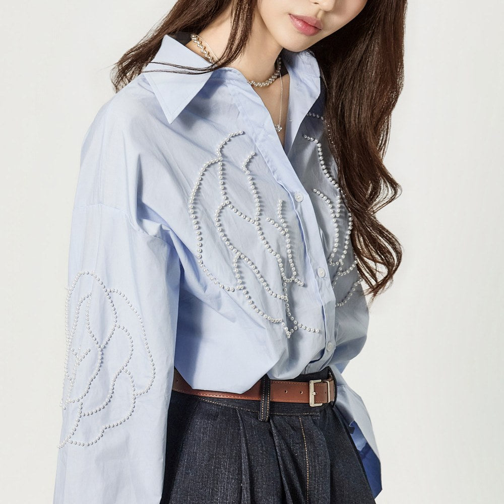 アイキャッチなパールローズのディテールが特徴的なシャツです。