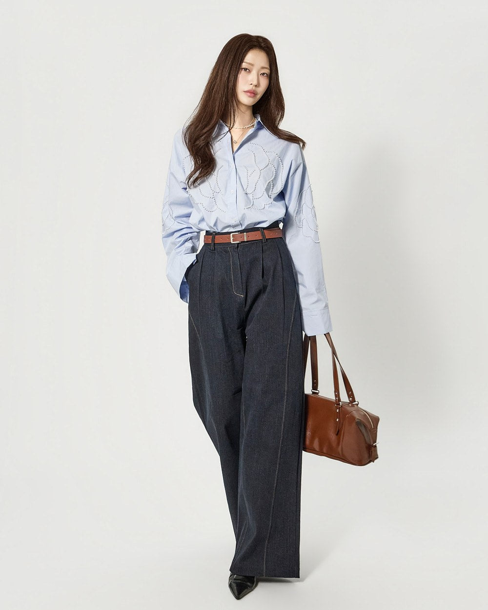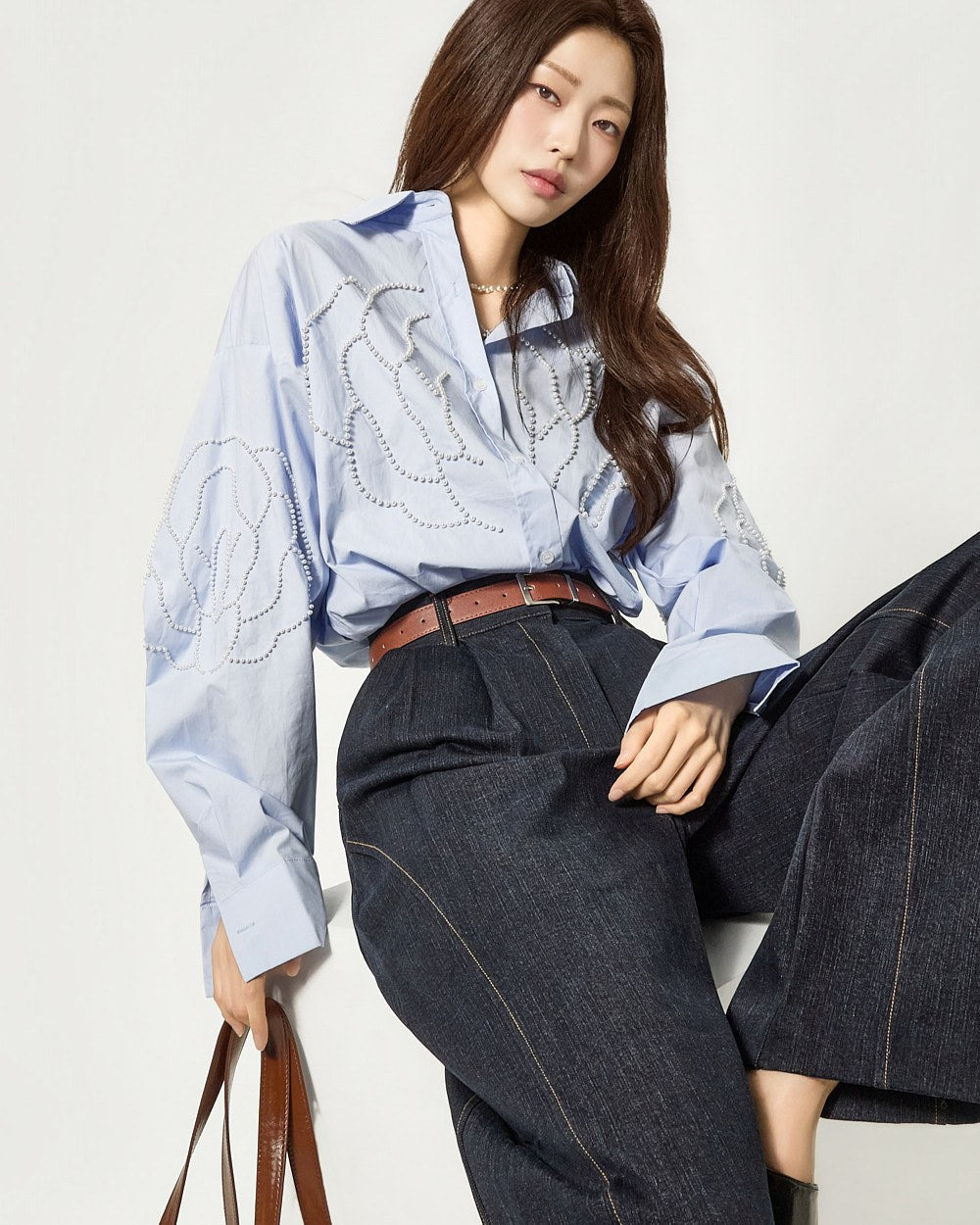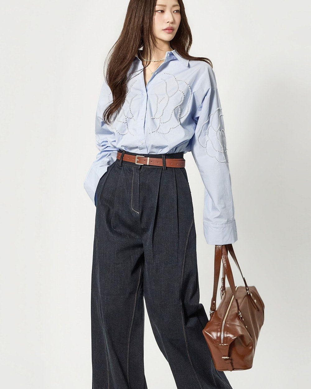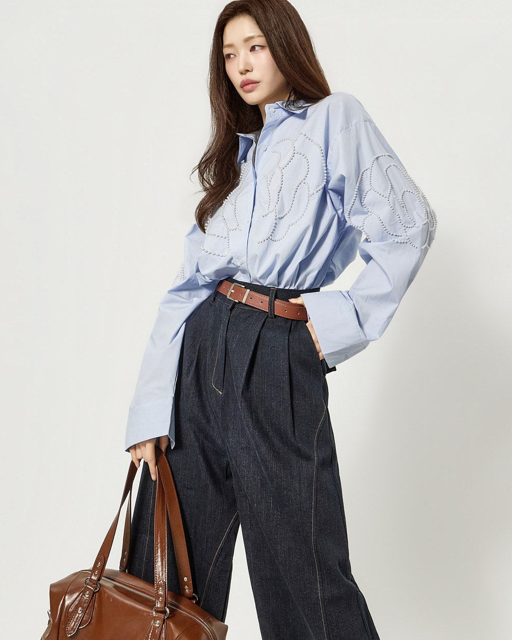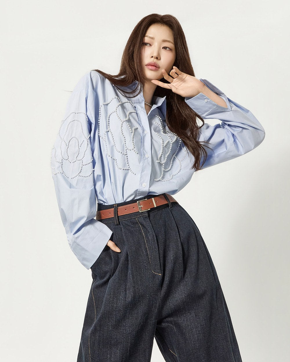 アイキャッチなパールローズのディテールが特徴的なシャツです。