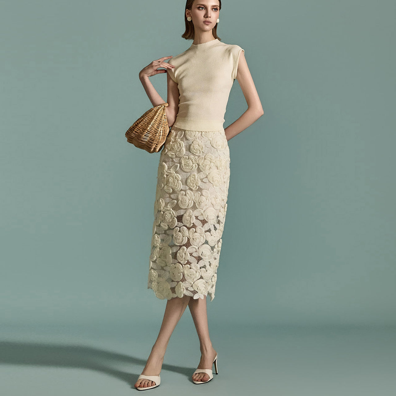 透け感のあるローズ柄がスタイリングに女性らしさをプラスします。