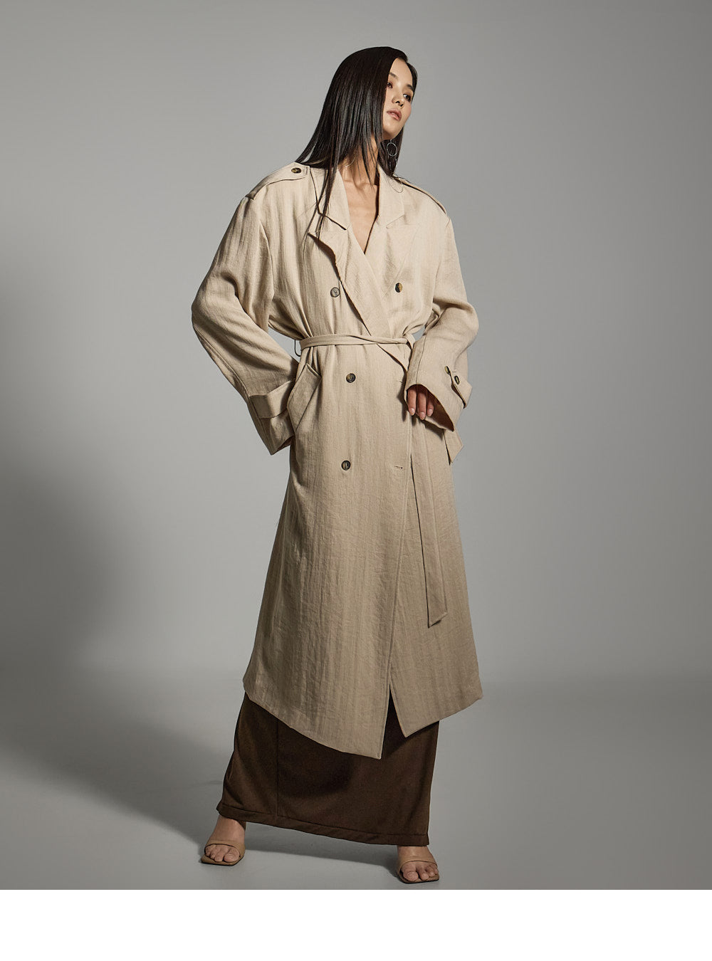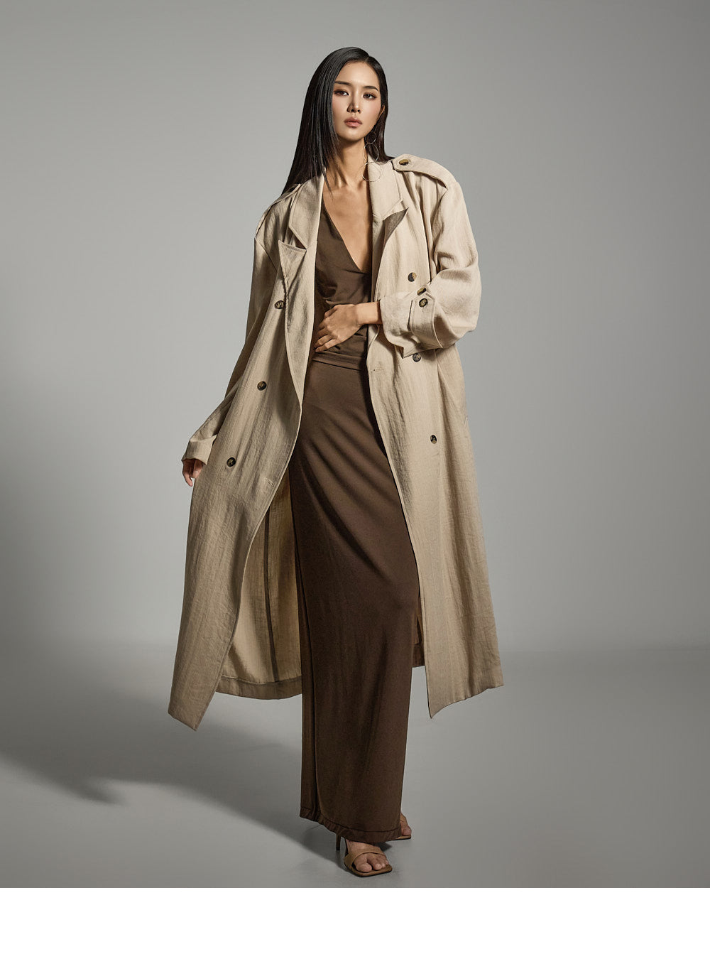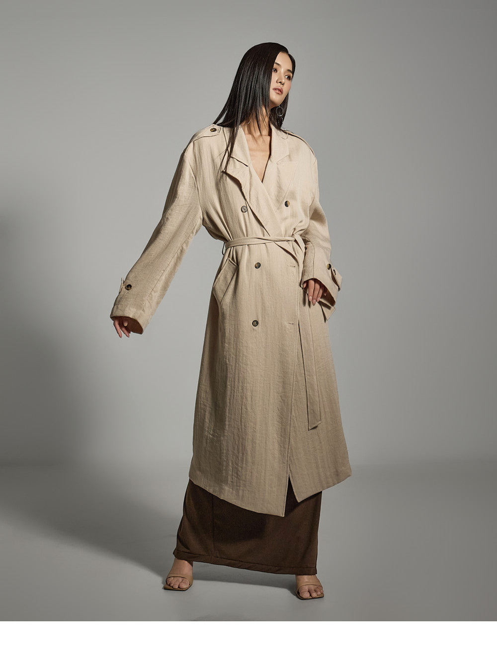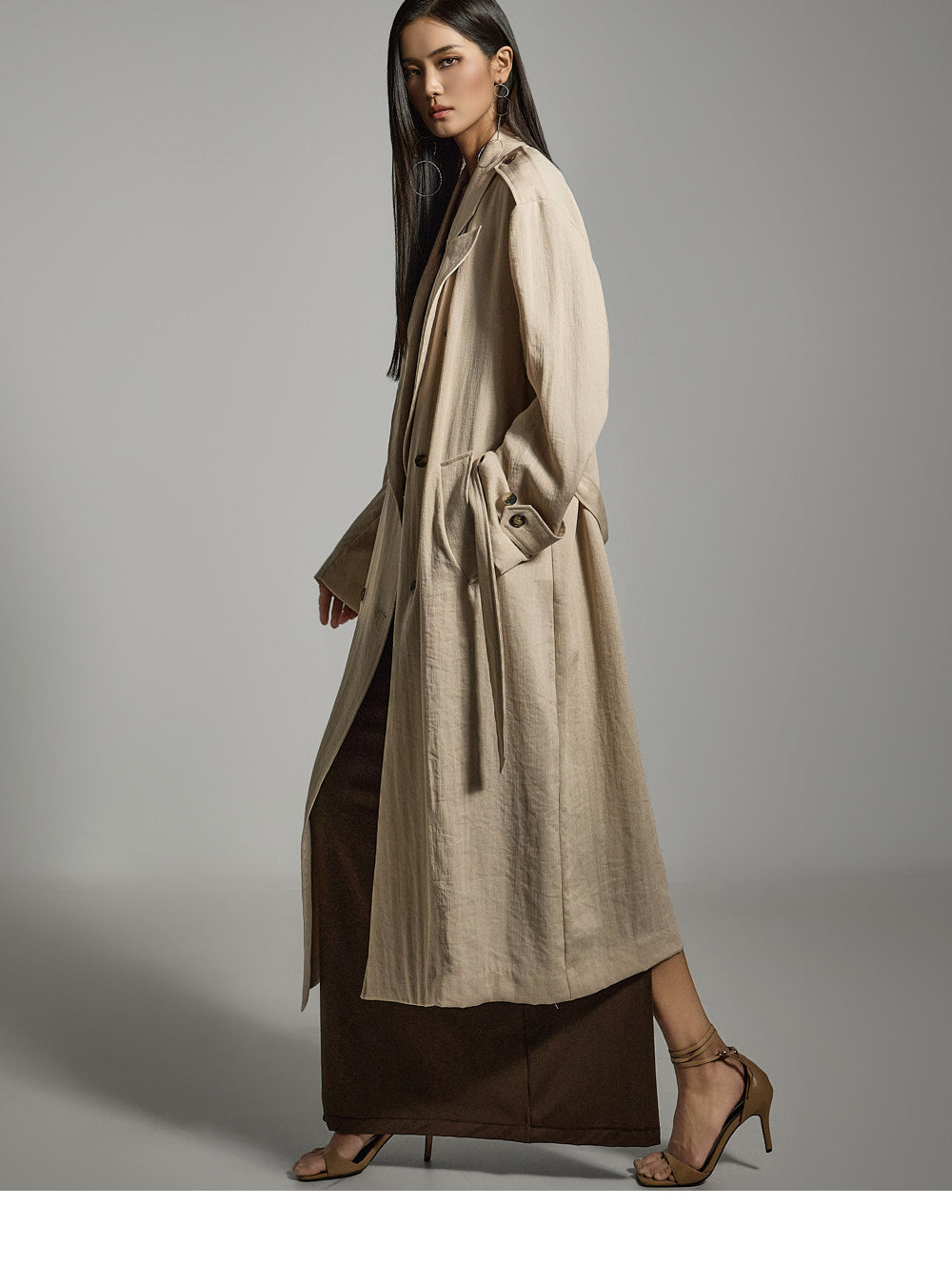 Hラインシルエットと長めの丈が、すっきりとしたスリムラインを演出します。